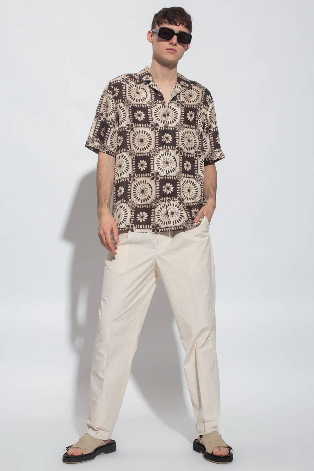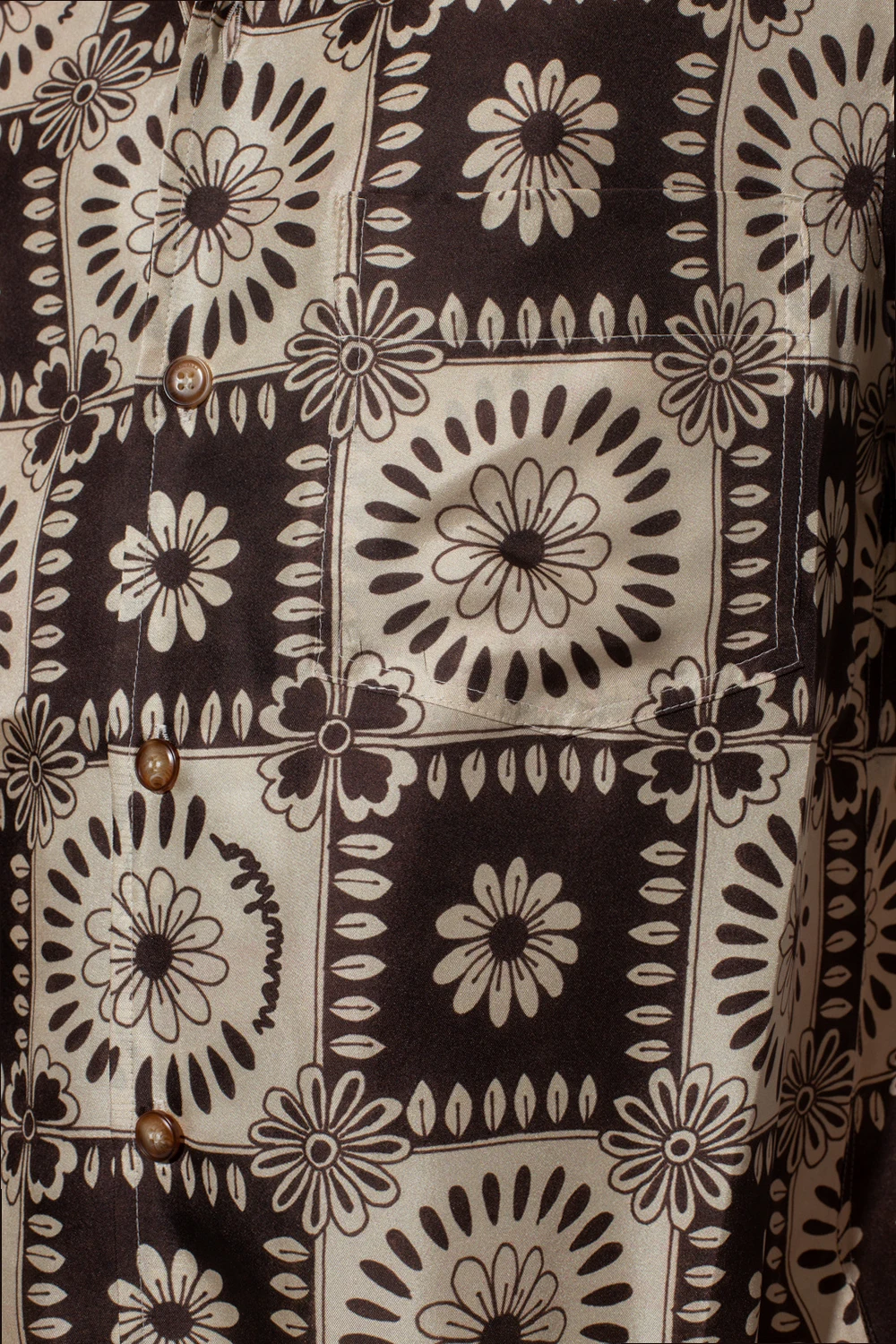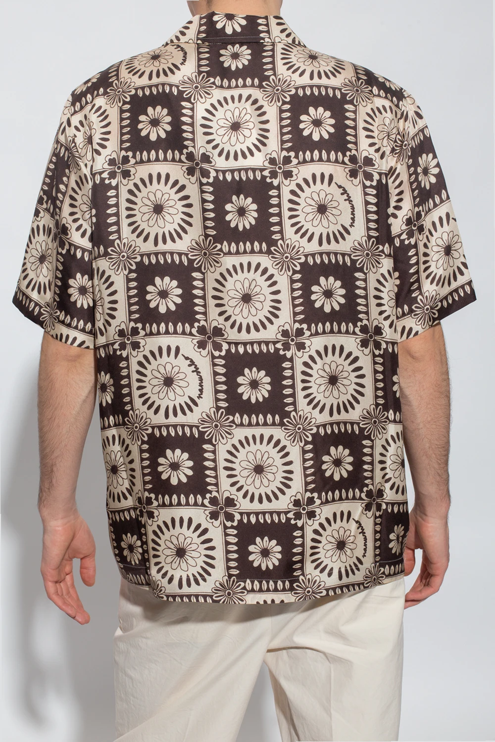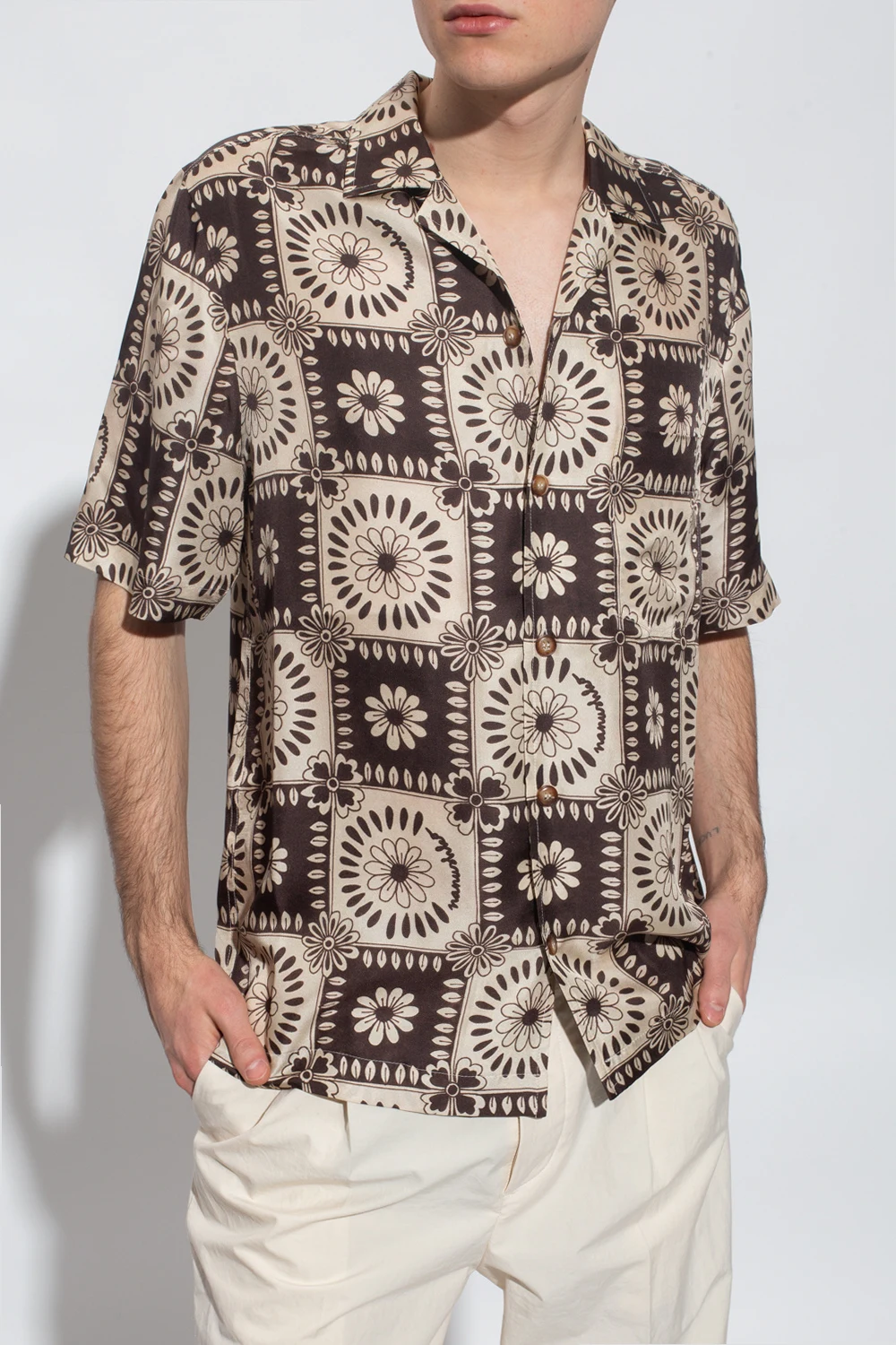 Kremowo-brązowa koszula z kołnierzem, model 'Bodil' Nanushka. Wykonana z jedwabiu. Zapinana na guziki. Ozdobiona wzorem z motywem kwiatowym. Wsuwana kieszeń. Krótkie rękawy.