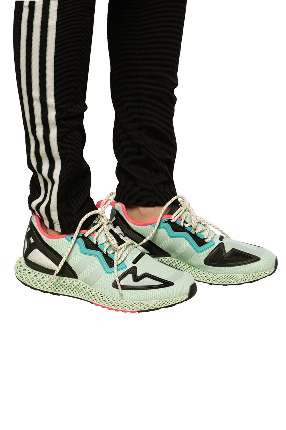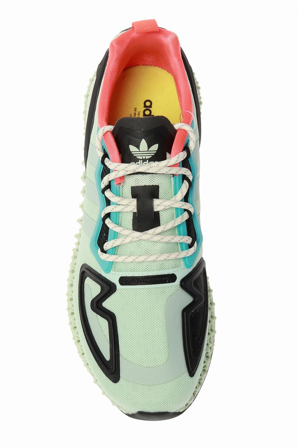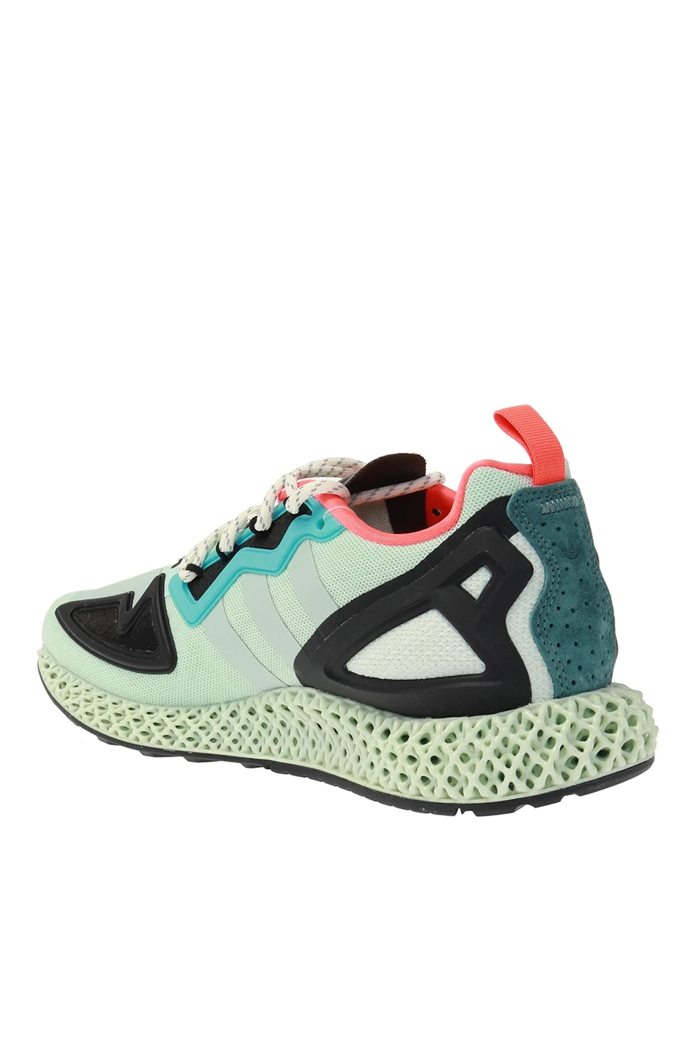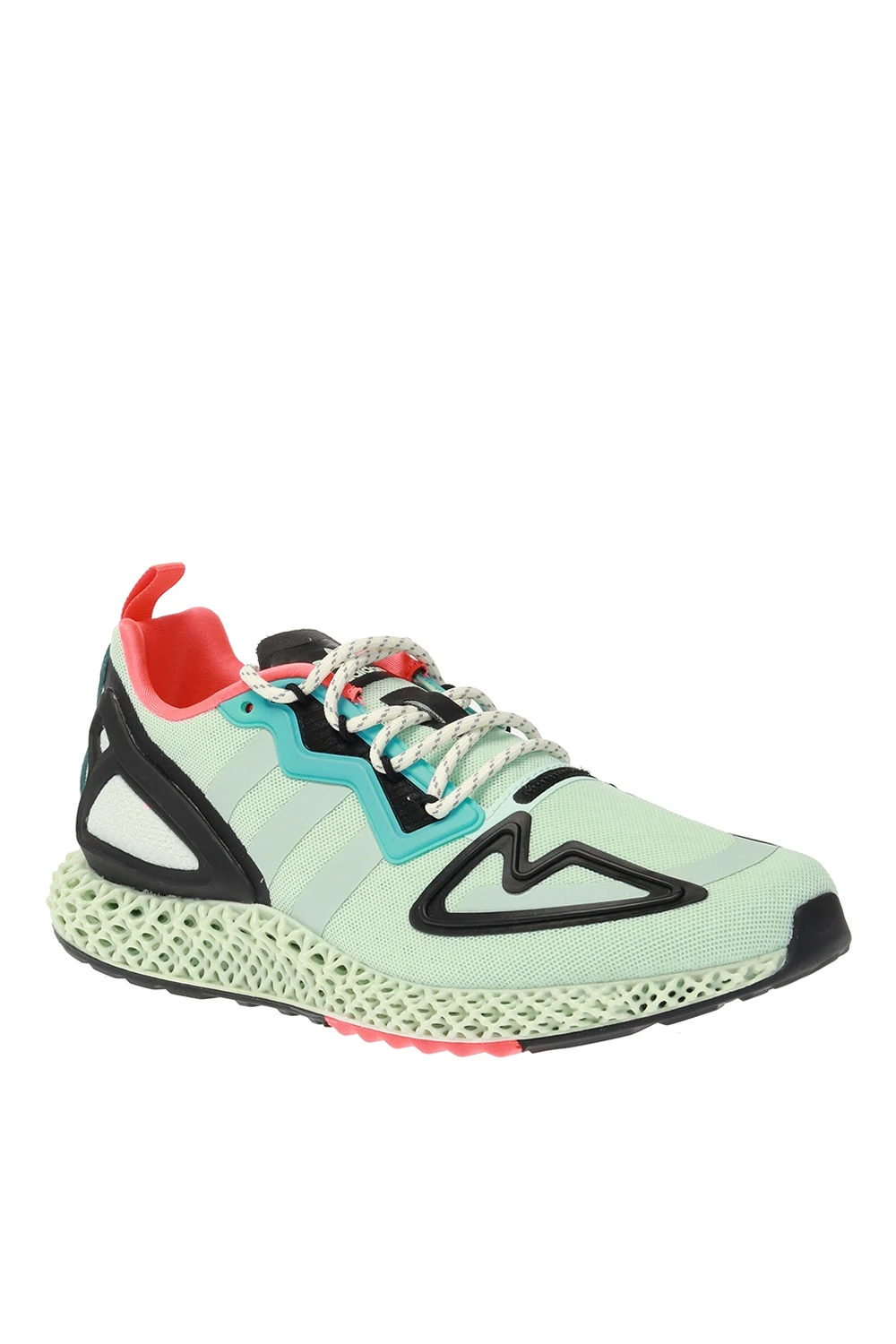 Jasnozielone, sznurowane buty sportowe, model ‘ZX 2K 4D’ ADIDAS Originals. Dekoracyjne gumowe elementy w kolorze czarnym i niebieskim. Po bokach charakterystyczne dla marki trzy paski. Z tyłu ciemnozielona wstawka wykonana z zamszu oraz neonowopomarańczowy, rypsowy pasek. Jasnozielona, podeszwa środkowa ADIDAS 4D została opracowana w oparciu o dane oparte na doświadczeniu profesjonalnych sportowców przez ostatnie siedemnaście lat. Gęsta, wielowymiarowa konstrukcja otwarta zapewnia precyzyjne wsparcie i amortyzację. Czarna, gumowa podeszwa zewnętrzna.