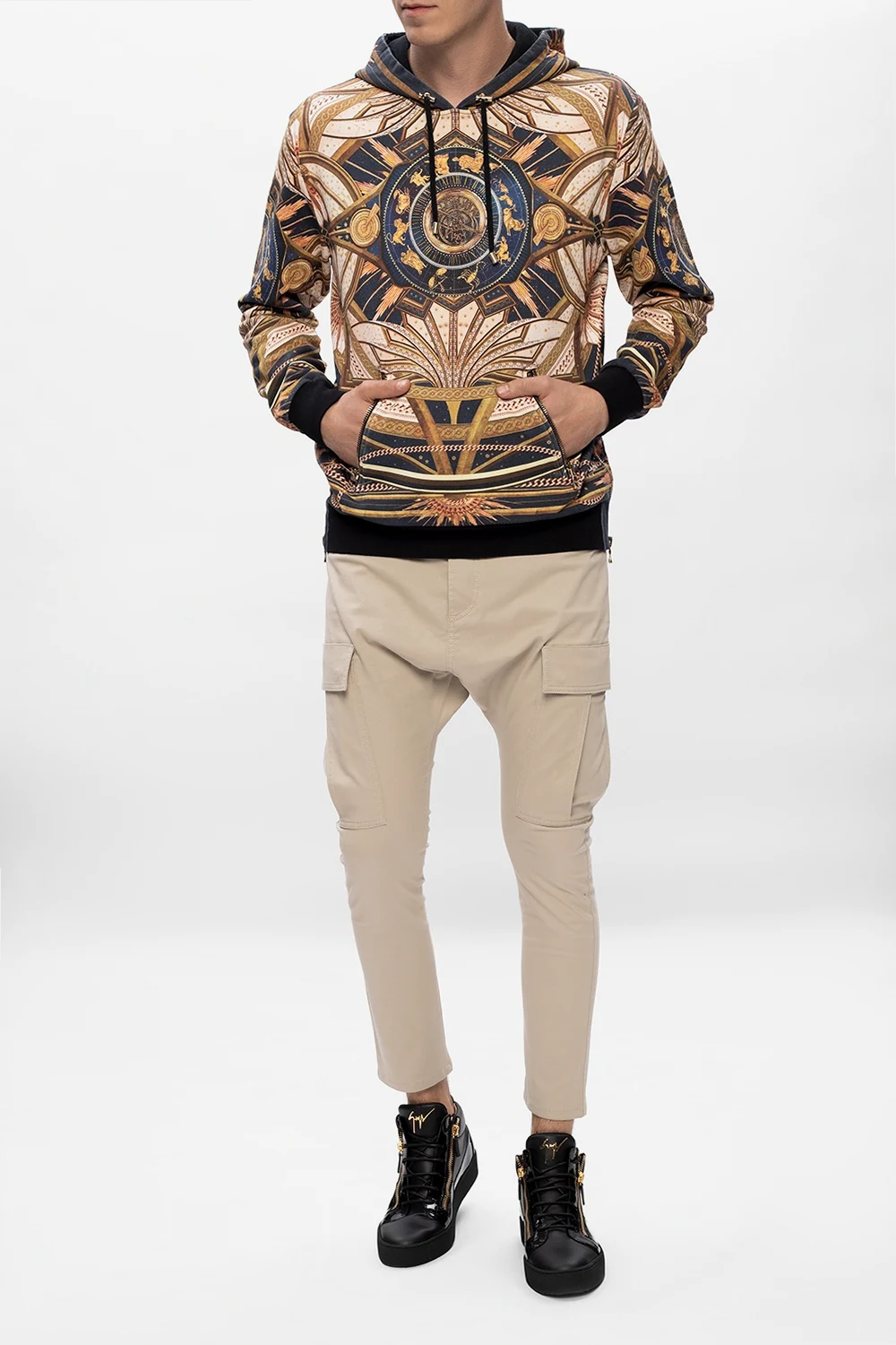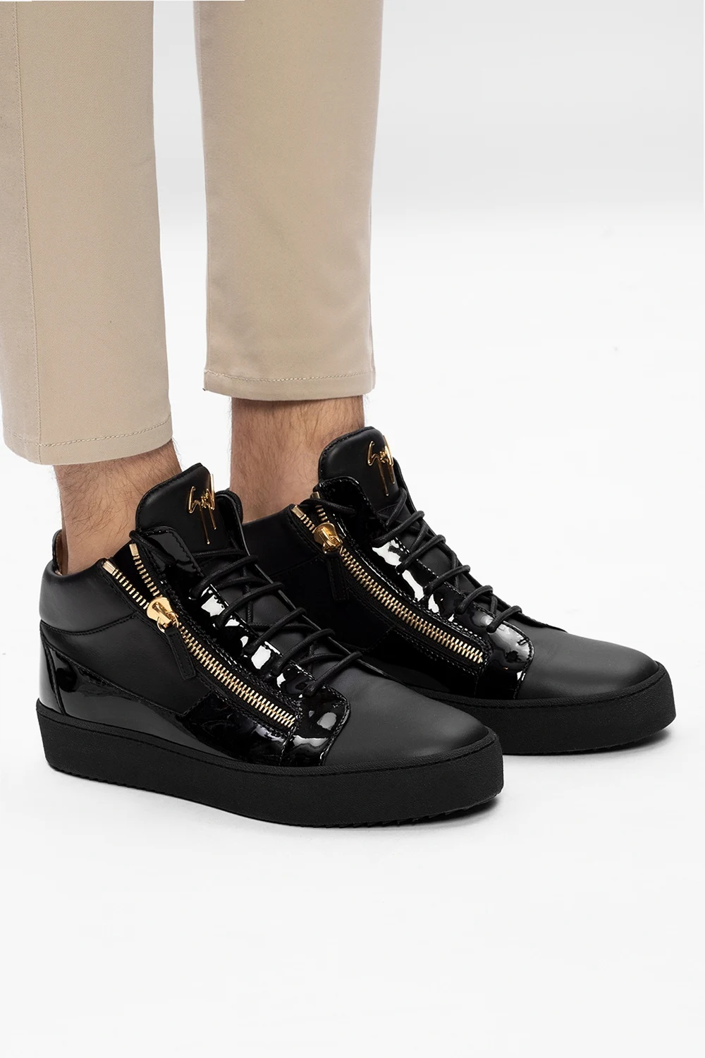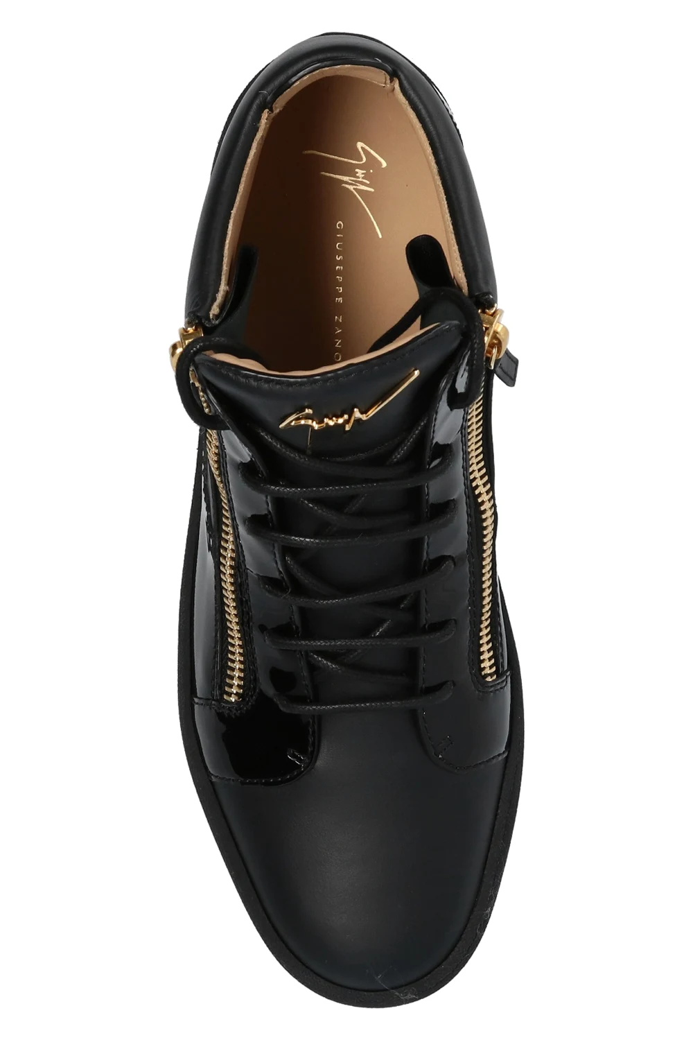 Czarne, sznurowane botki, model ‘May London’ Giuseppe Zanotti. Wykonane ze skóry. Dodatkowo zapinane na zamki. Ozdobione metalową aplikacją z logo w kolorze złotym. Czarna, gumowa podeszwa.