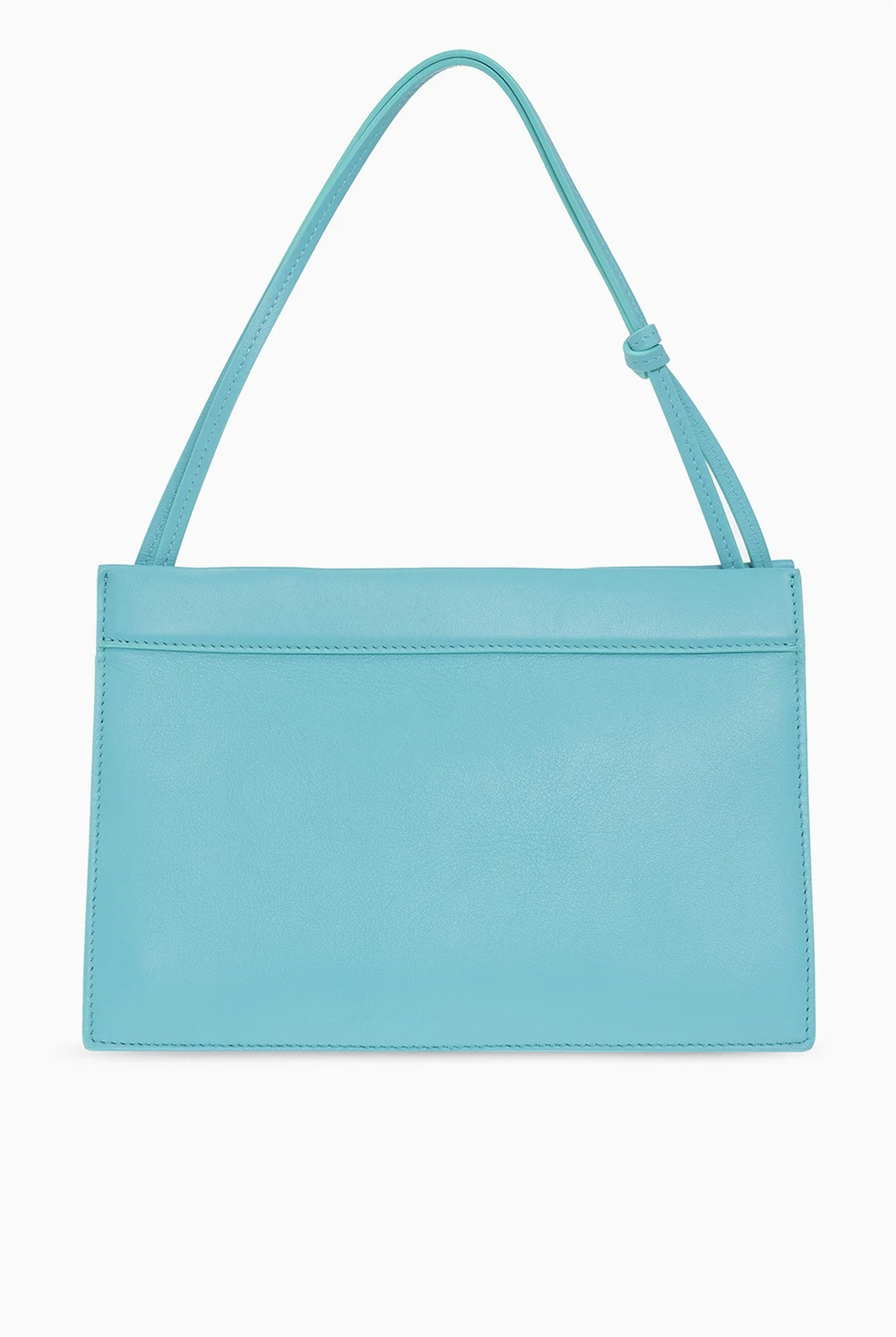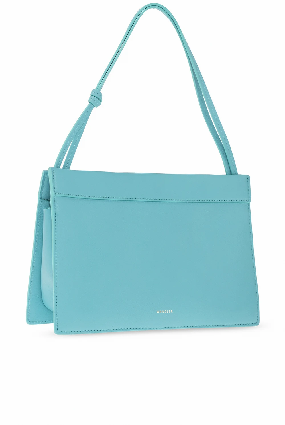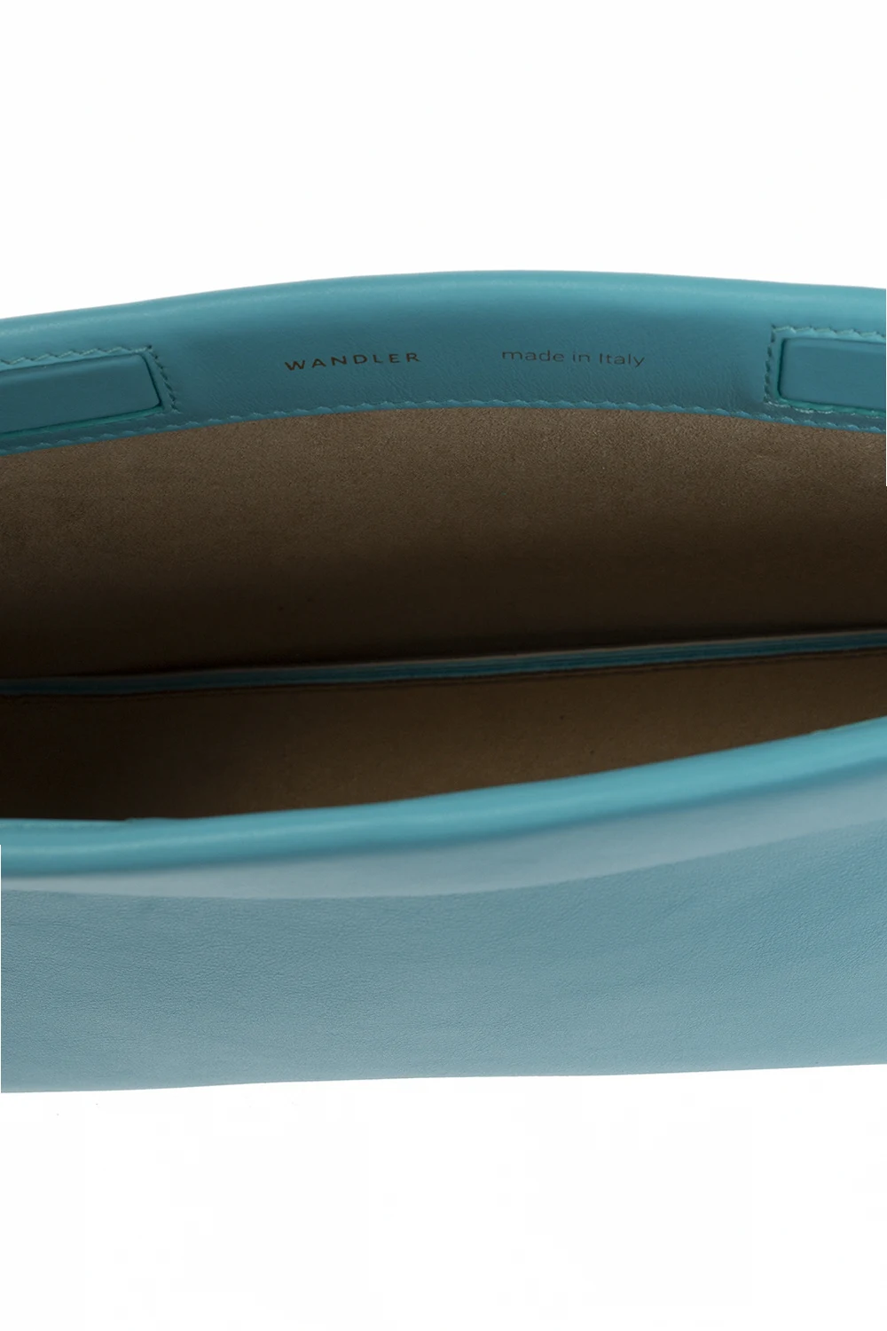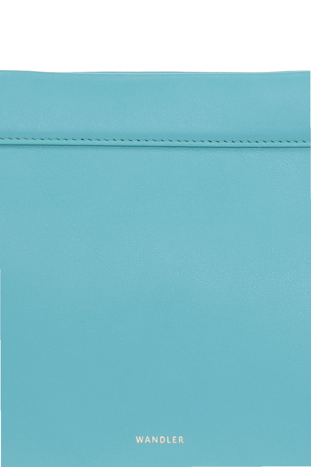 Niebieskozielona torba do ręki, model 'Hannah' Wandler. Wykonana z cielęcej skóry. Zamykana na magnetyczne zatrzaski. Z przodu ozdobiona nadrukowanym logo w kolorze złotym. Podwójna rączka z ozdobnym węzłem. Wnętrze z zamszu w kolorze jasnobrązowym. Wewnątrz komora. Wykonana ręcznie we Włoszech.