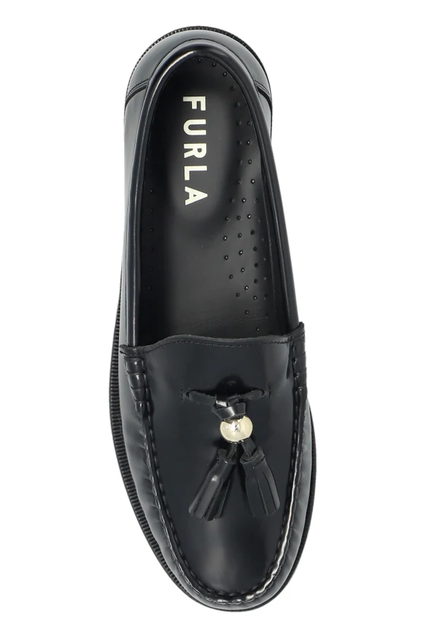 Uwagę przyciągają dwa kunsztowne frędzle, połączone złotą, metalową kulką, dodającą wyrafinowanego charakteru każdemu kroczkowi. Na wkładce widnieje napis „FURLA”, będący znakiem rzemieślniczej jakości oraz prestiżu. Komfort gwarantuje płaska, czarna podeszwa z lekkim podwyższeniem, doskonała zarówno na oficjalne spotkania, jak i codzienne spacery.