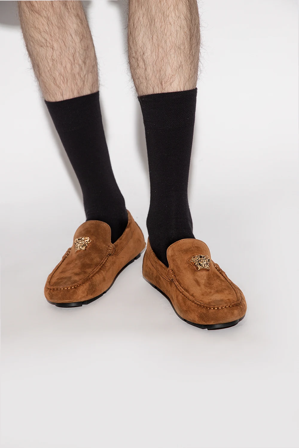 Brązowe, zamszowe mokasyny Versace. Wykonane ze skóry. Ozdobione charakterystyczną dla marki głową Meduzy. Czarna, gumowa podeszwa.