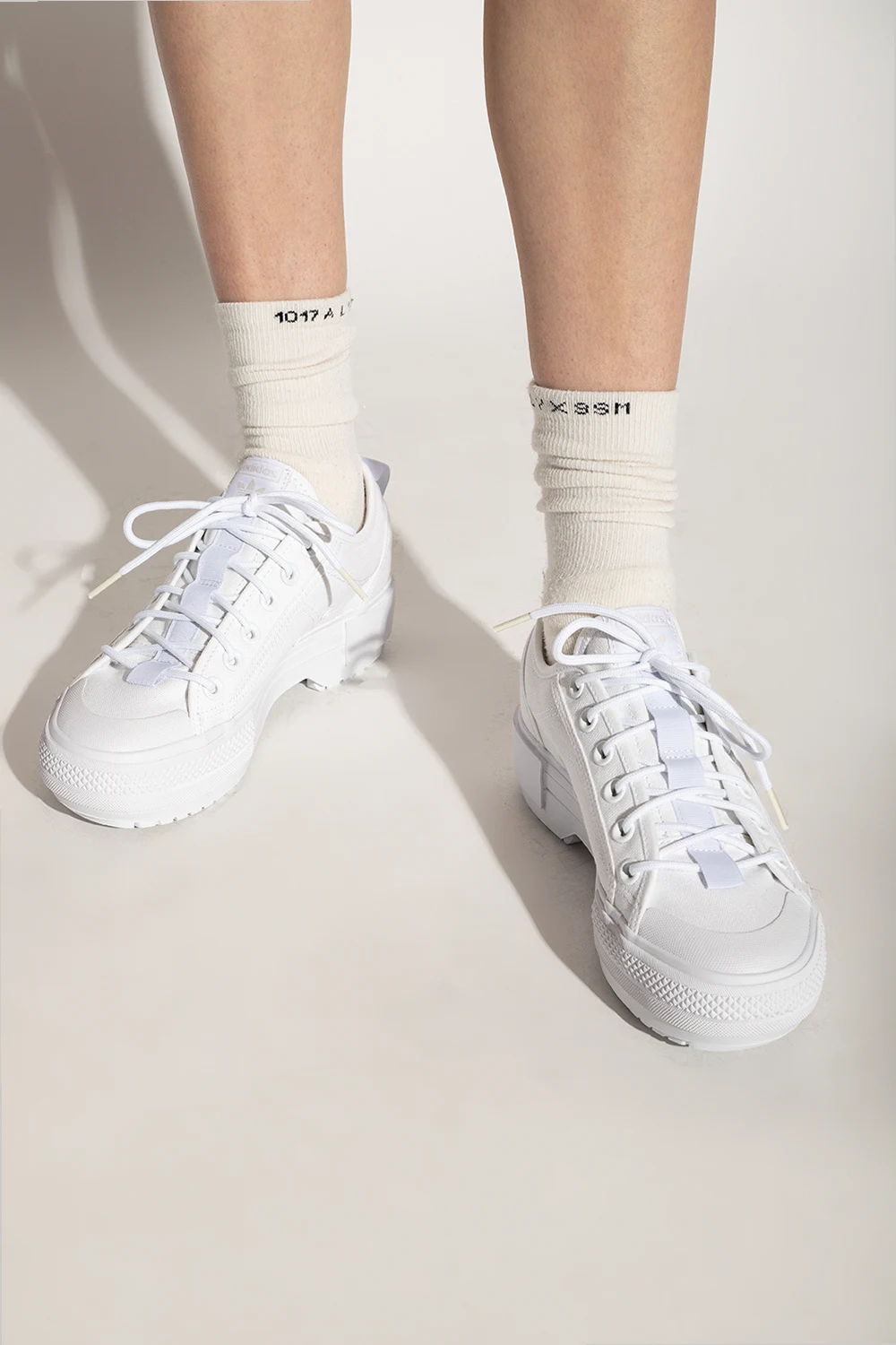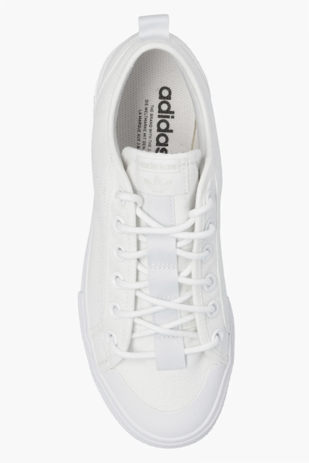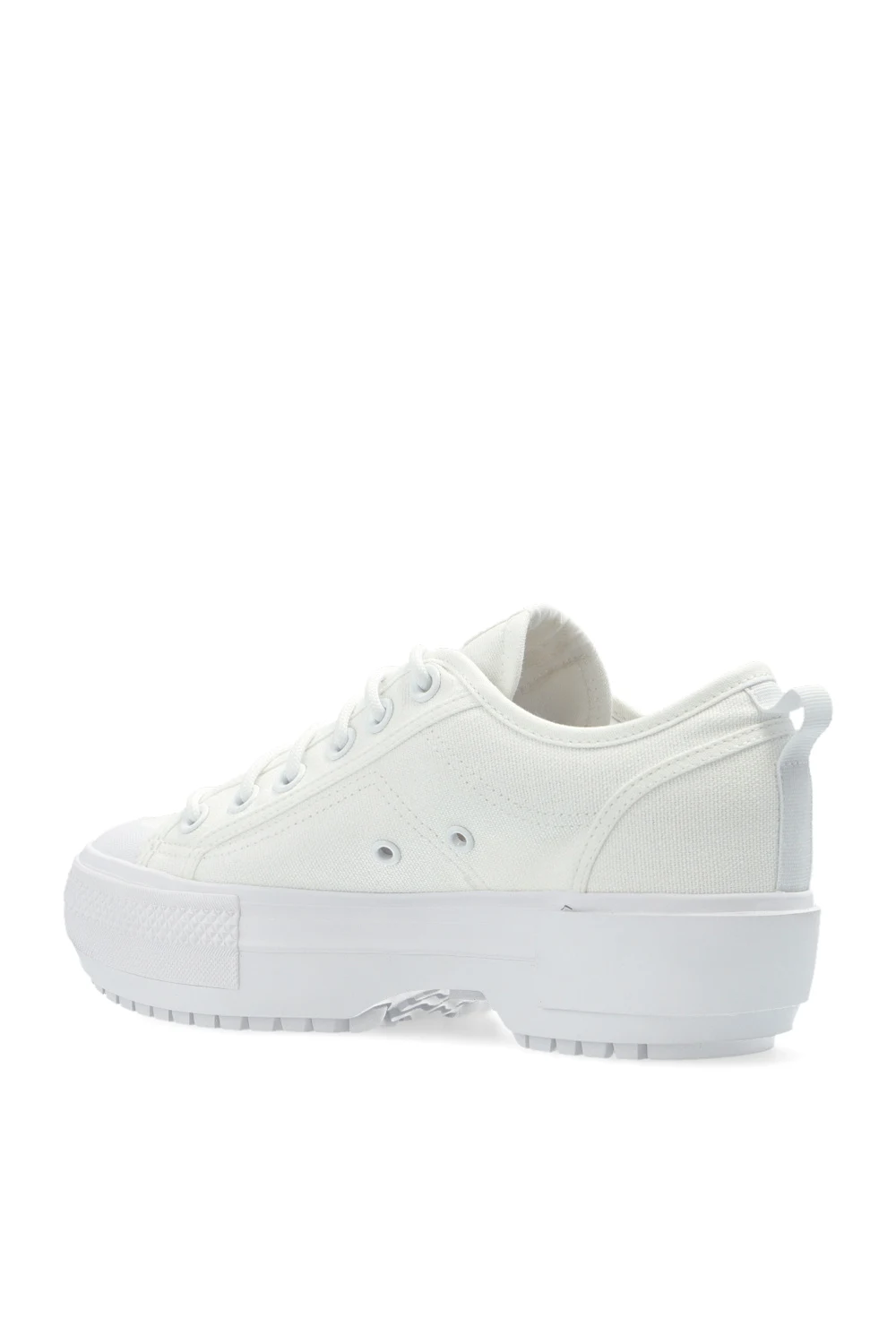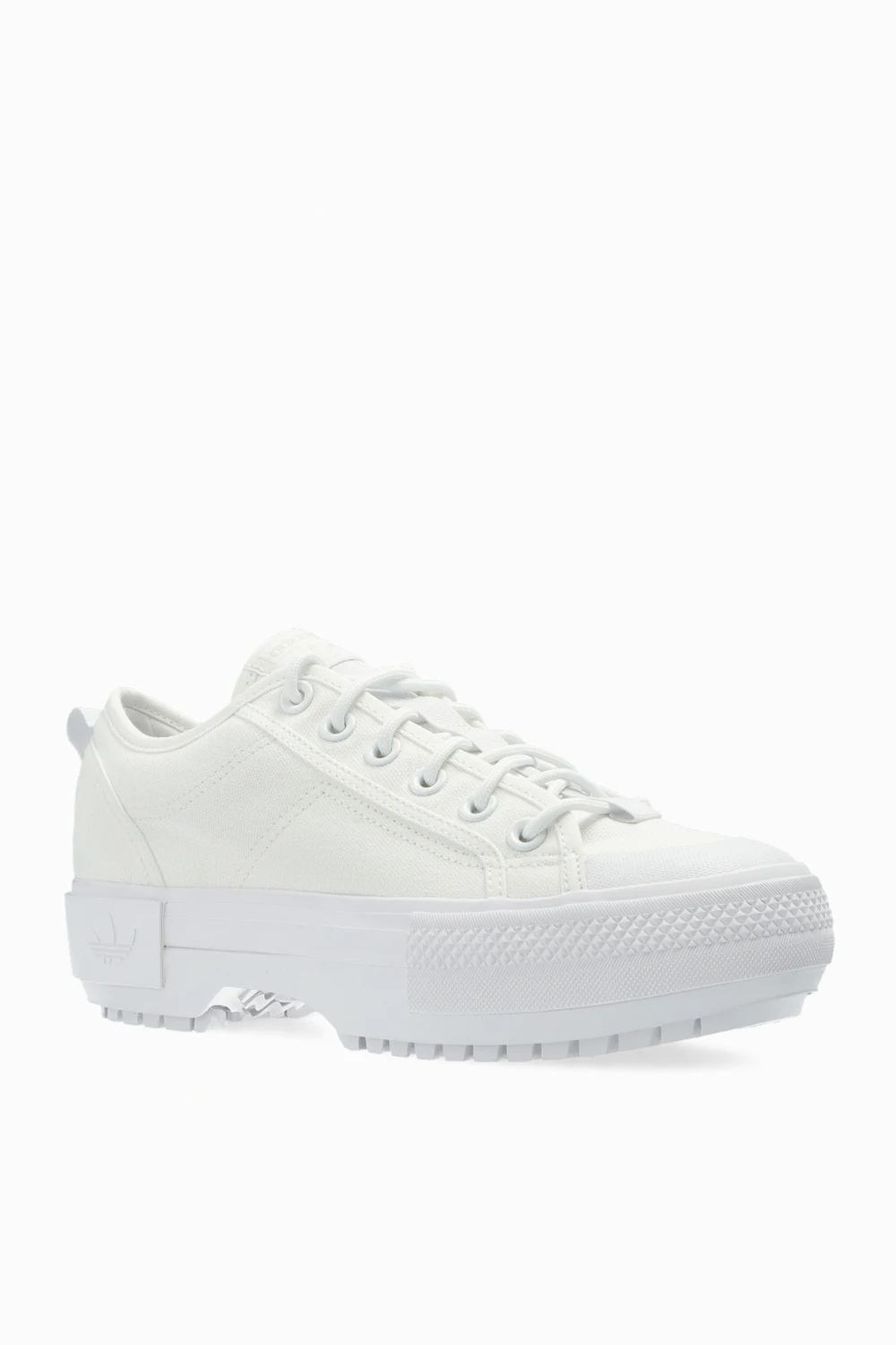 Białe, sznurowane buty sportowe na platformie, model ‘Nizza Trek Low’ ADIDAS Originals. Wykonane z materiału. Ozdobione logo. Biała, gumowa podeszwa.