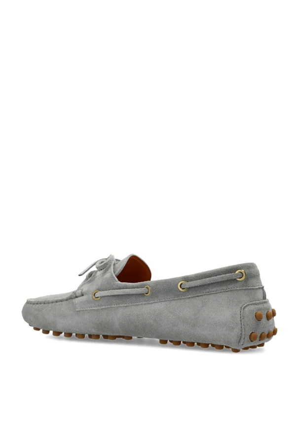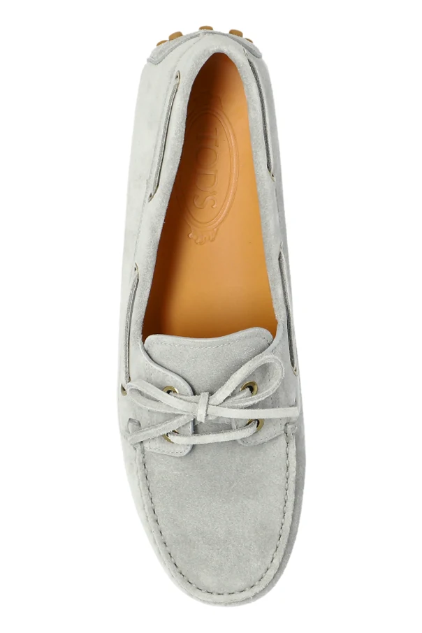 Skórzane buty ‘Gommino’ marki Tod’s to kwintesencja wyrafinowanej elegancji i nieprzemijającej klasyki. Odsłaniają szlachetny szary odcień miękkiego zamszu, subtelnie podkreślony delikatnym połyskiem, co potęguje ekskluzywny charakter obuwia. Wyrafinowany fason loafersów wyróżnia się zaokrąglonym przodem oraz smukłą linią, tworząc harmonijną kompozycję i gwarantując ponadczasowy styl.