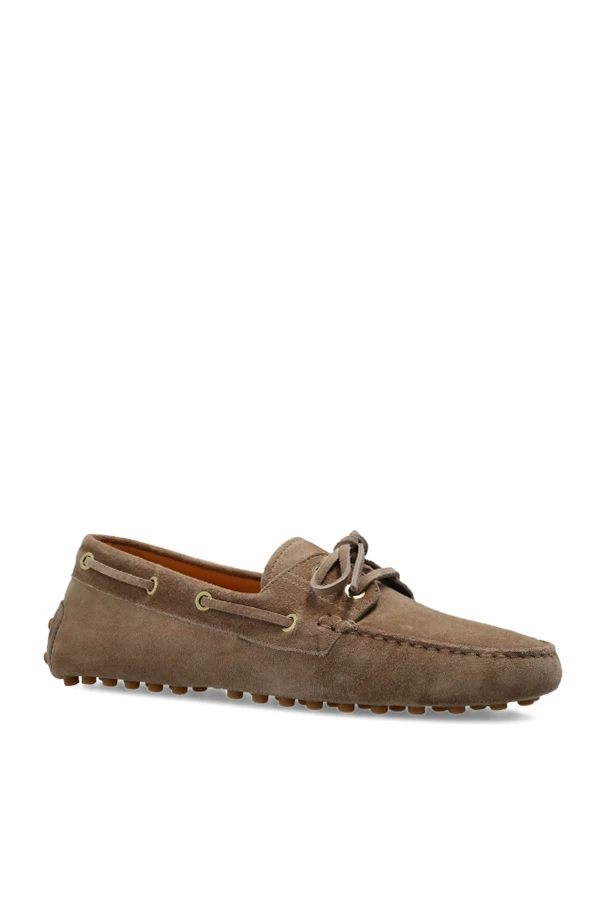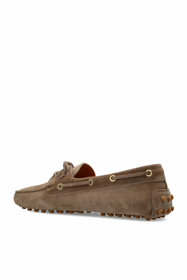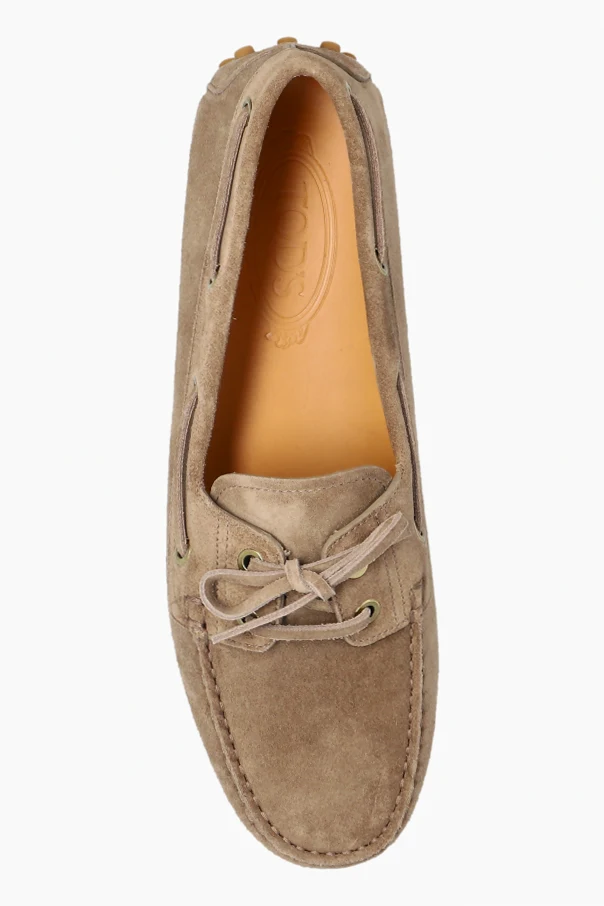 Wyrafinowanego charakteru nadają im dekoracyjne przeszycia oraz skórzany sznurek przewleczony przez złote oczka i zwieńczony elegancką kokardą. Elastyczna podeszwa z charakterystycznymi wypustkami zapewnia najwyższy komfort i doskonałą przyczepność, stanowiąc ikonę stylu domu mody Tod’s.