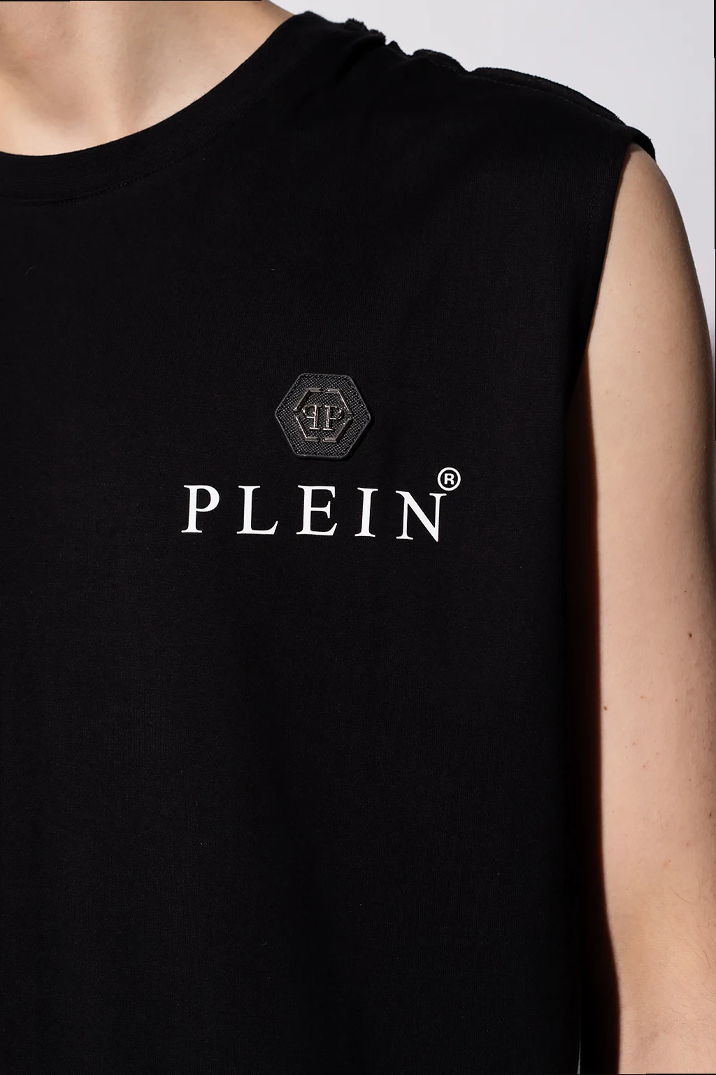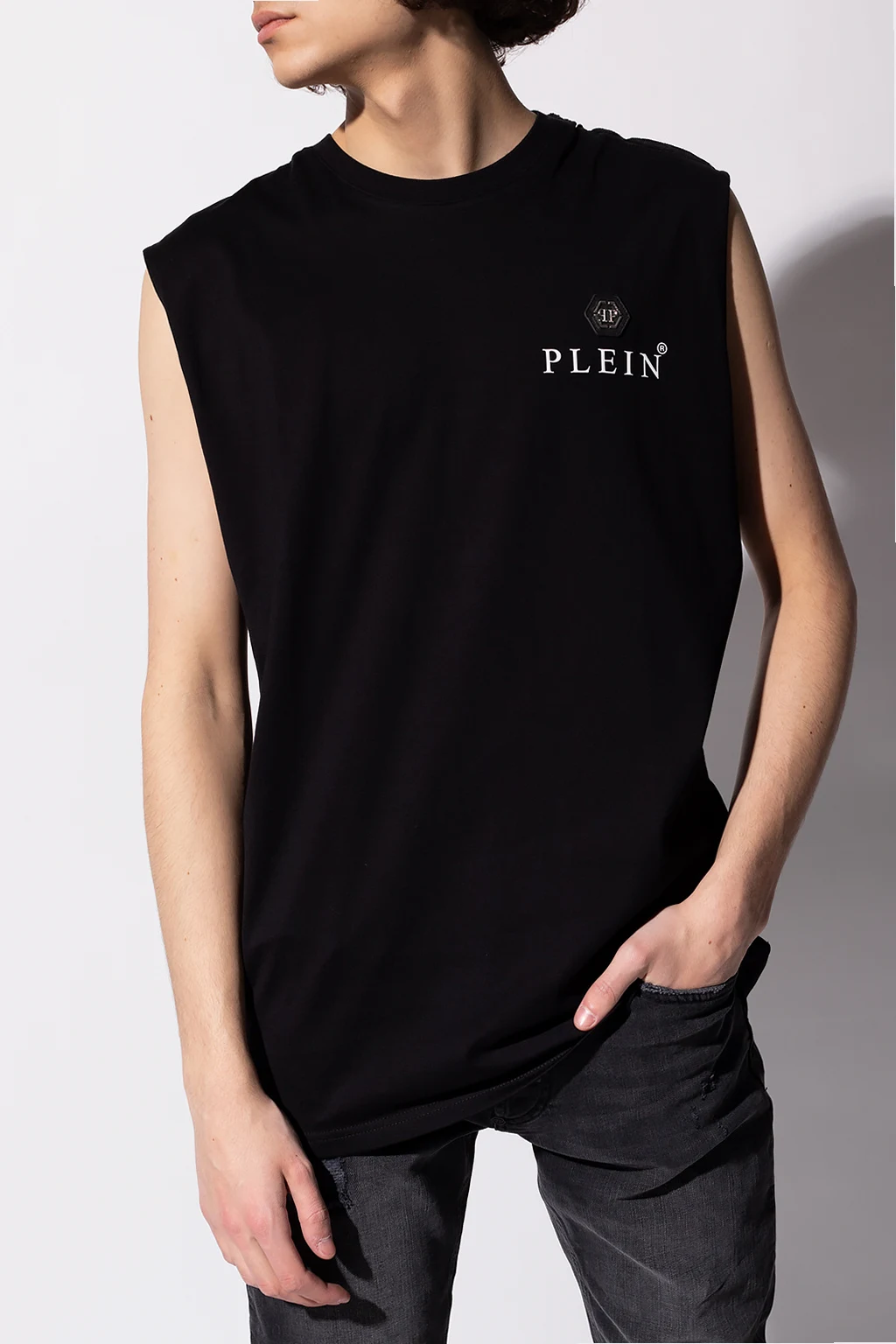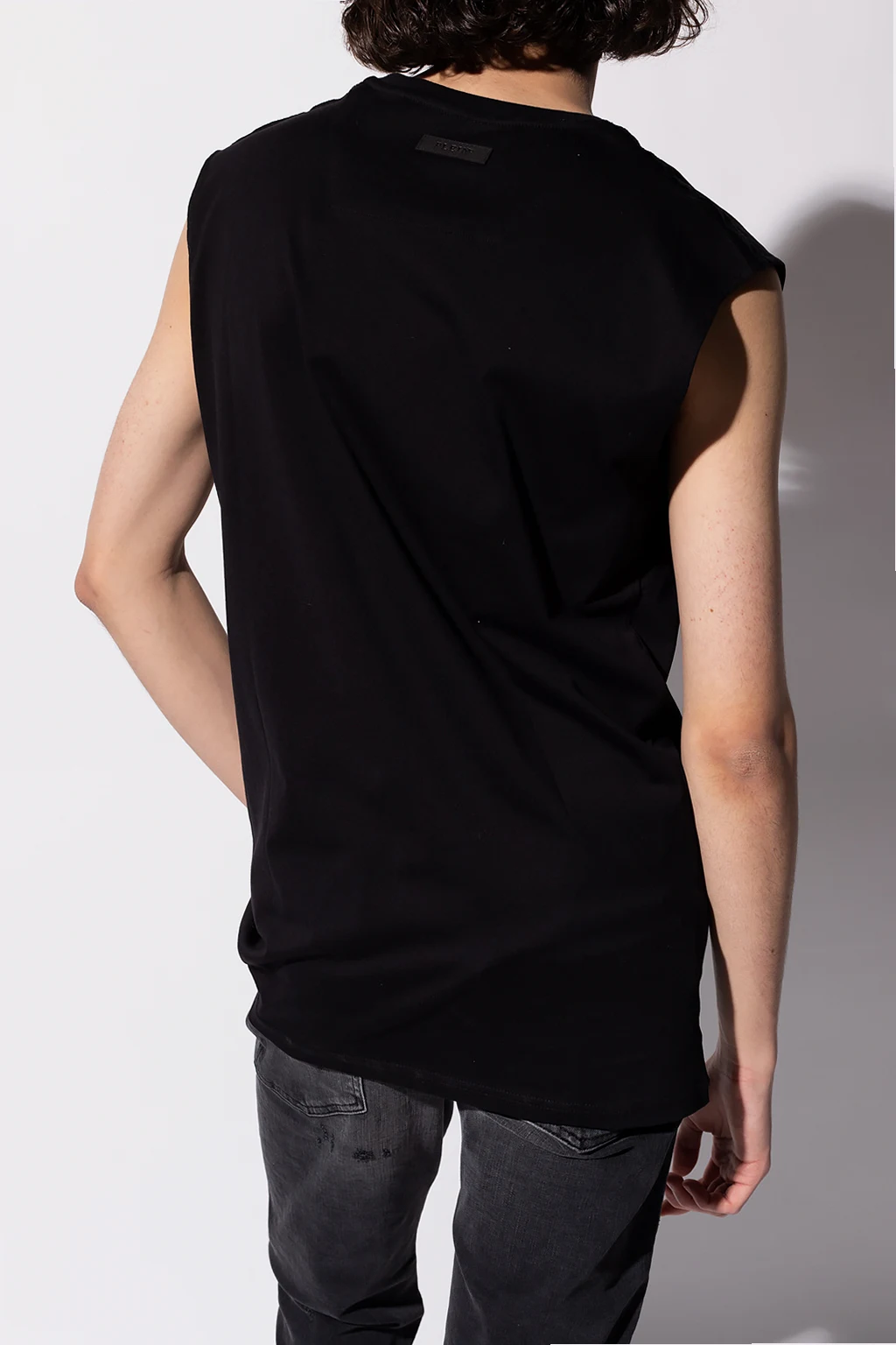 Czarny, bawełniany t-shirt bez rękawów Philipp Plein. Ozdobiony skórzaną naszywką z logo. Okrągły dekolt.