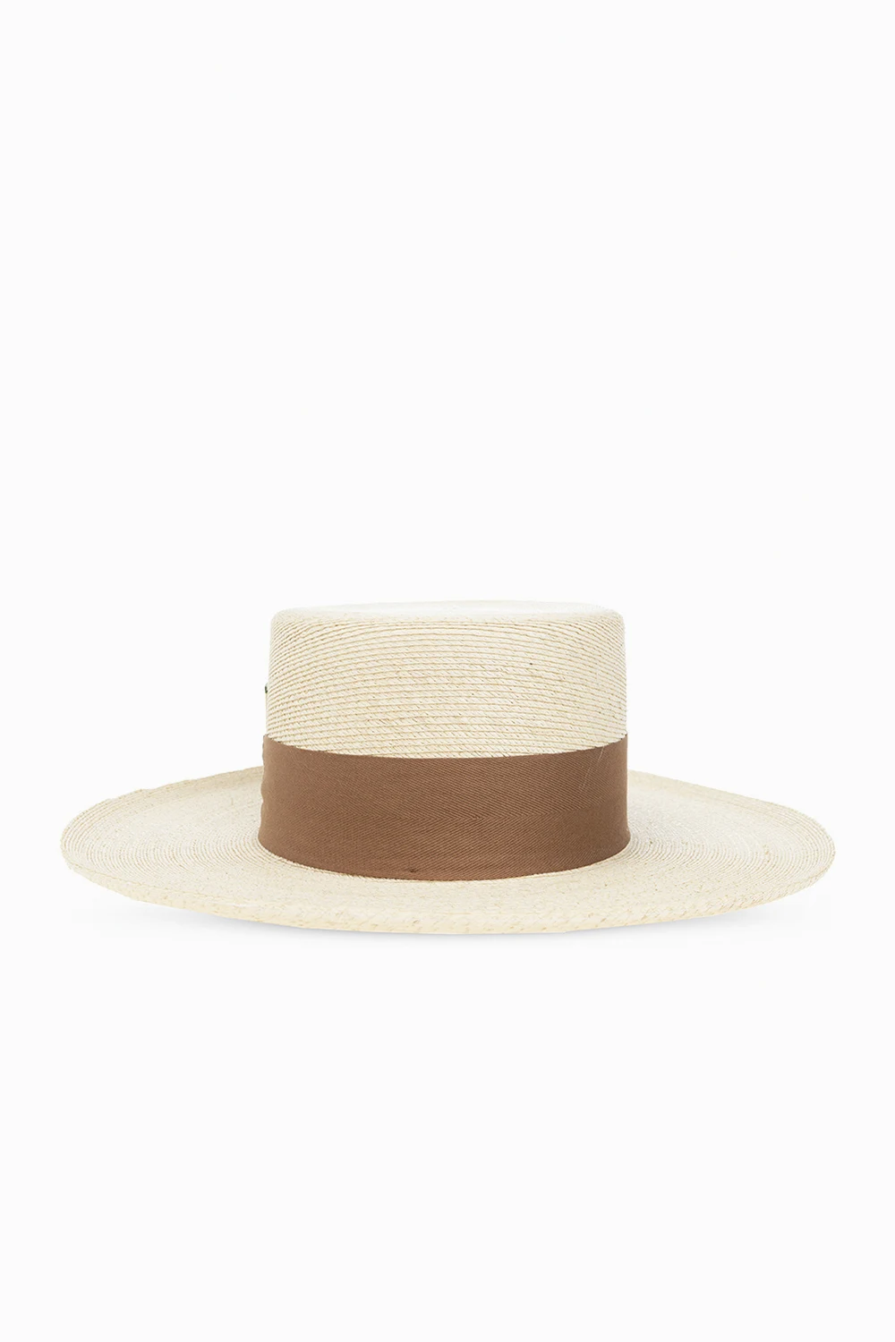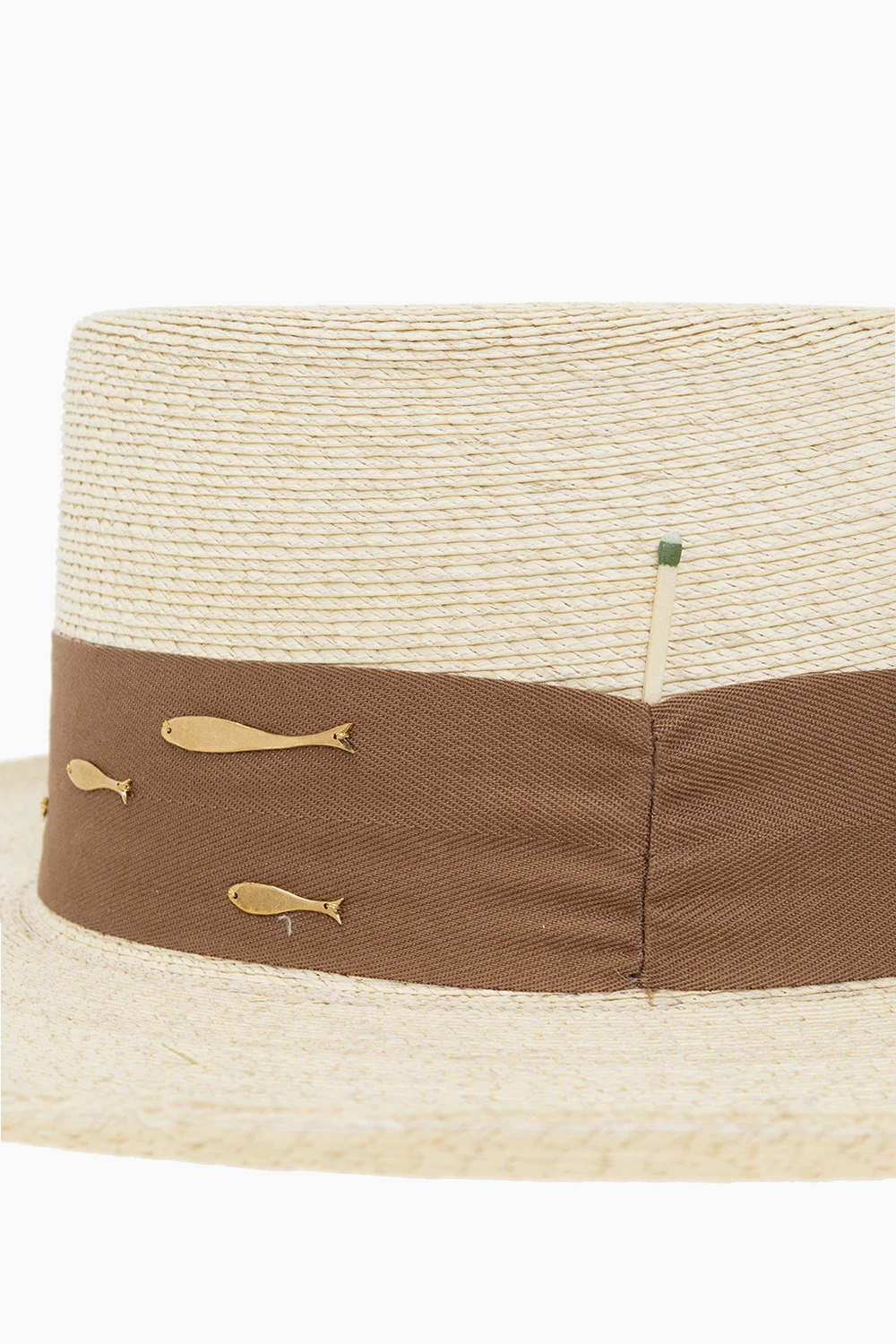 Jasnobeżowy, słomiany kapelusz, model ‘Vaquero’ Nick Fouquet. Brązowy, rypsowy pasek ozdobiony aplikacjami z motywem zwierzęcym w kolorze złotym. Z boku charakterystyczna dla marki zapałka.