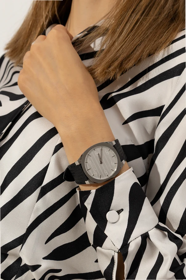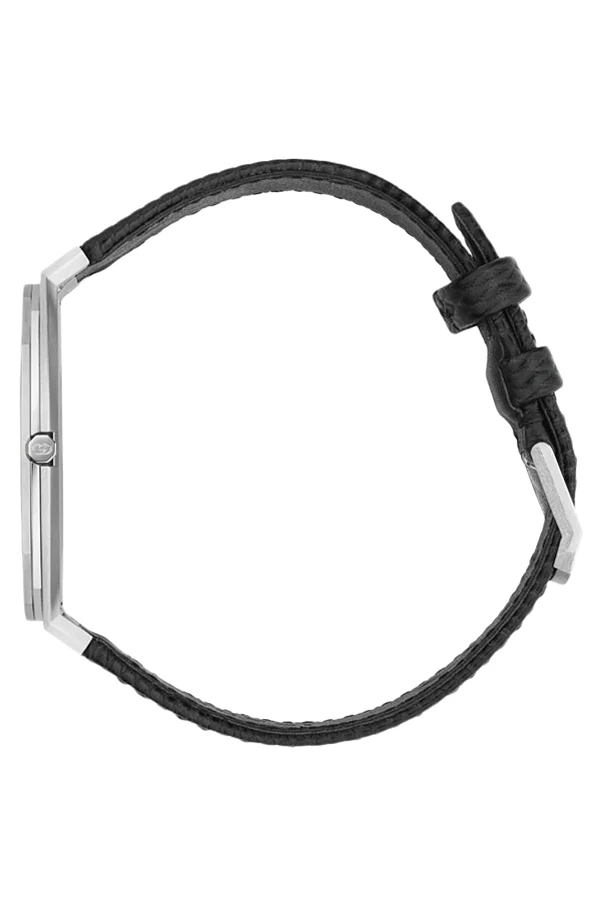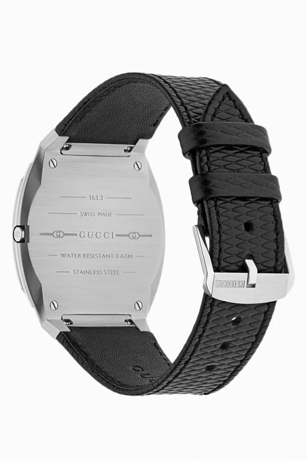 Zegarek z mechanizmem kwarcowym, model ‘25h’ Gucci. Wielowarstwowa koperta o średnicy 38mm wykonana ze stali nierdzewnej w kolorze srebrnym. Mosiężna tarcza ozdobiona wygrawerowanym logo oraz motywem ‘Interlocking G’. Szkiełko szafirowe z powłoką antyrefleksyjną. Czarny, regulowany pasek ze skóry ozdobiony wytłoczonym wzorem.