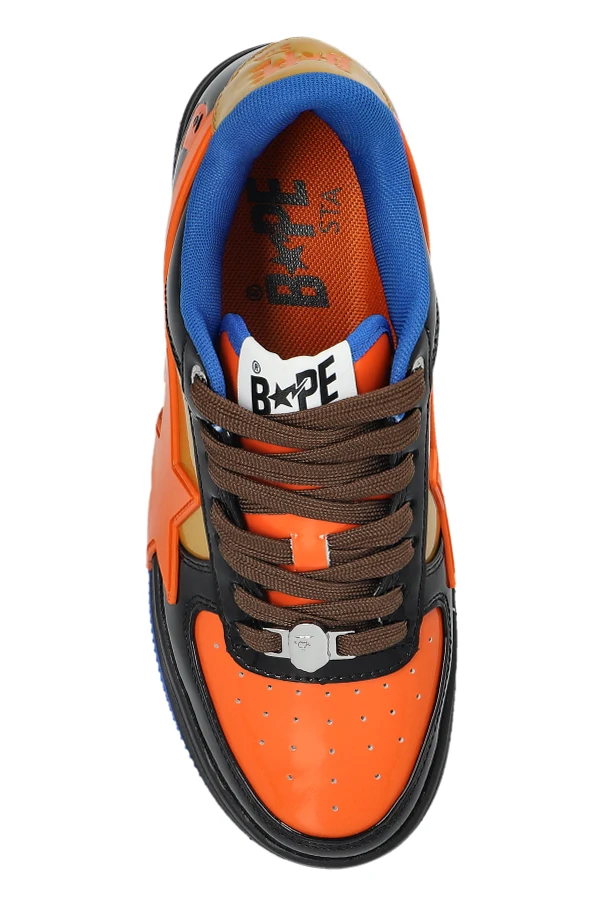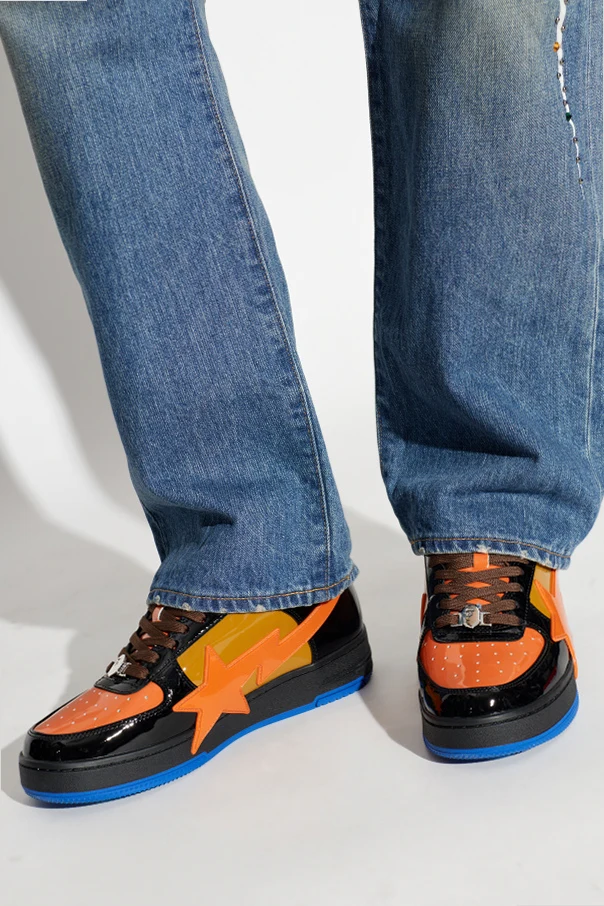 Buty sportowe z logo marki A BATHING APE® to kwintesencja wyrafinowanego stylu, wzbogacona o unikatowy charakter. Czerń powierzchni, akcentowana pomarańczowymi, brązowymi i oliwkowymi panelami, tworzy wyraziste, dynamiczne zestawienie kolorystyczne, zaś gruba, głęboko niebieska podeszwa definiuje nowoczesny wyraz projektu.