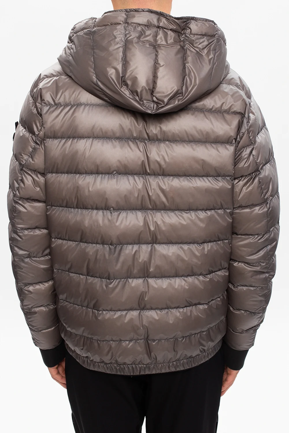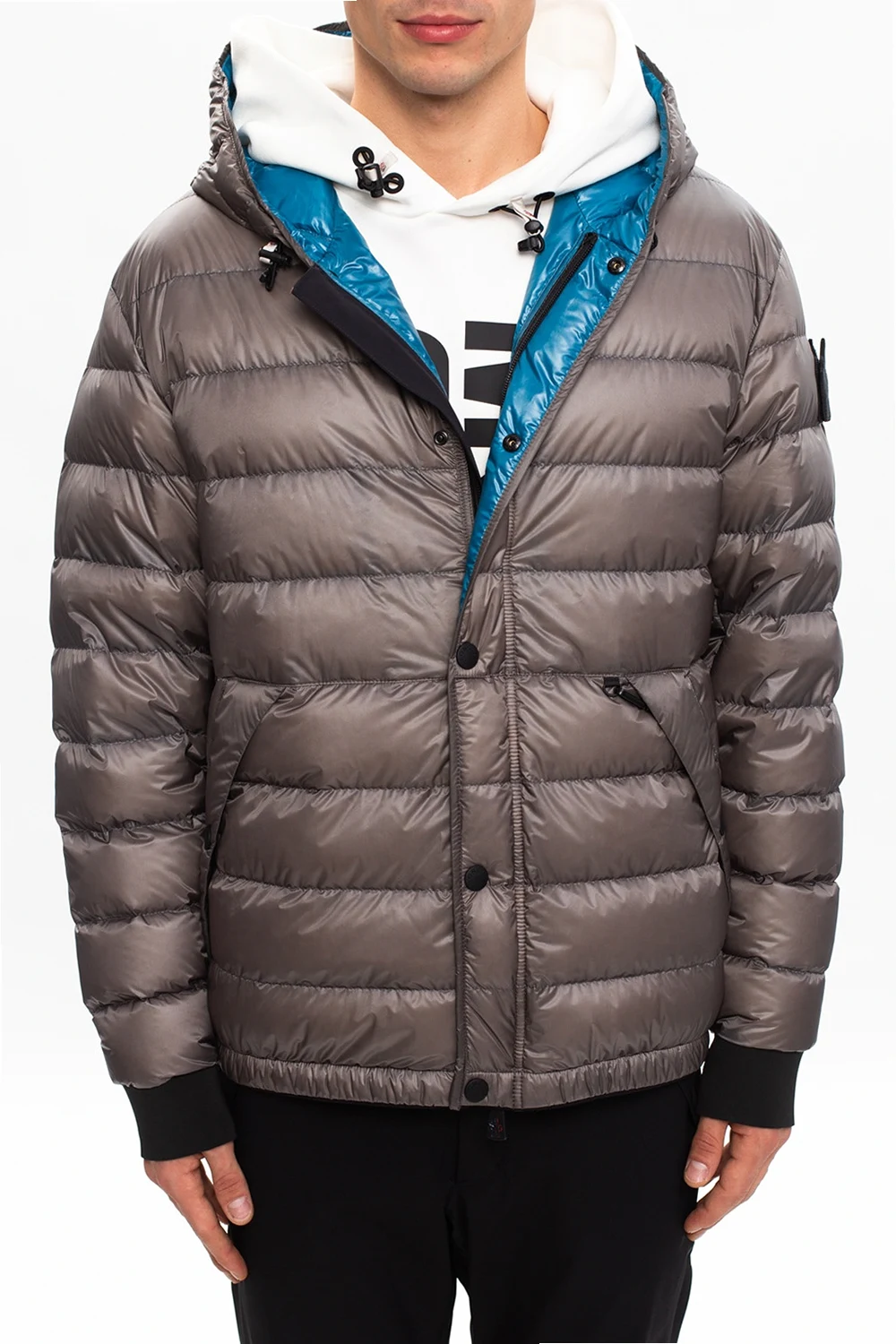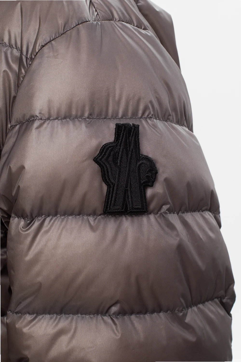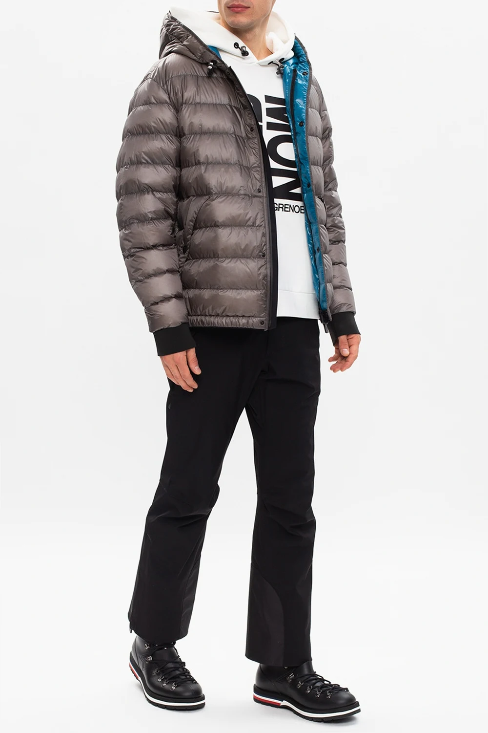 Szaro-niebieska, pikowana kurtka puchowa, model 'Jayer' Moncler Grenoble. Zapinana na dwubiegunowy zamek oraz na zatrzaski. Kaptur ściągany trokami. Ozdobiona aplikacją z logo oraz nadrukiem. Z przodu dwie kieszenie zapinane na zatrzask.