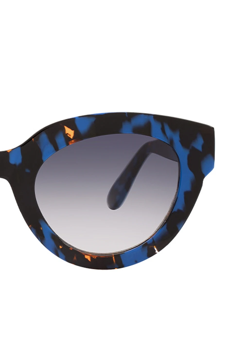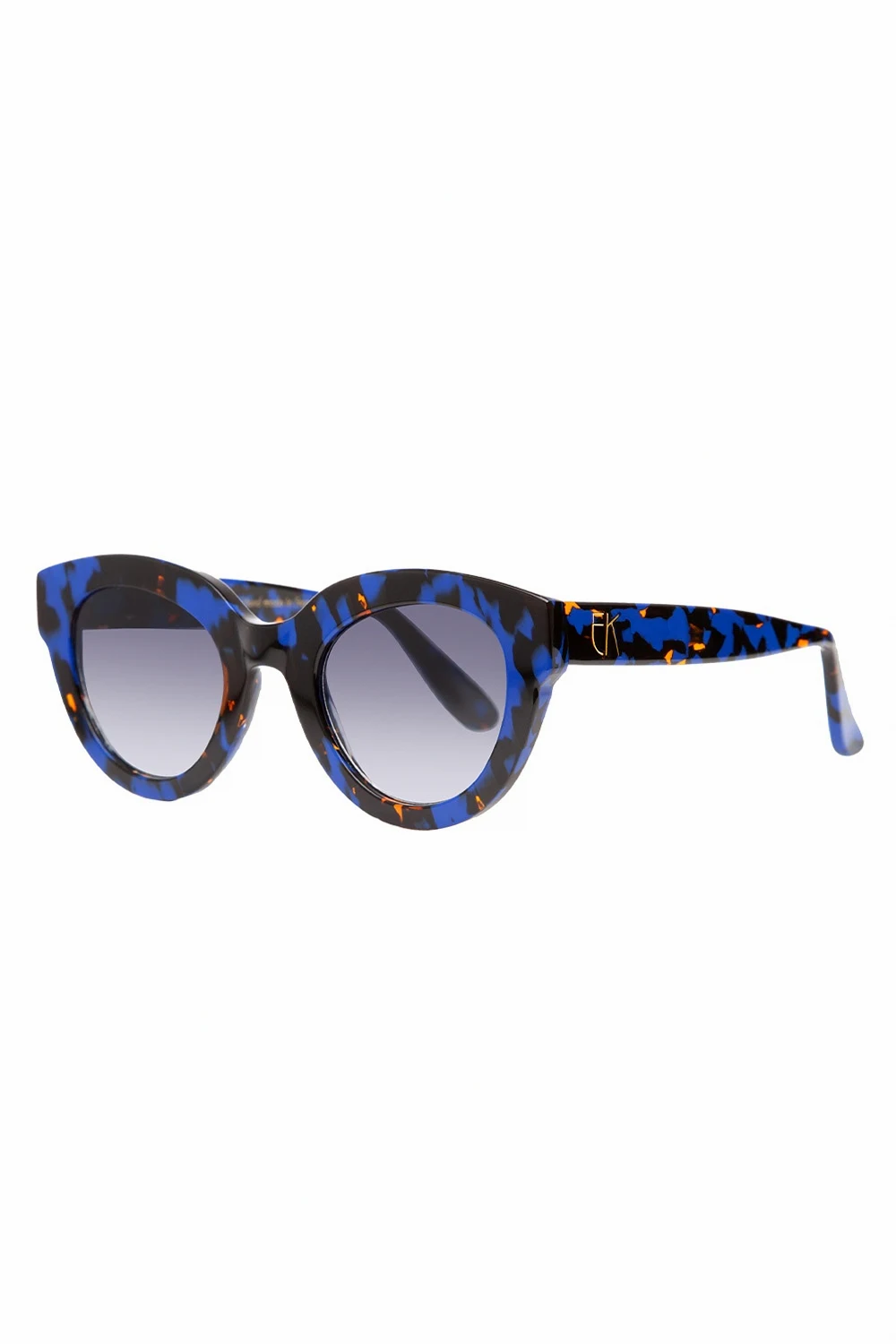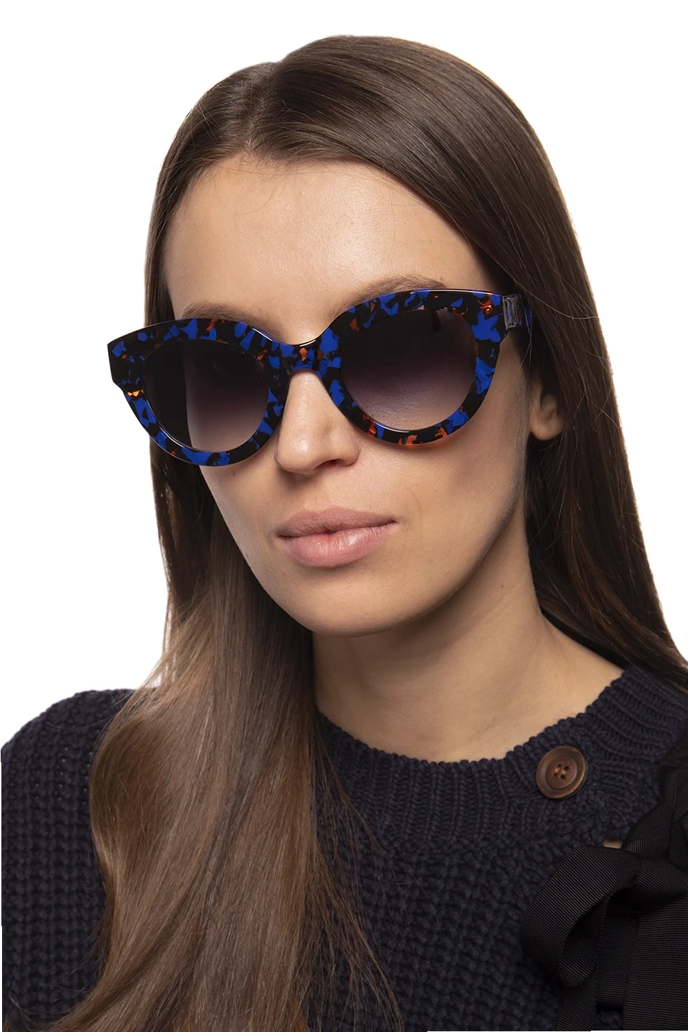Niebiesko-czarno-pomarańczowe okulary przeciwsłoneczne Emmanuelle Khanh. Ręcznie wykonane. Ozdobione nadrukowanym wzorem. Zauszniki z wytłoczonym logo w kolorze złotym. Dołączone czarne etui zamykane na dekoracyjny zatrzask.