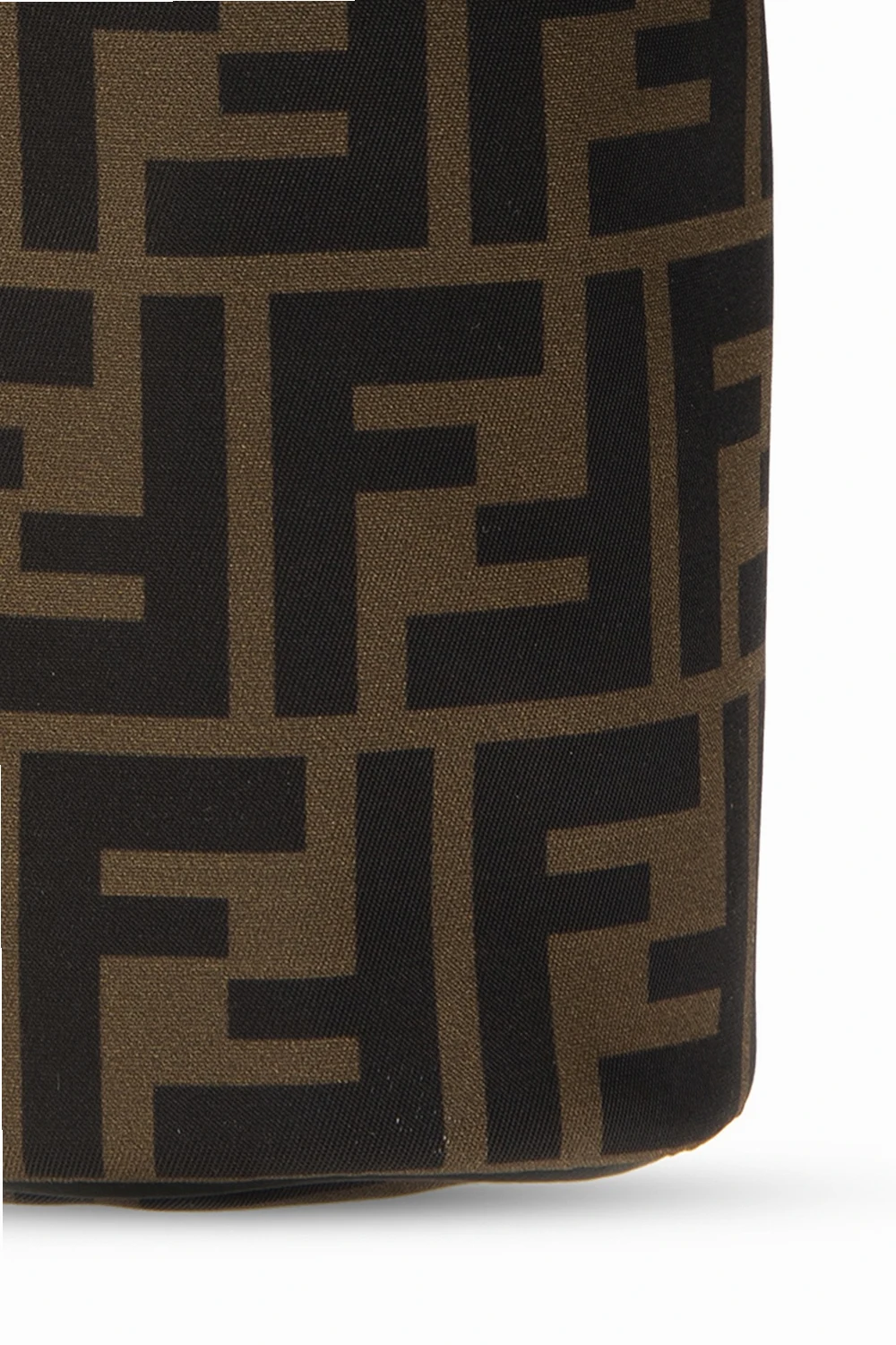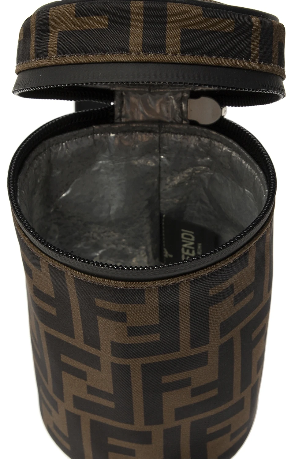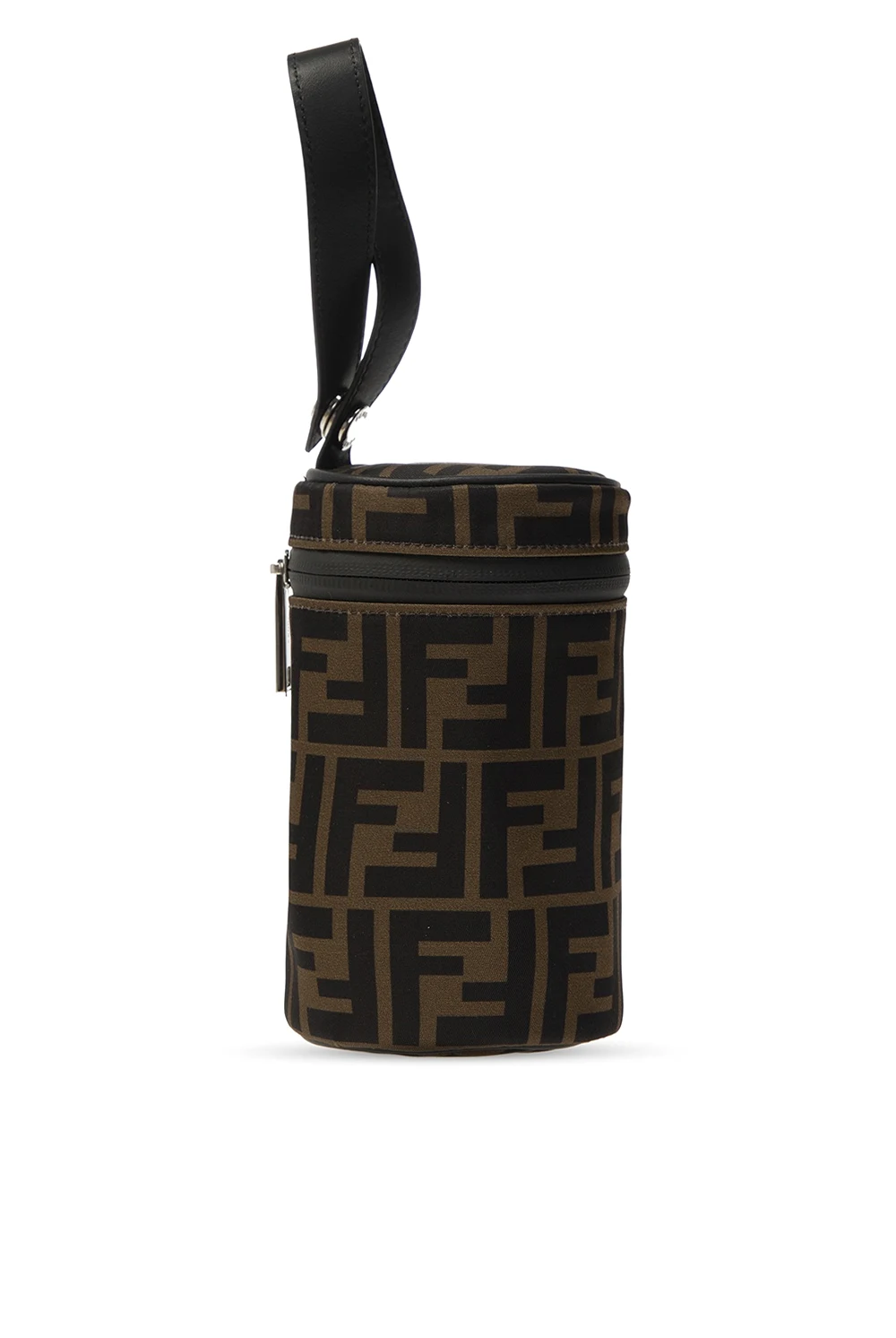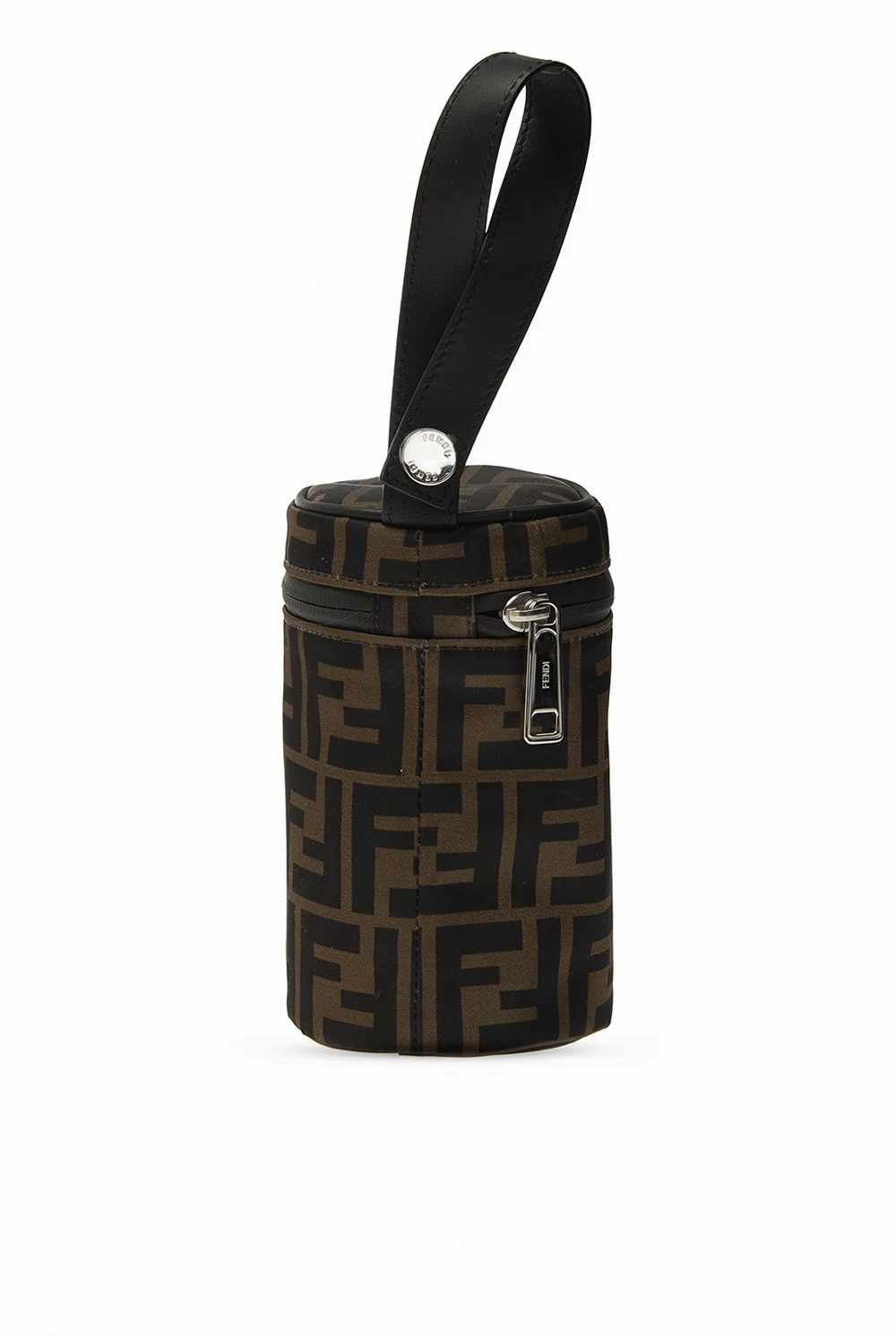 Brązowe etui termiczne na butelkę Fendi Kids. Zapinane na zamek. Ozdobione wzorem z logo. Skórzany pasek zapinany na zatrzask w kolorze srebrnym.