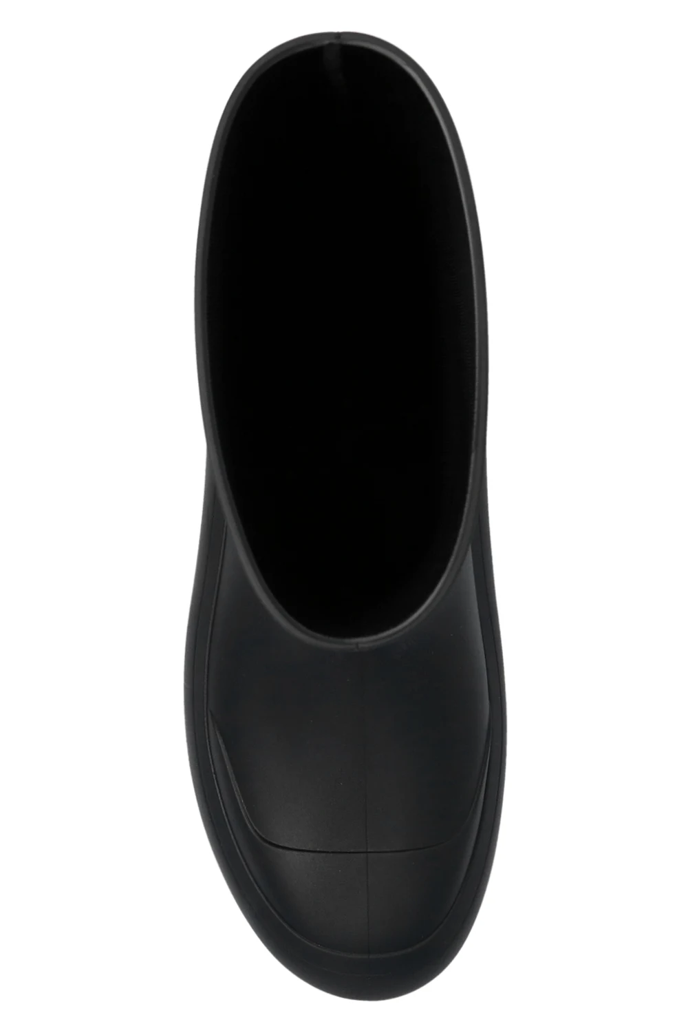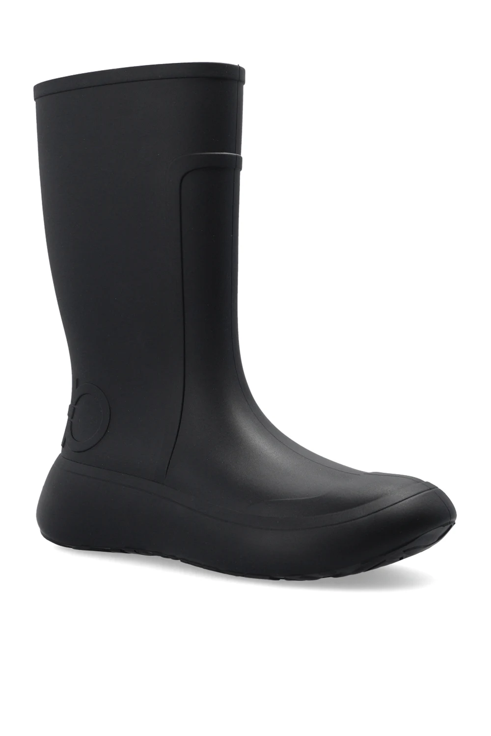 Czarne kalosze Salvatore Ferragamo. Wykonane z gumy pochodzącej z recyklingu. Z tyłu ozdobione motywem ‘Gancini’. Czarna, gumowa podeszwa.