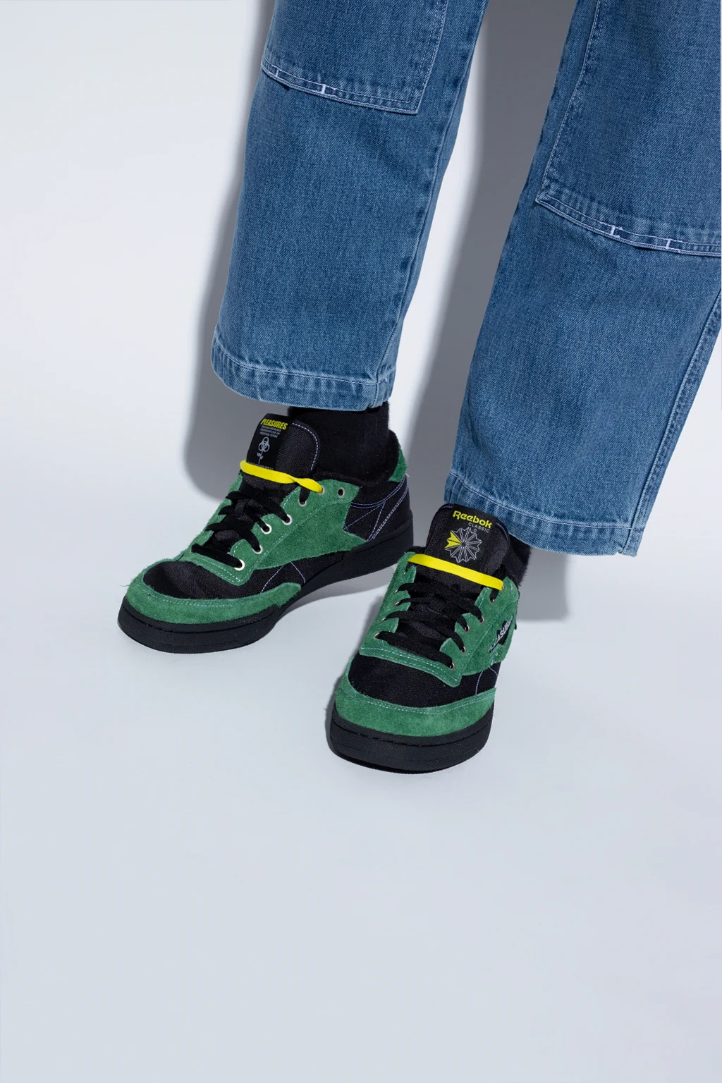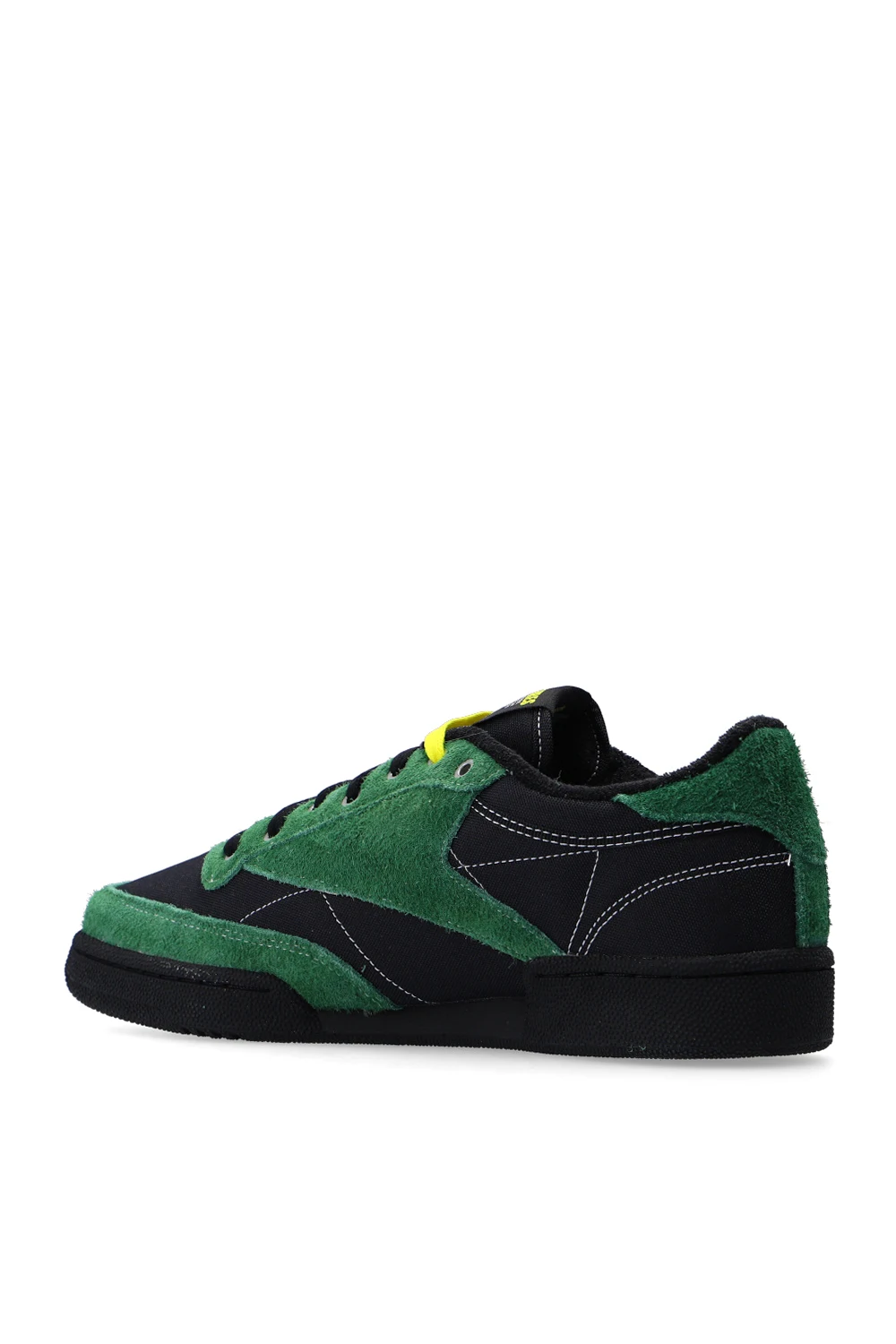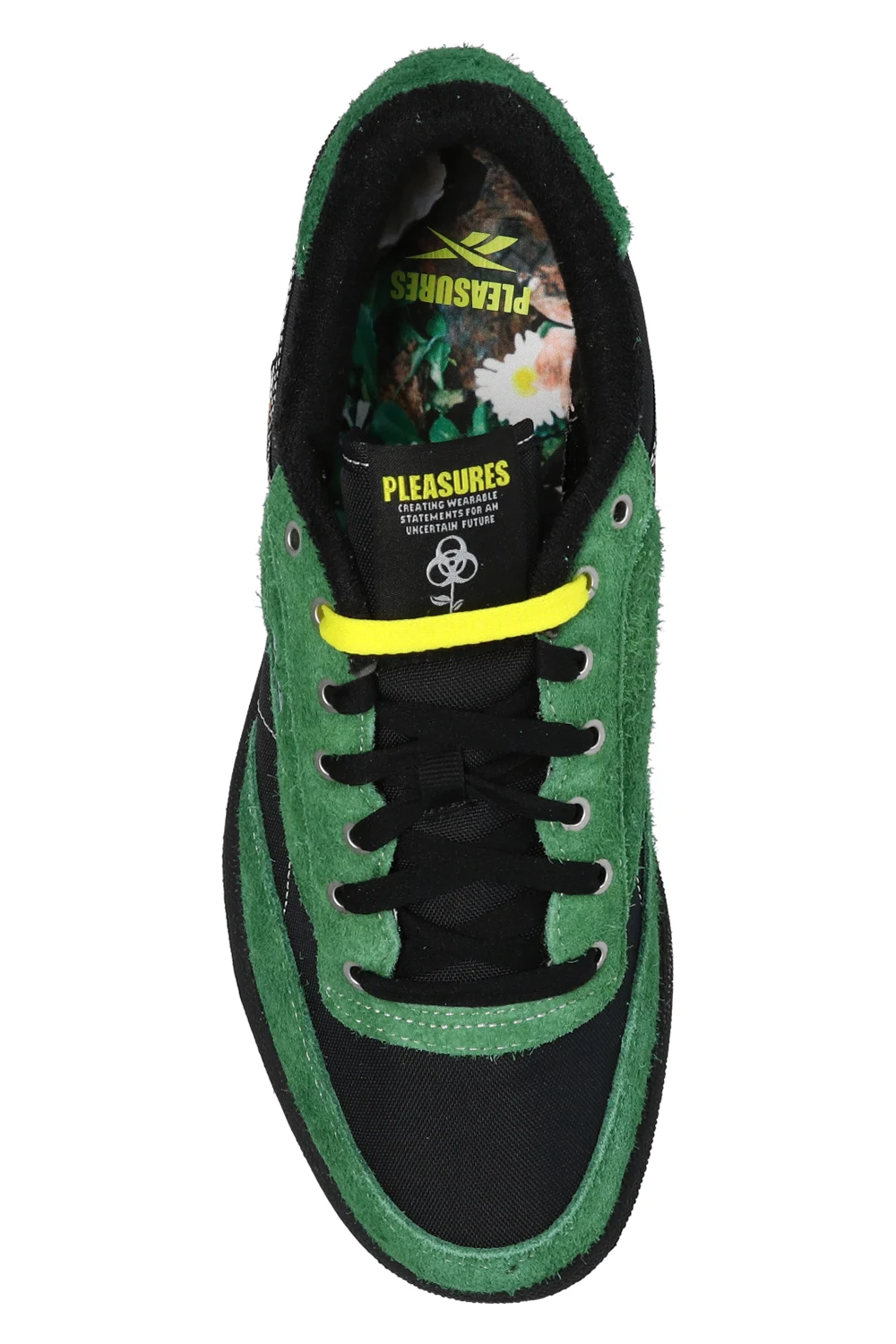 Czarno-zielone, sznurowane buty sportowe, model ‘Club C Pleasures’ Reebok. Wykonane z trwałej, odpornej na przetarcia i wodę tkaniny CORDURA®. Wykończone zamszem. Na języku naszywka z logo. Podeszwa środkowa z pianki EVA. Czarna, gumowa podeszwa.