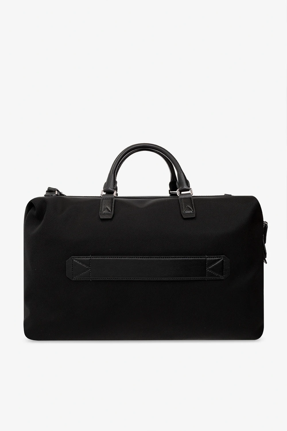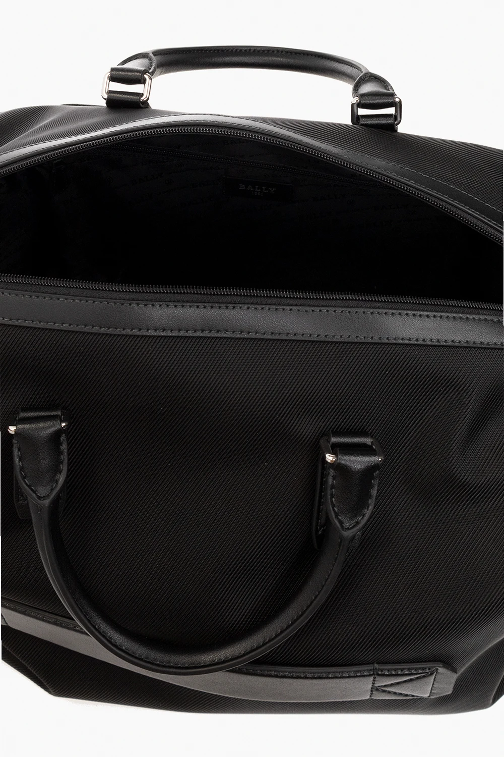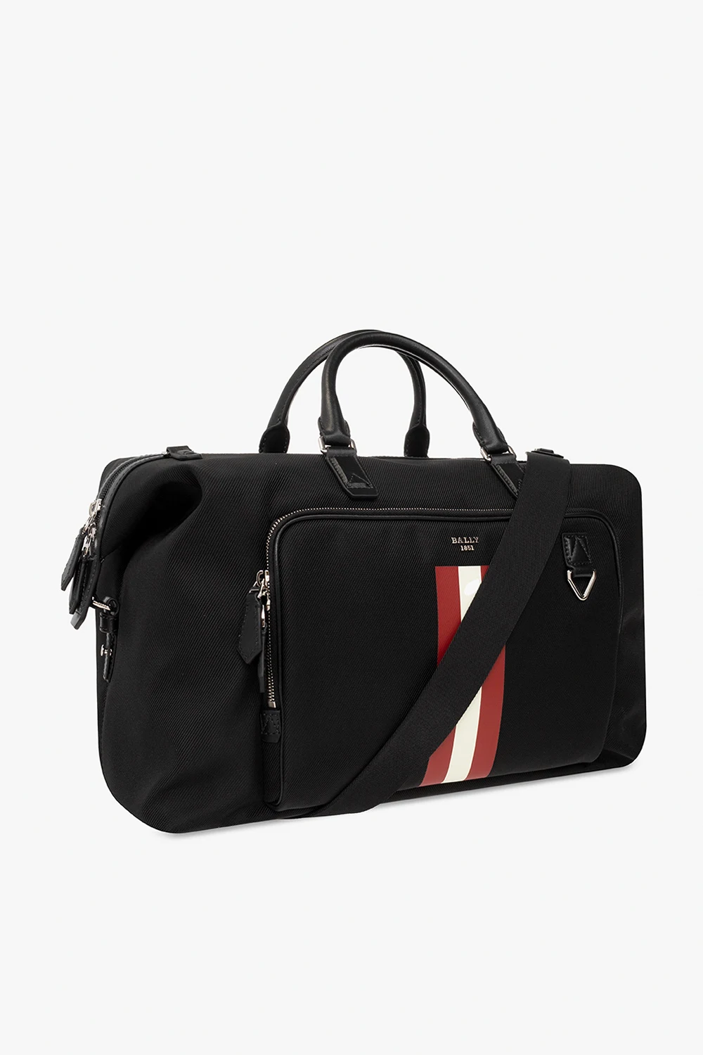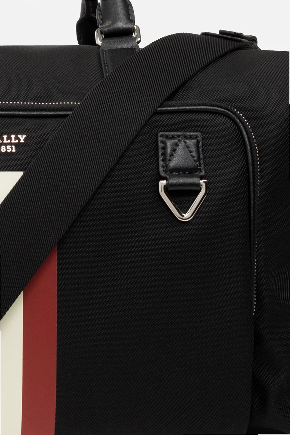 Czarna torba podręczna, model ‘Zeedio’ Bally. Wykonana z materiału i wykończona skórą. Zamykana na dwubiegunowy zamek. Z przodu nadrukowany, charakterystyczny dla marki pas w kolorze czerwono-biało-czerwonym oraz metalowa aplikacja w kształcie logo. Z przodu kieszeń z zamknięciem na dwubiegunowy zamek. Z tyłu uchwyt. Dwie półokrągłe rączki oraz odpinany pas na ramię. Wewnątrz komora z dwoma kieszeniami: wsuwaną oraz zamykaną na zamek. Metalowe wykończenie w kolorze srebrnym.