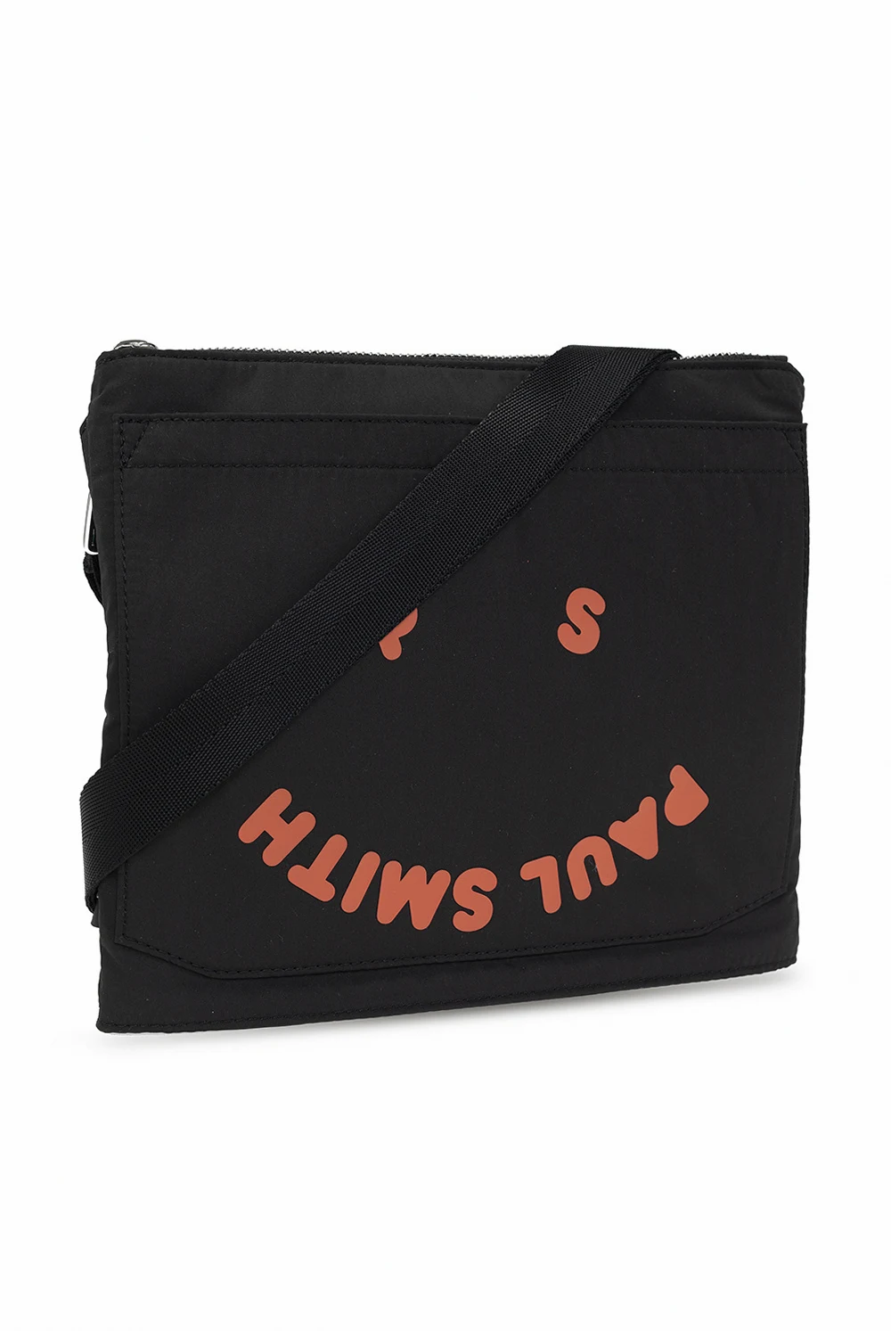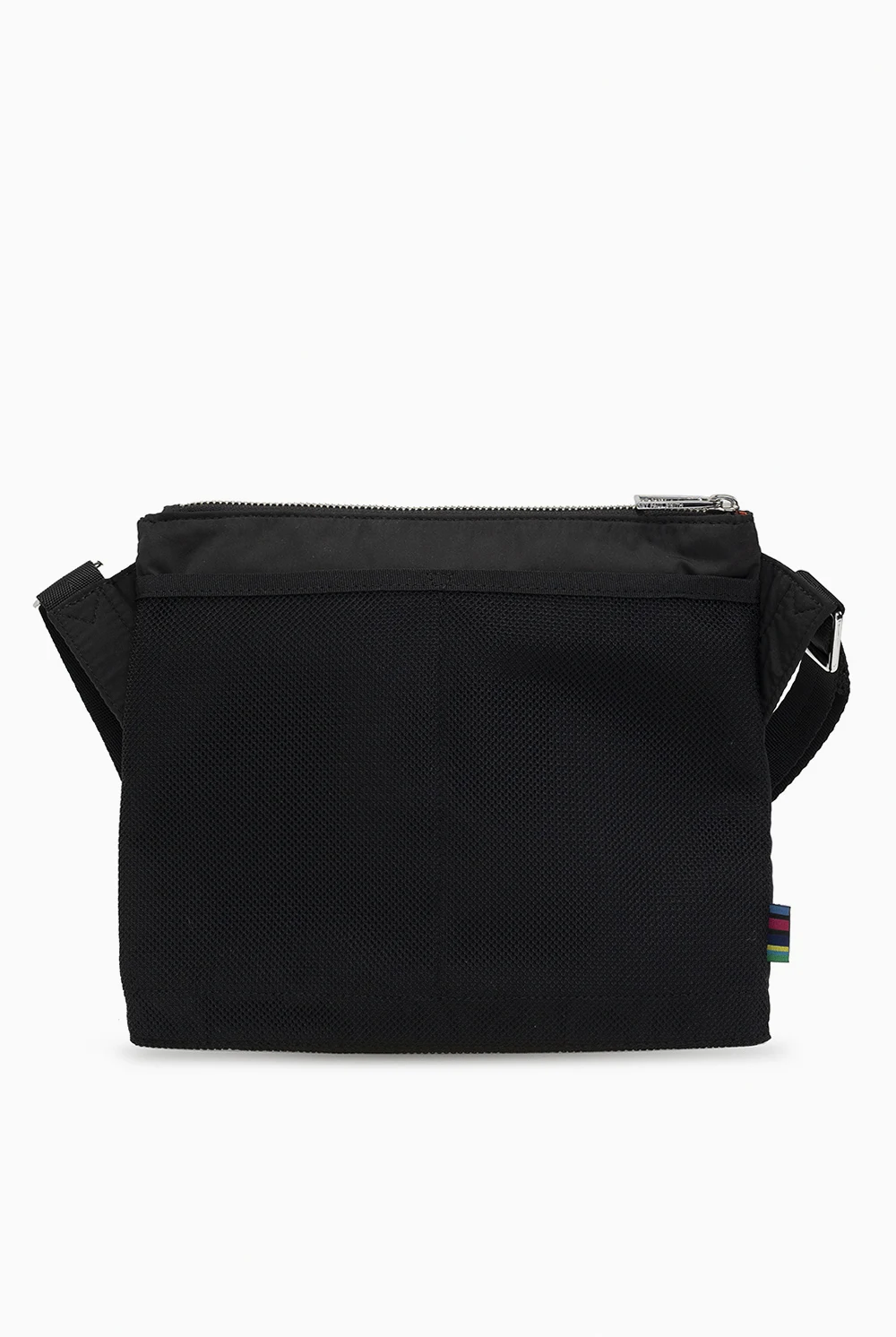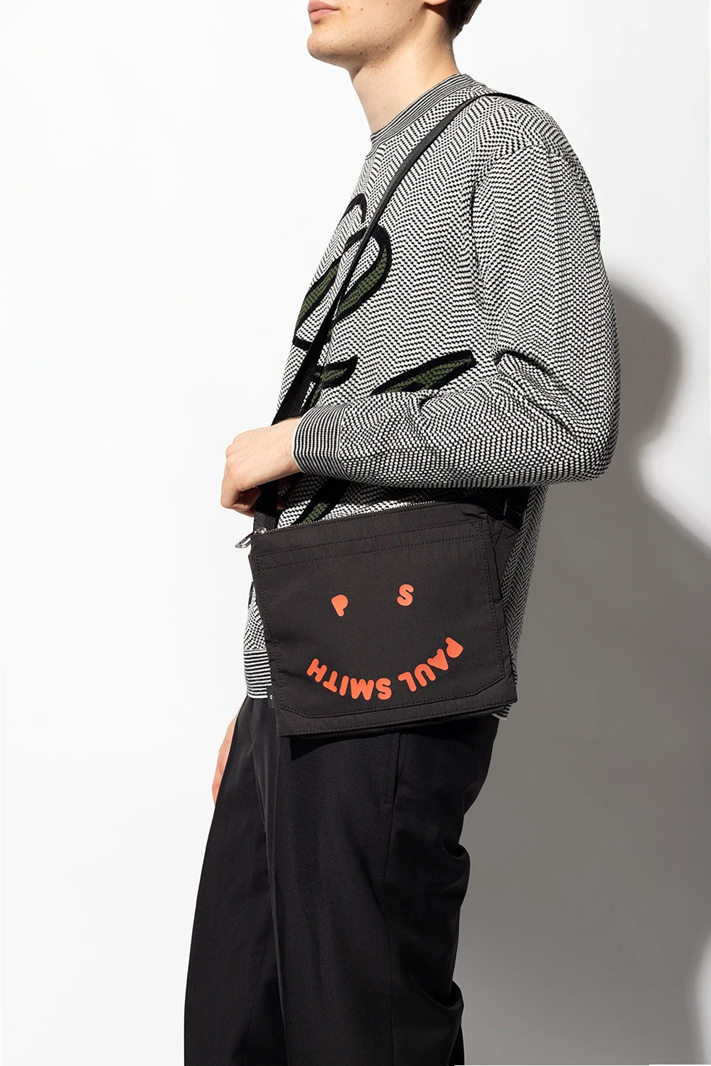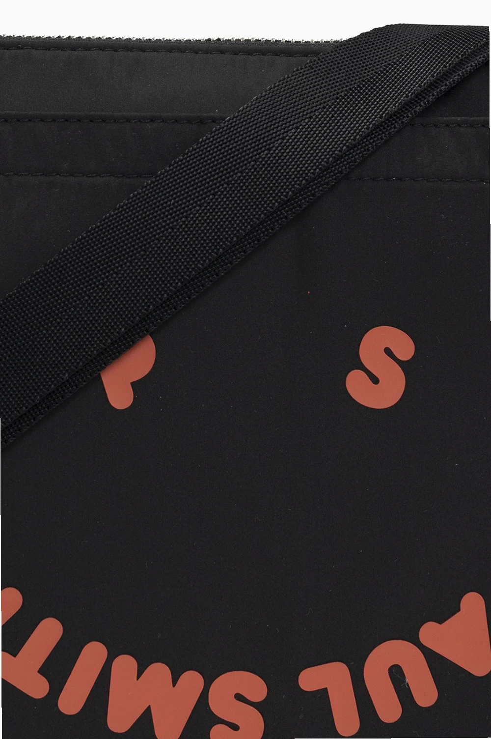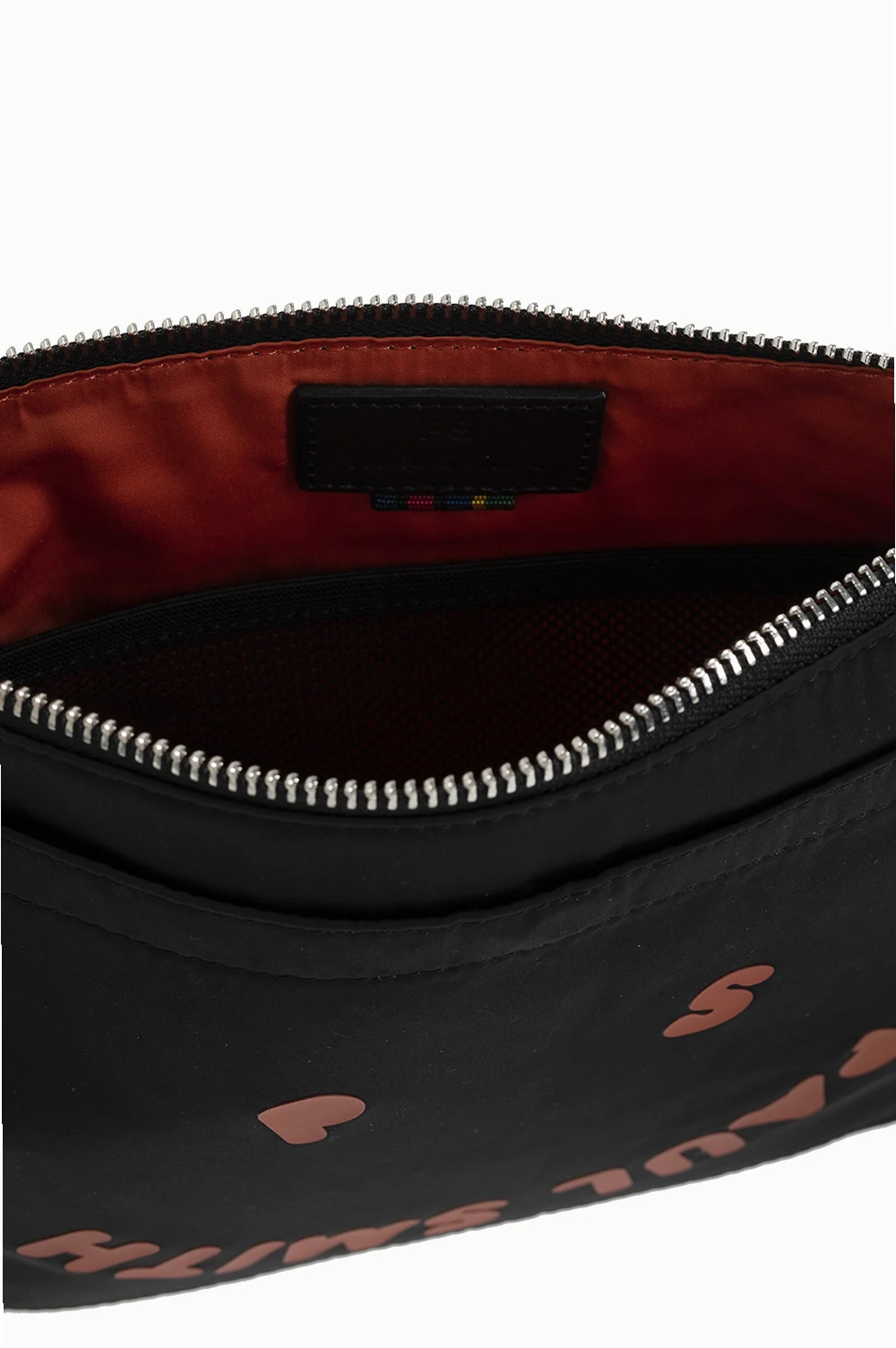 Czarna torba na pas PS Paul Smith. Zamykana na zamek. Z przodu nadrukowane czerwone logo. Z tyłu dwie wsuwane, transparentne kieszenie. Regulowany pas. Wewnątrz komora i wsuwana kieszeń.