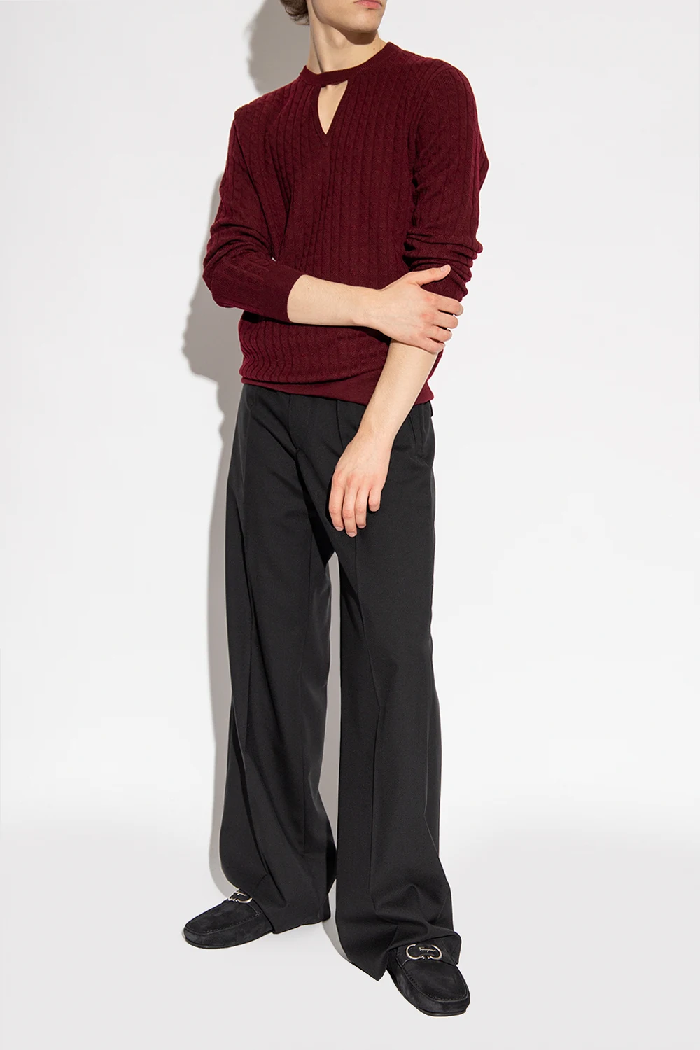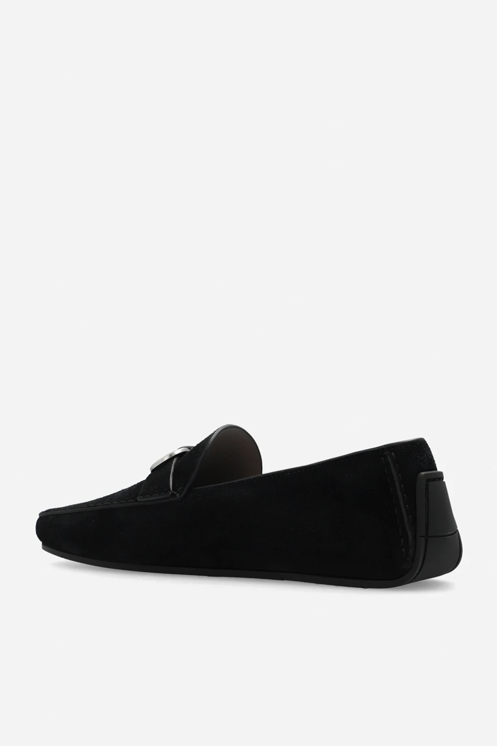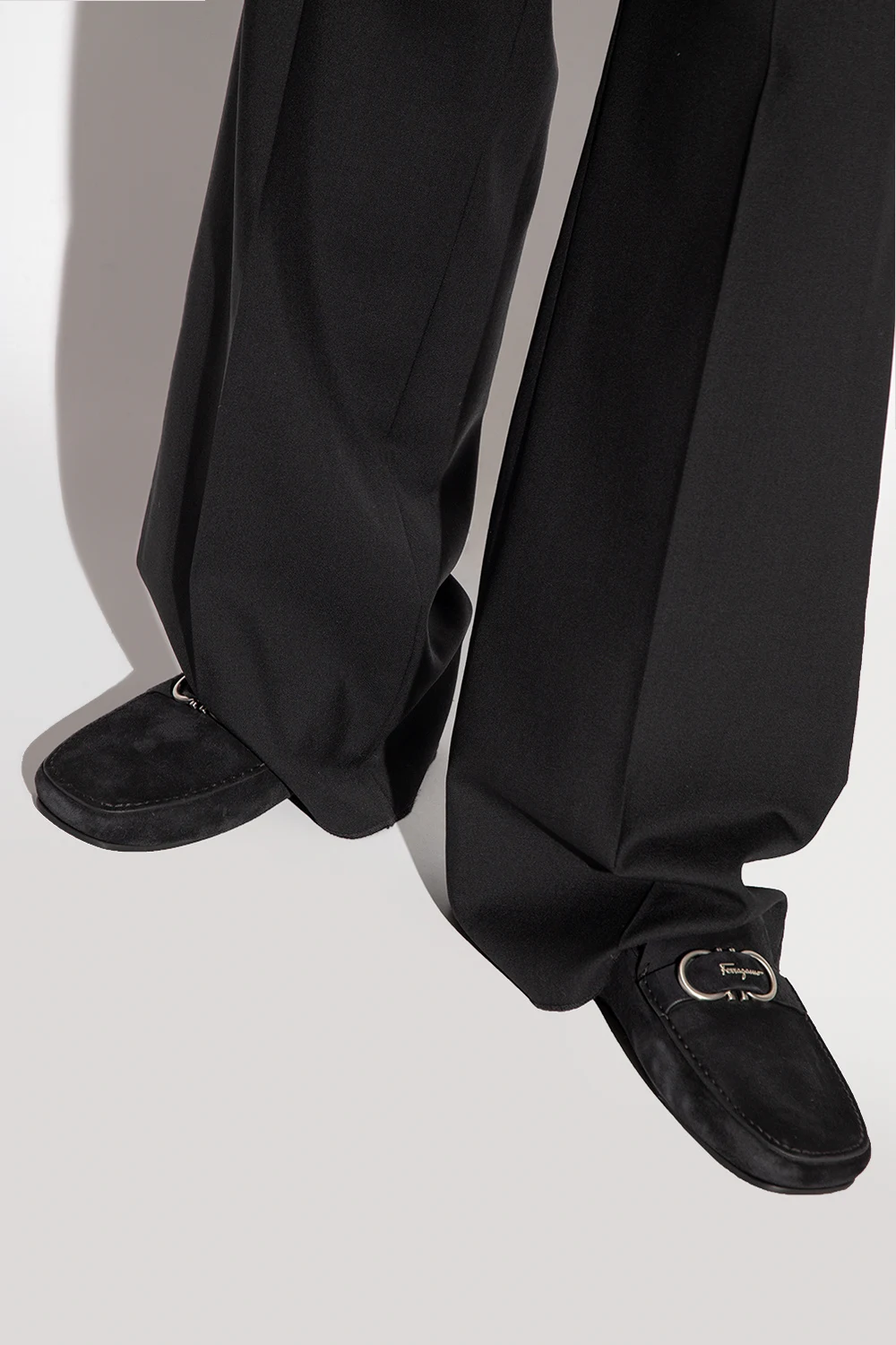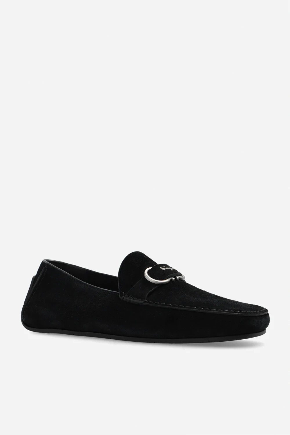 Granatowe, zamszowe mokasyny, model ‘Palinuro’ Salvatore Ferragamo. Wykonane ze skóry. Ozdobione aplikacją z logo w kolorze srebrnym. Czarna, gumowa podeszwa.