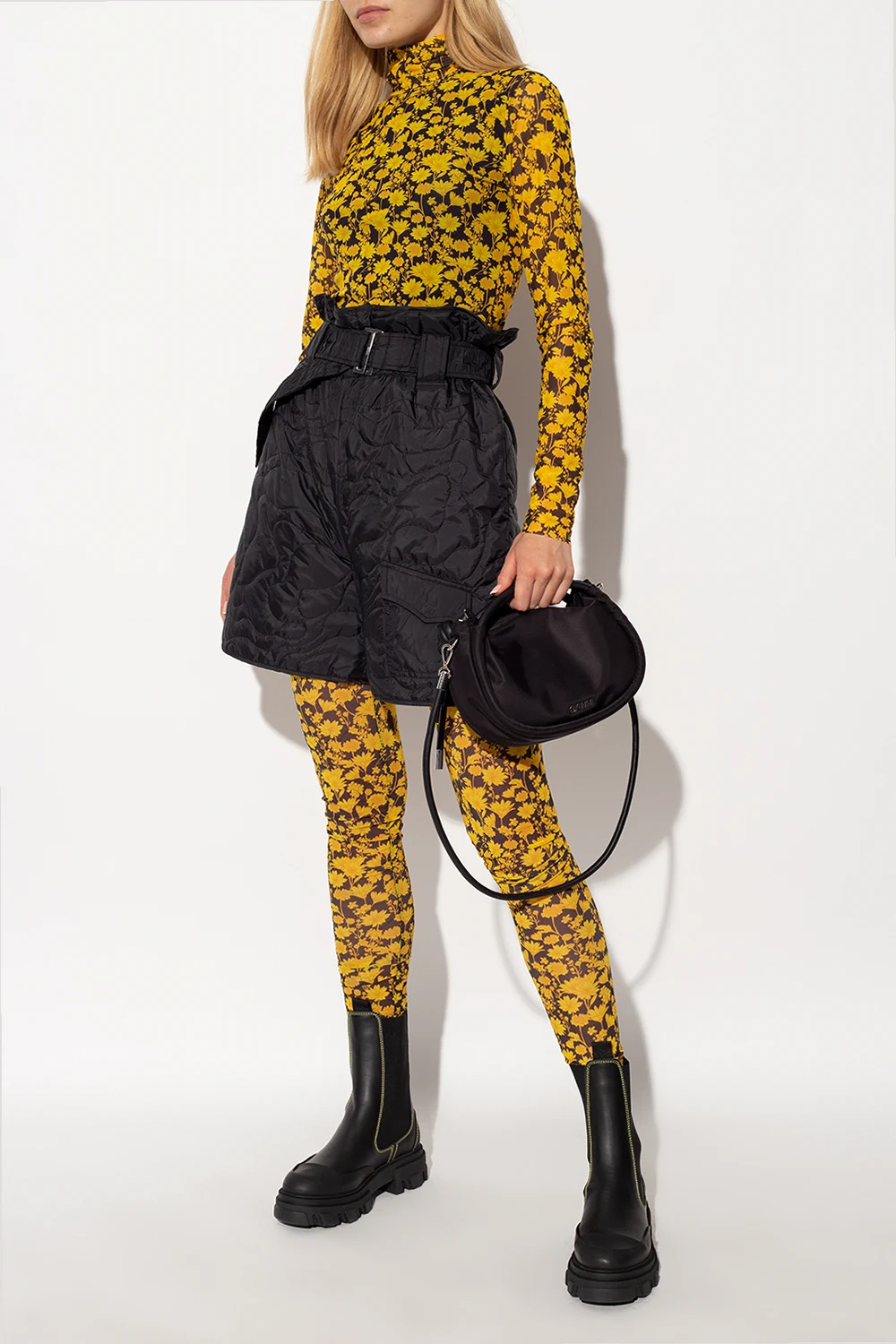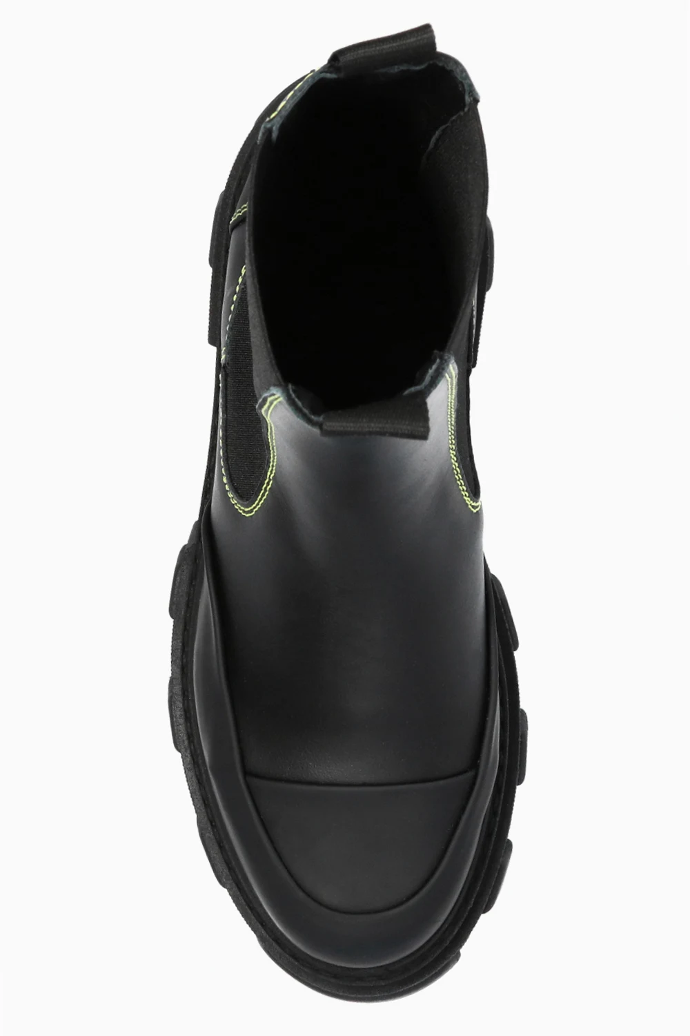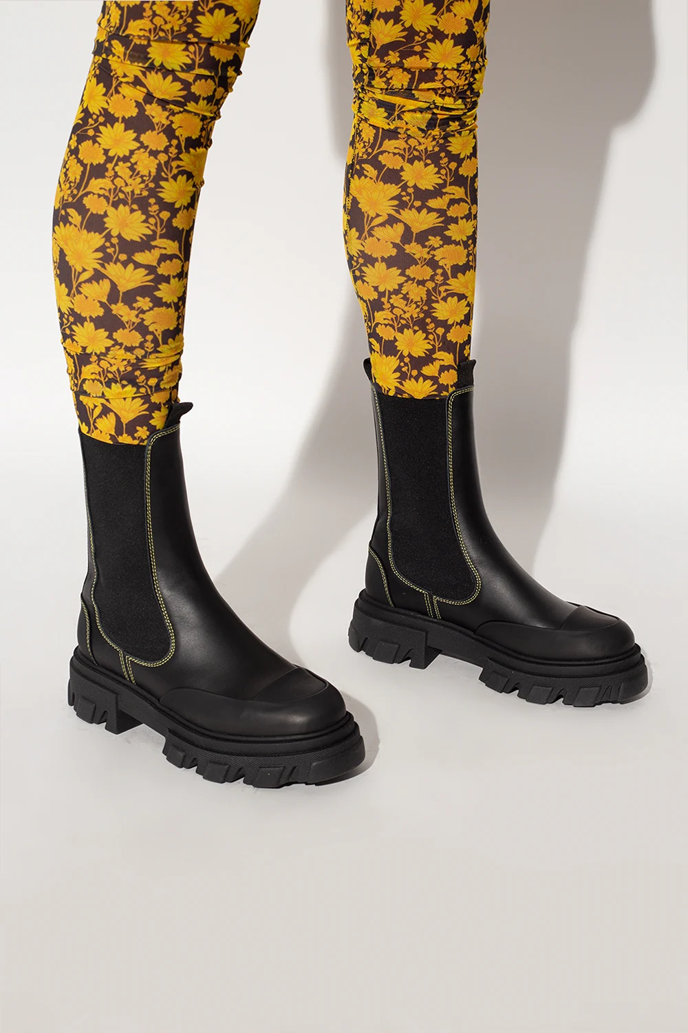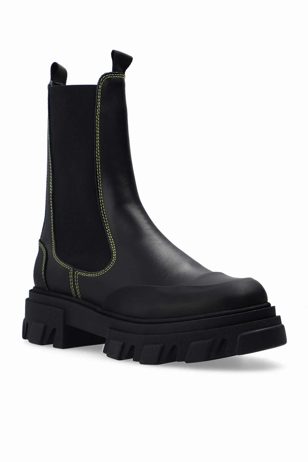 Czarne buty za kostkę typu ‘Chelsea’ Ganni. Wykonane ze skóry i gumy. Po bokach taśma elastyczna. Dekoracyjne przeszycie w kolorze żółtym. Czarna, gumowa podeszwa.