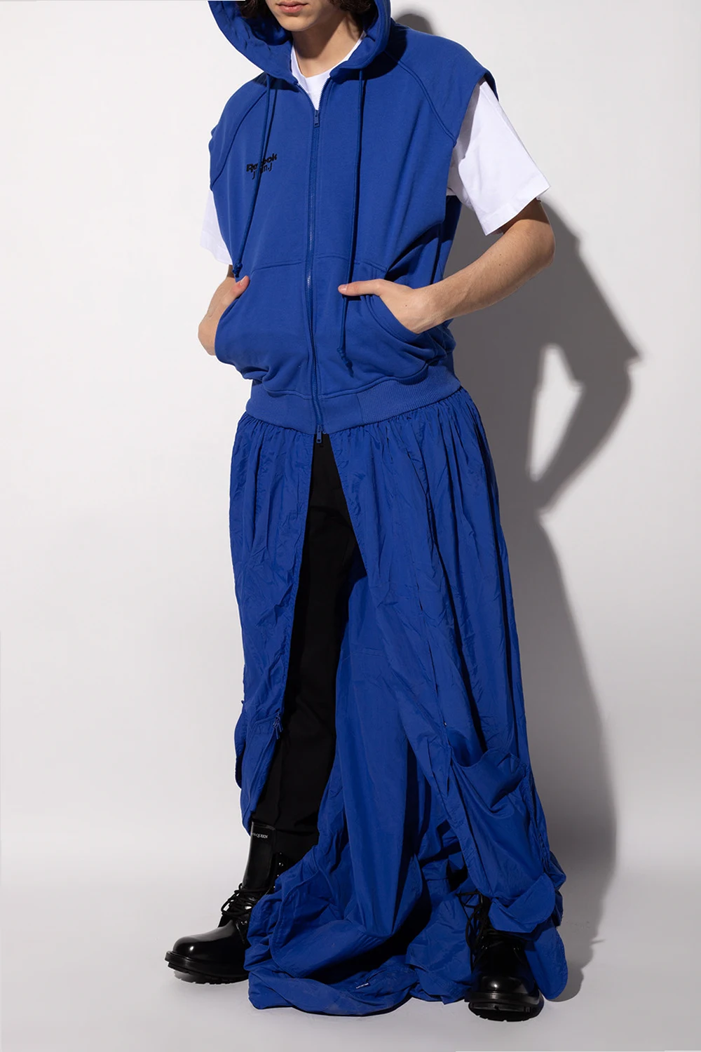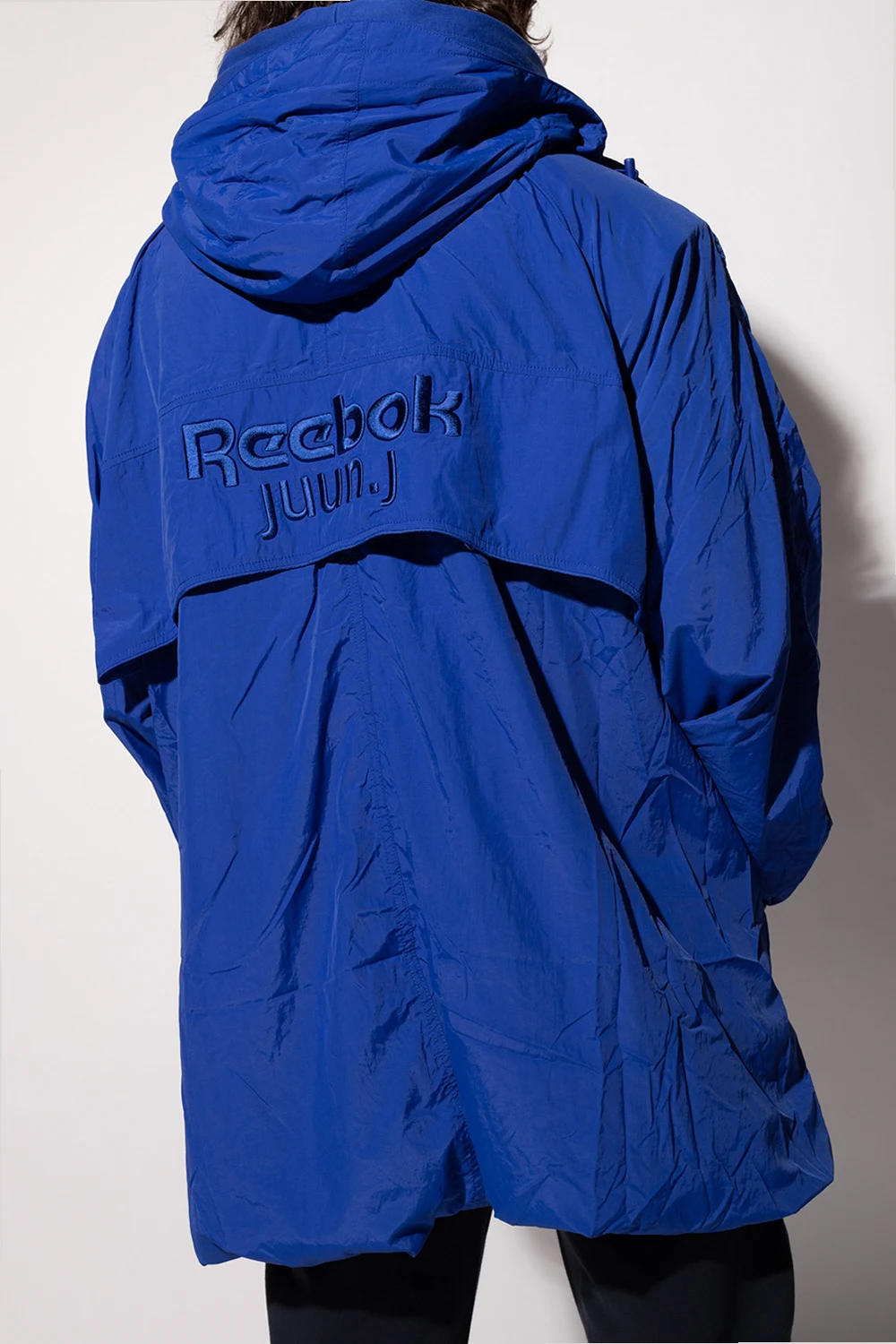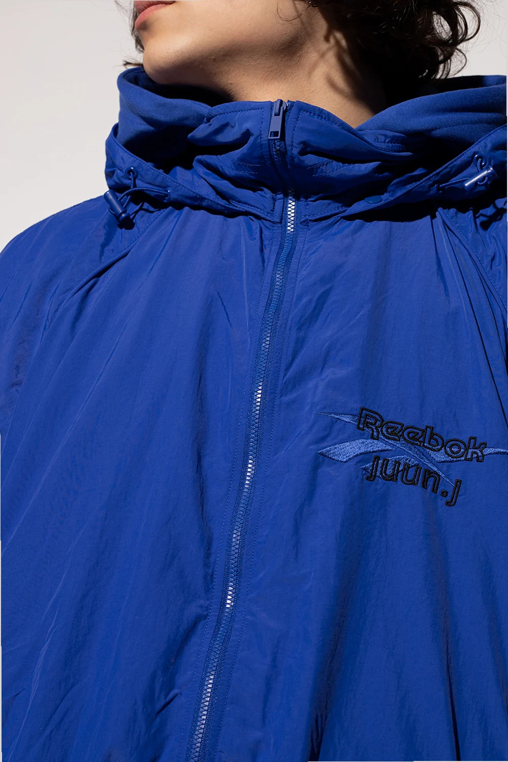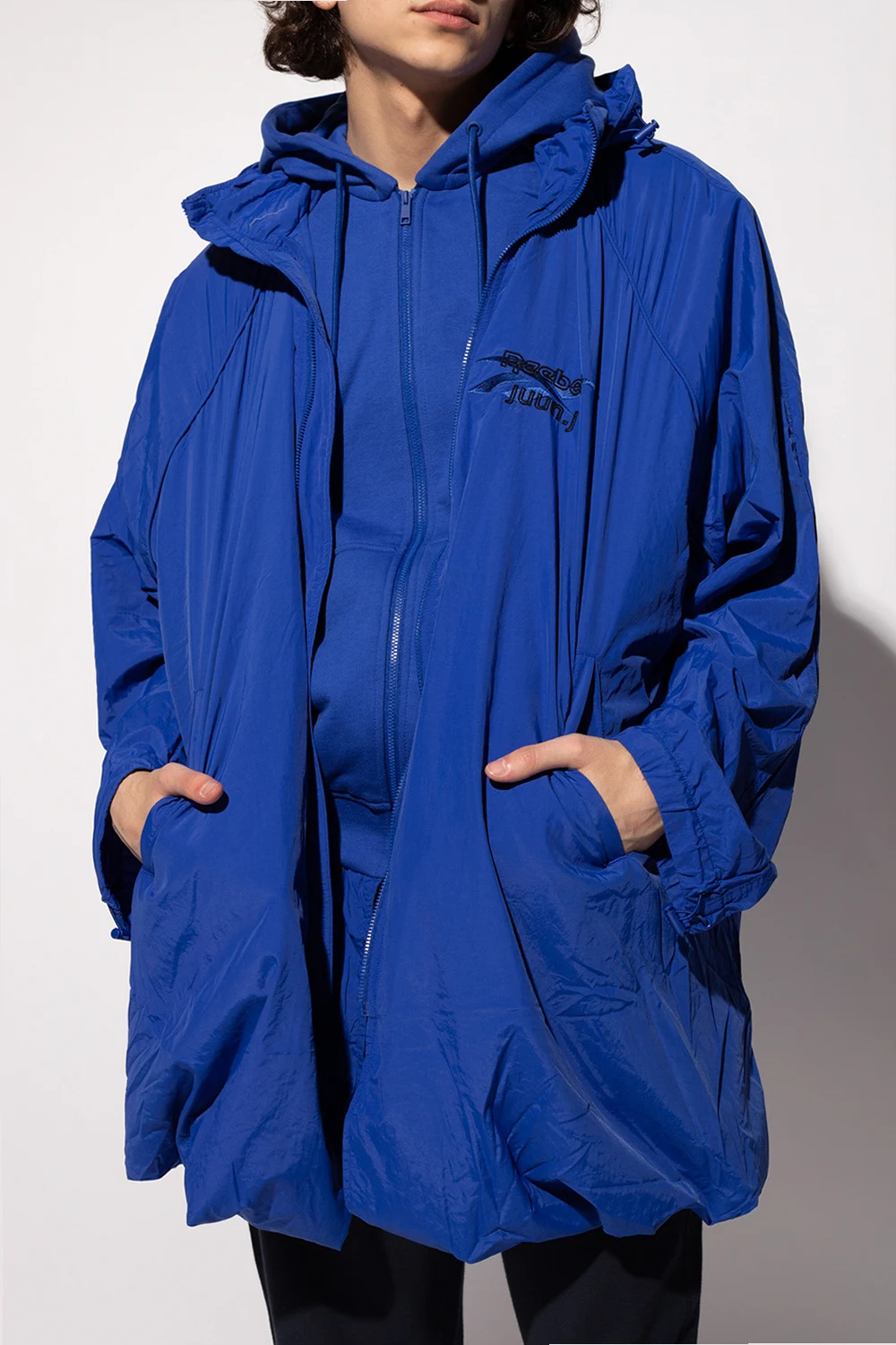 Niebieska, dwuwarstwowa kurtka Reebok x Juun.J. Wewnątrz kamizelka wykonana z bawełny. Zapinane na zamki. Podwójny kaptur ściągany trokami. Wyszyte logo. Cztery wsuwane kieszenie. Zakończona ściągaczami.
