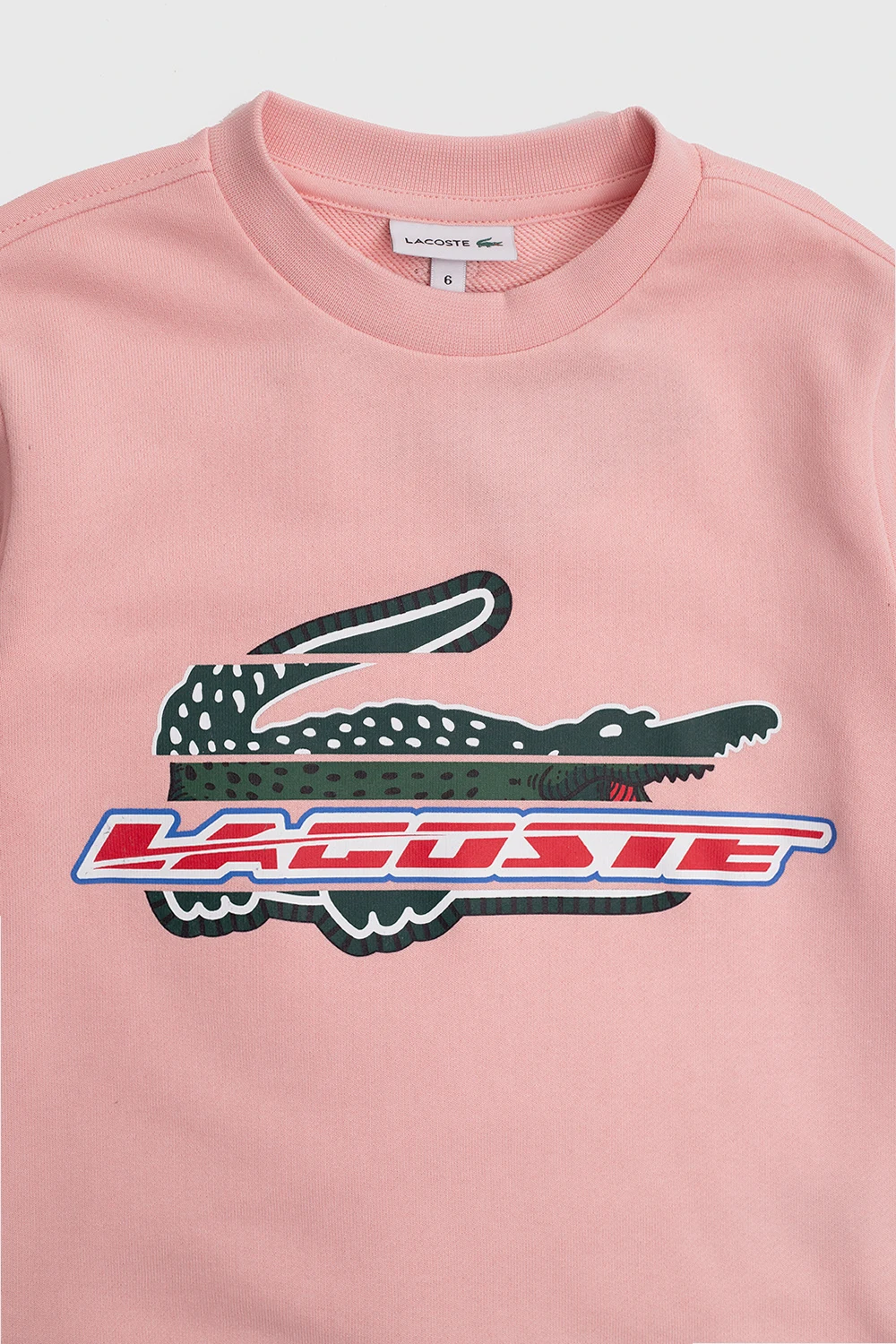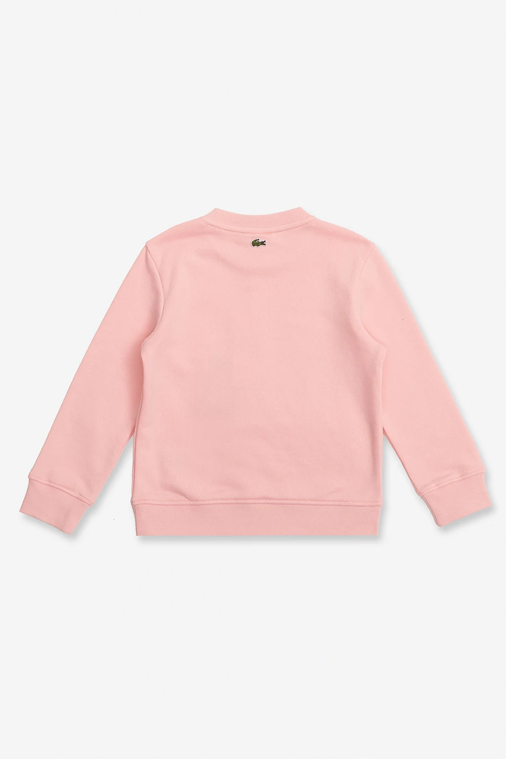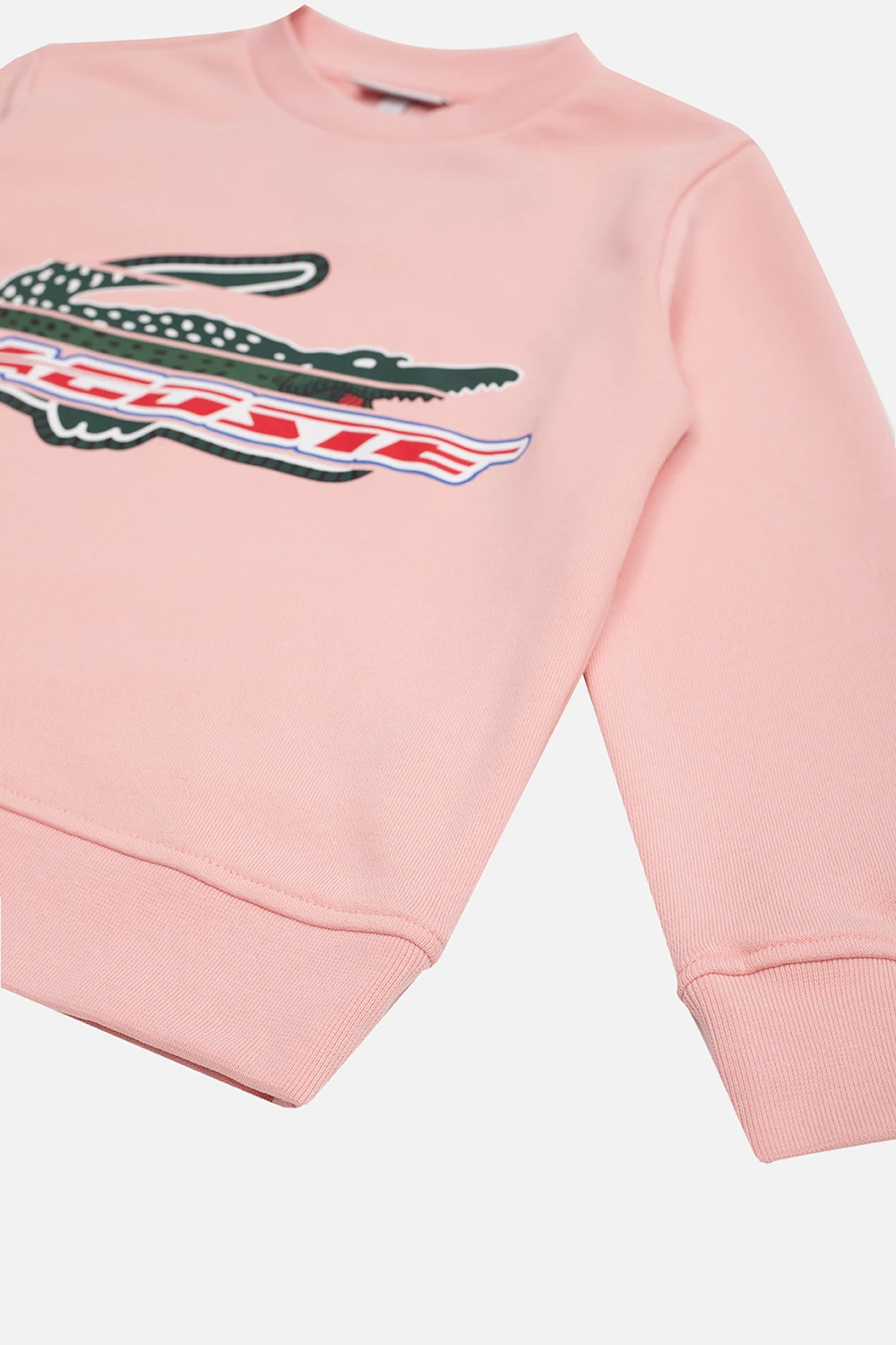 Różowa, bawełniana bluza Lacoste Kids. Z przodu ozdobiona kolorowym nadrukiem z logo. Okrągły dekolt, długie rękawy i dół zakończone ściągaczem.