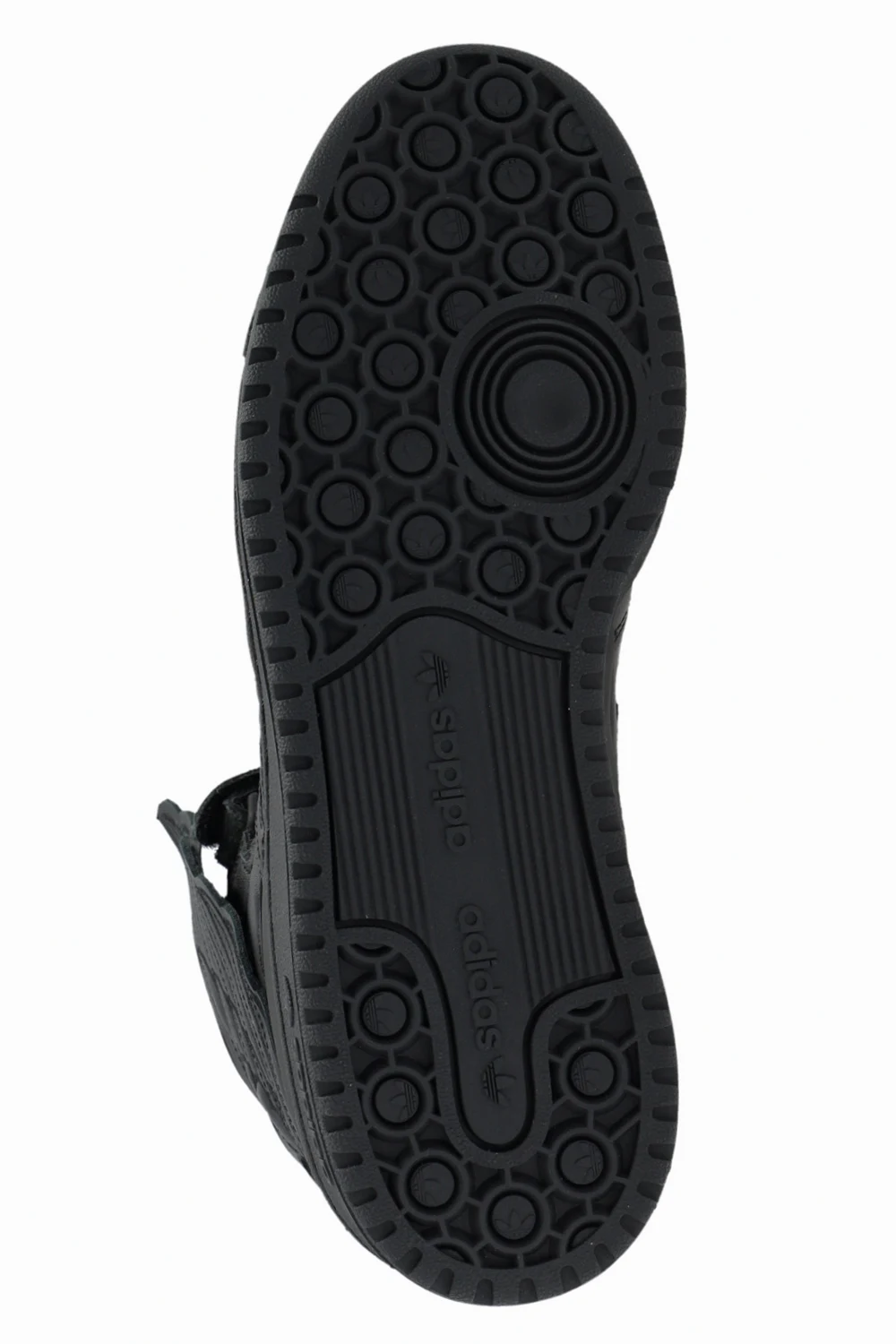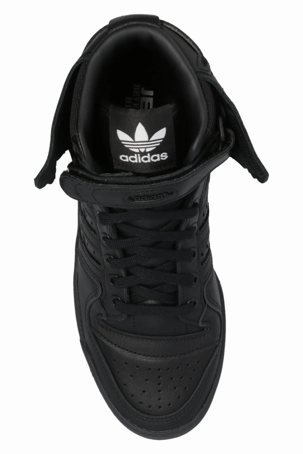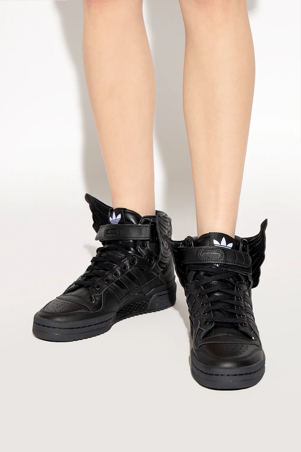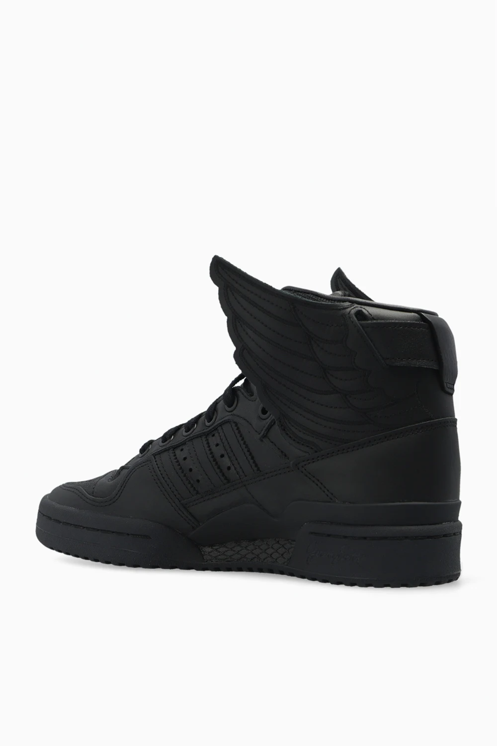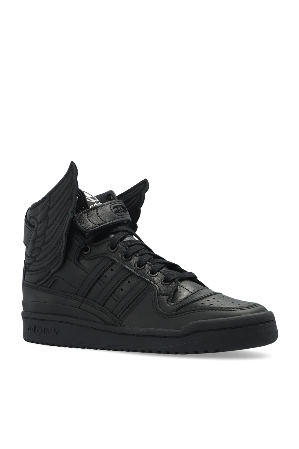 Czarne, sznurowane buty sportowe za kostkę, model ‘JS Wings’ ADIDAS Originals x Jeremy Scott. Wykonane ze skóry. Ozdobione charakterystycznymi dla marki pasami oraz aplikacją w kształcie skrzydeł. Czarna, gumowa podeszwa.