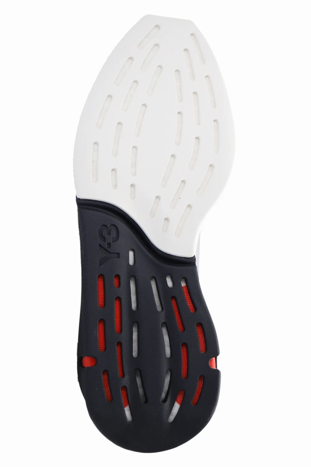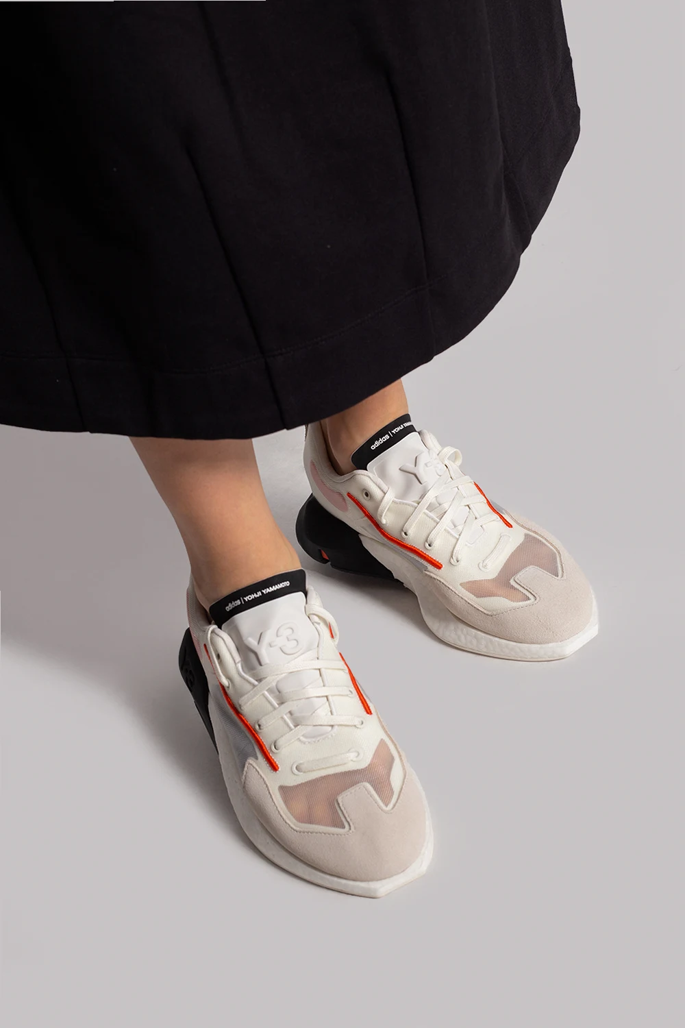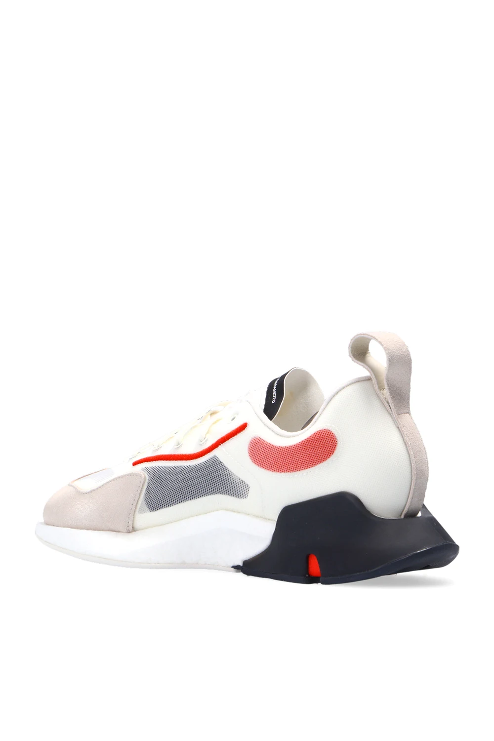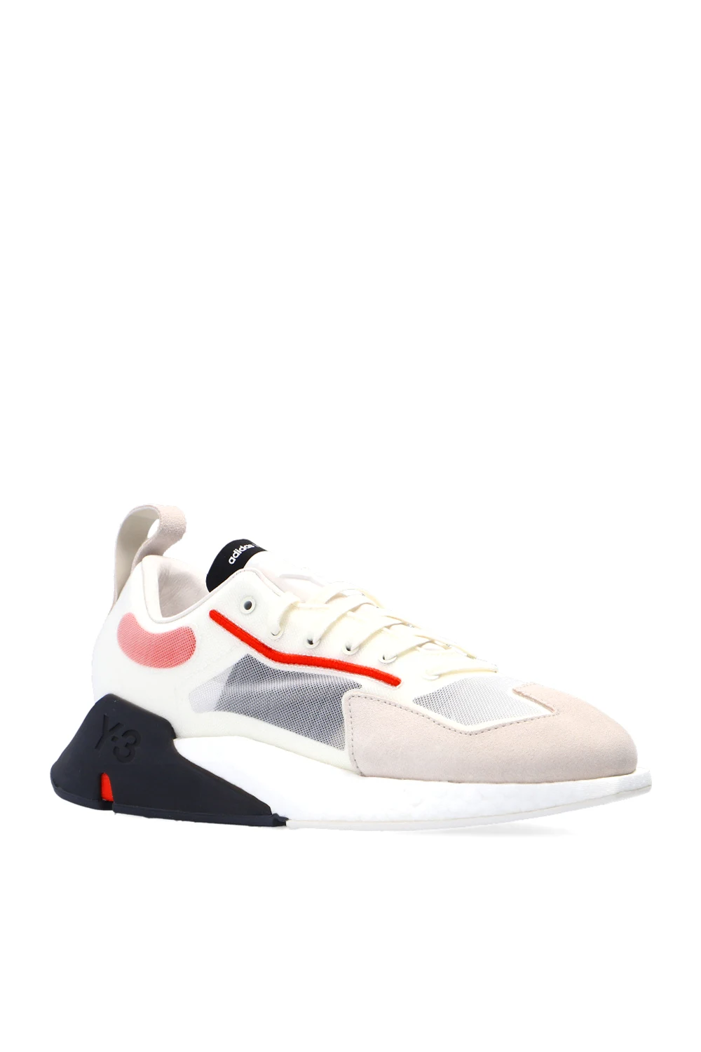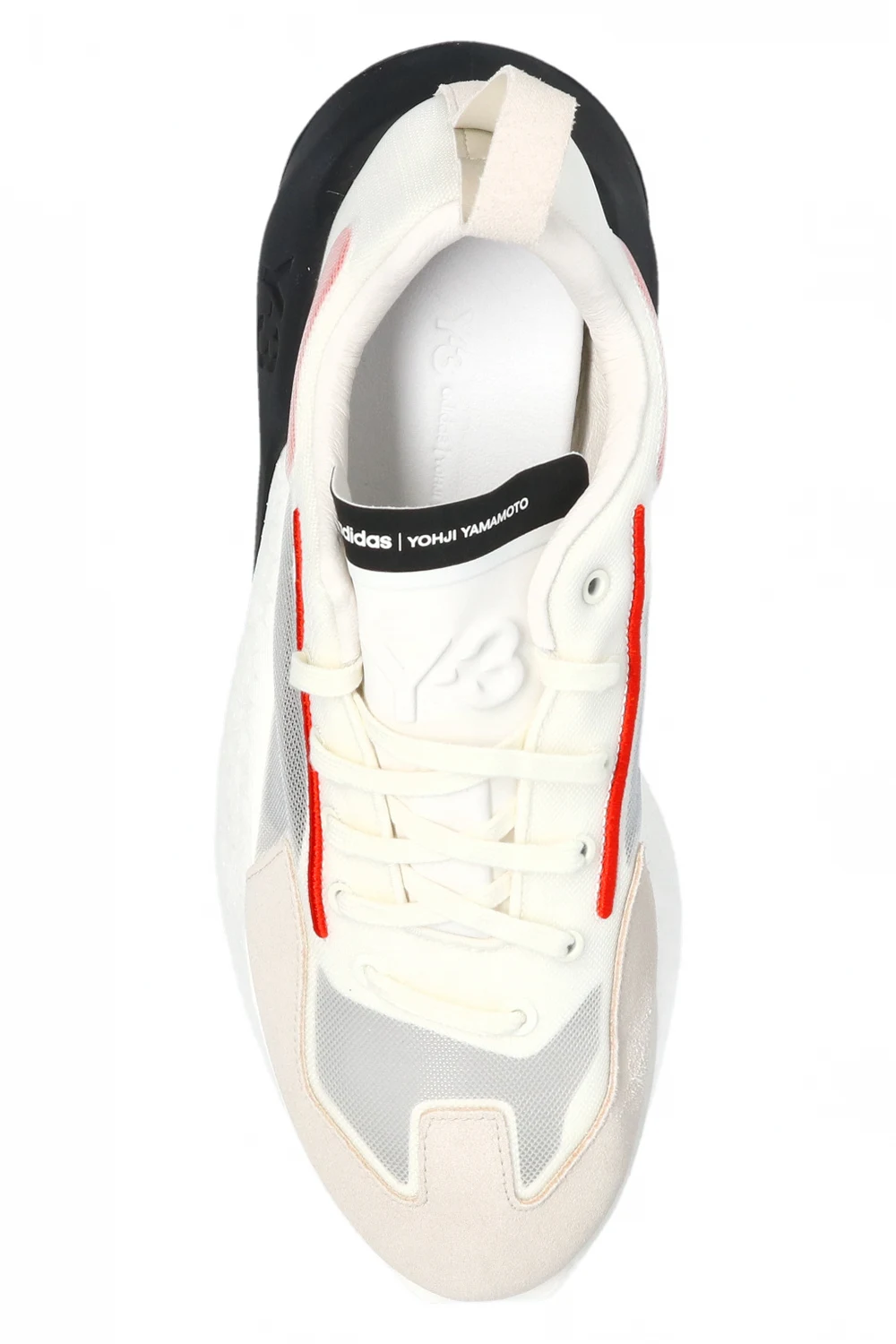 Kremowo-beżowe, sznurowane buty sportowe, model ‘Orisan’ Y-3 Yohji Yamamoto. Wykonane ze skóry i gumy. Ozdobione dekoracyjnymi wstawkami w kolorze czarno-czerwonymi. Biało-czarna, gumowa podeszwa.