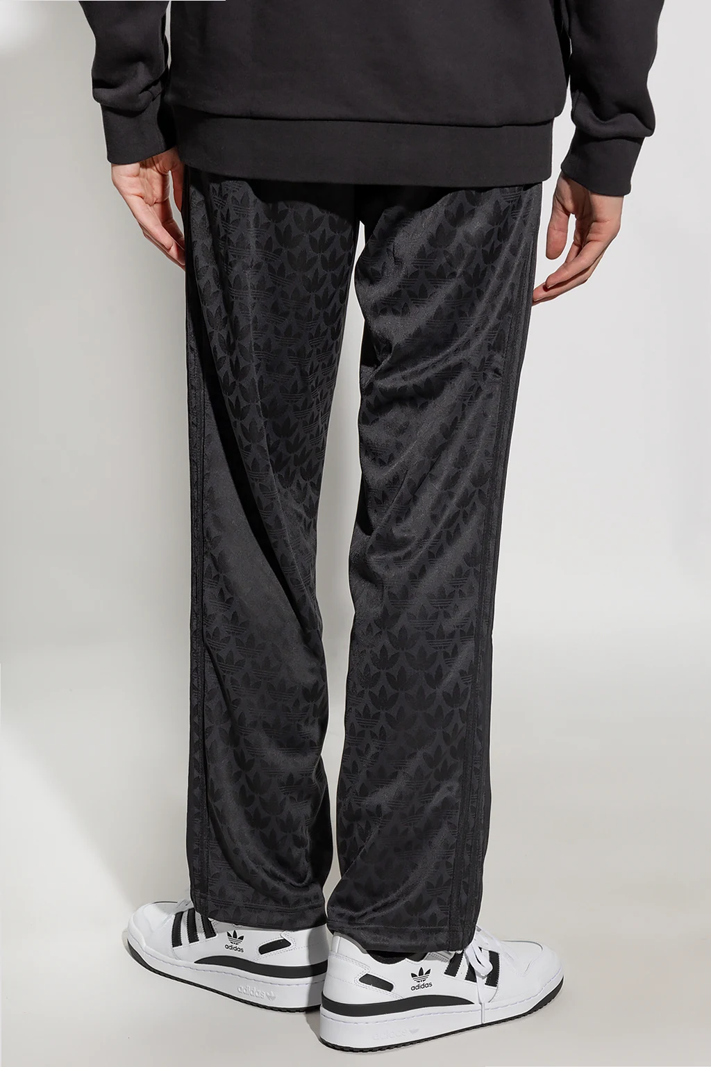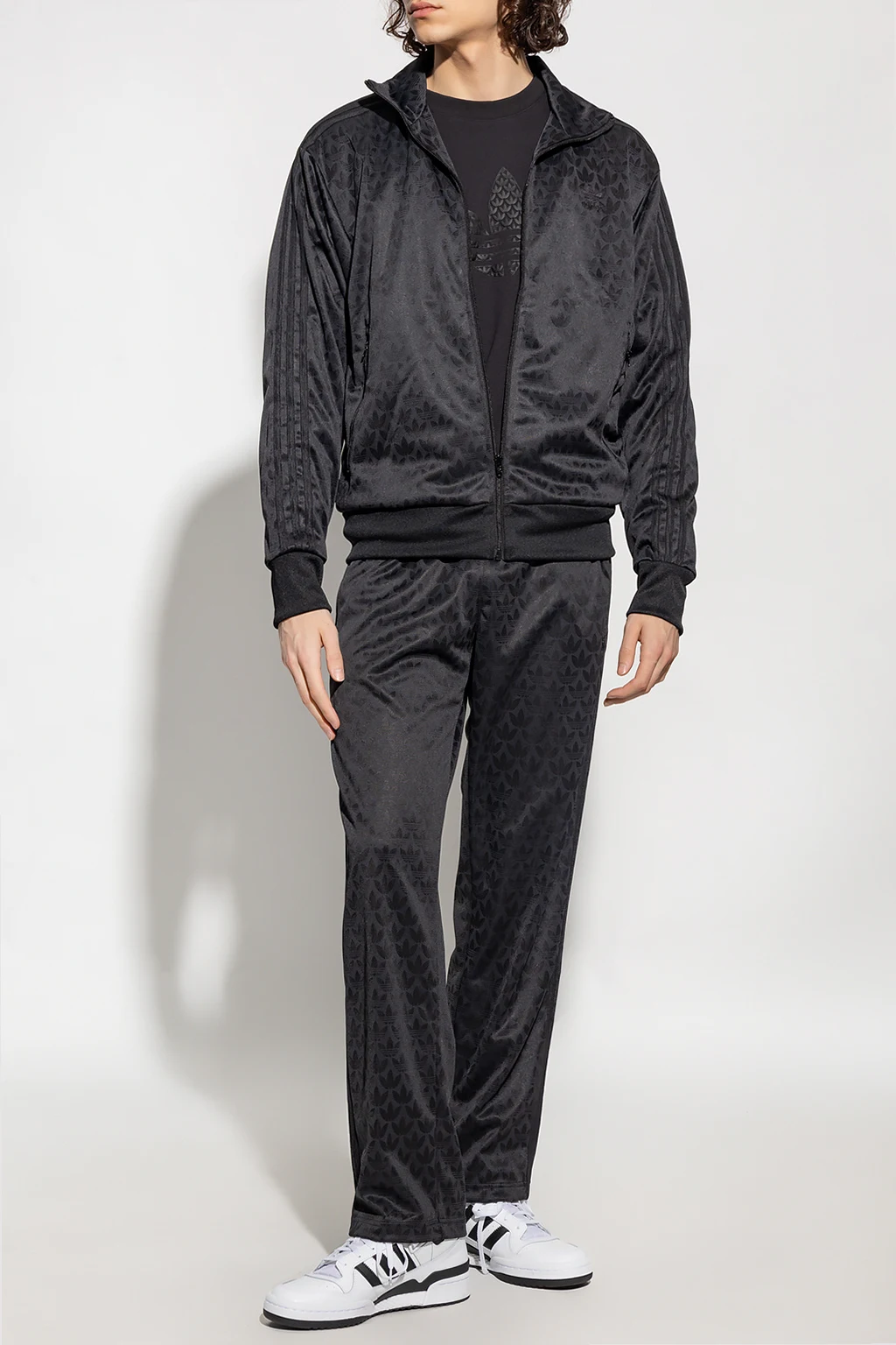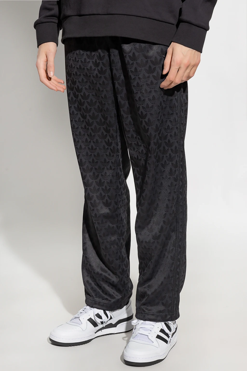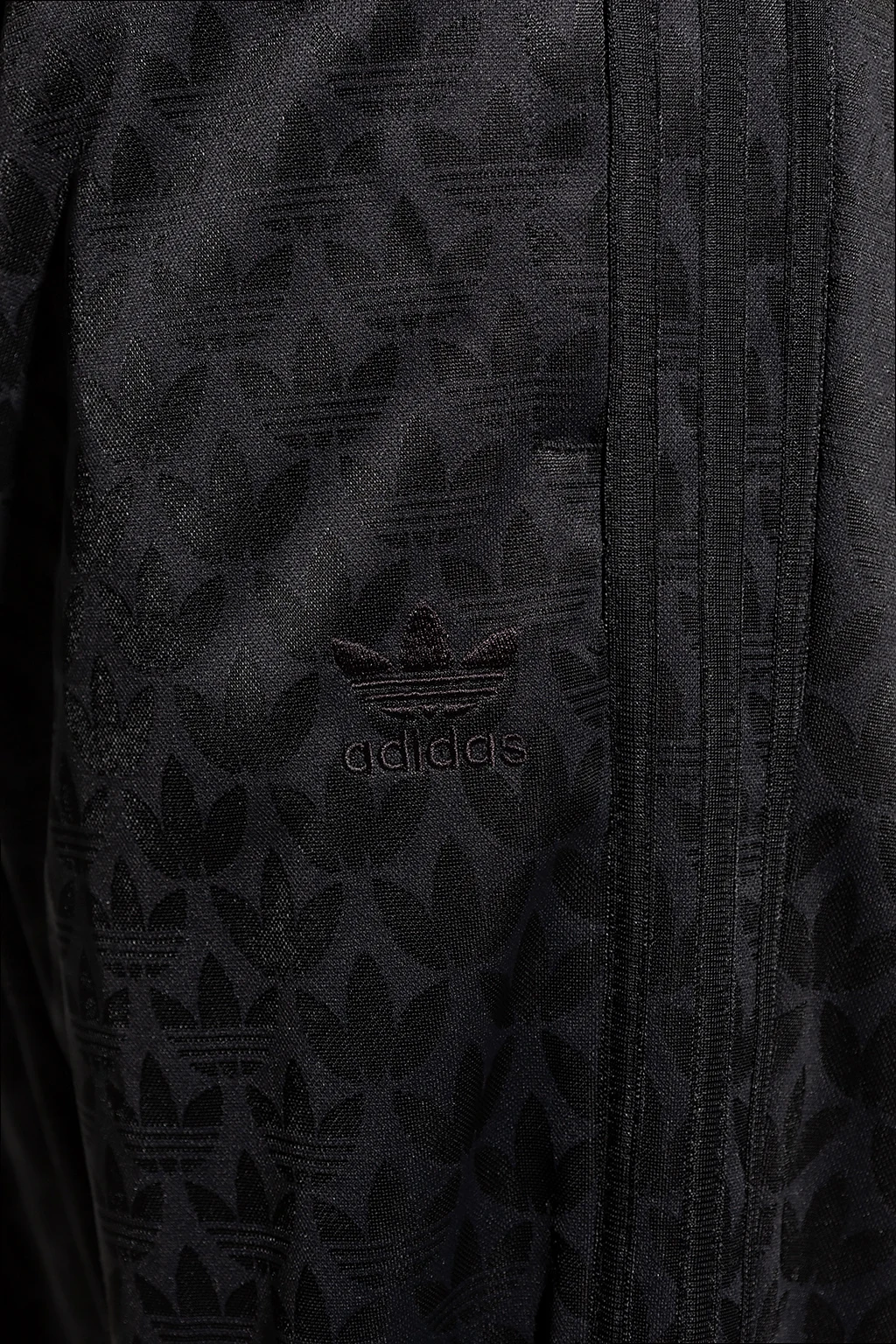 Czarne spodnie dresowe ADIDAS Originals. Wykonane z materiału z recyklingu. W pasie wszyta guma ściągana trokami. Ozdobione wzorem z monogramem i wyszytym logo. Dwie kieszenie zapinane na zamek. Długie nogawki o prostym kroju.
