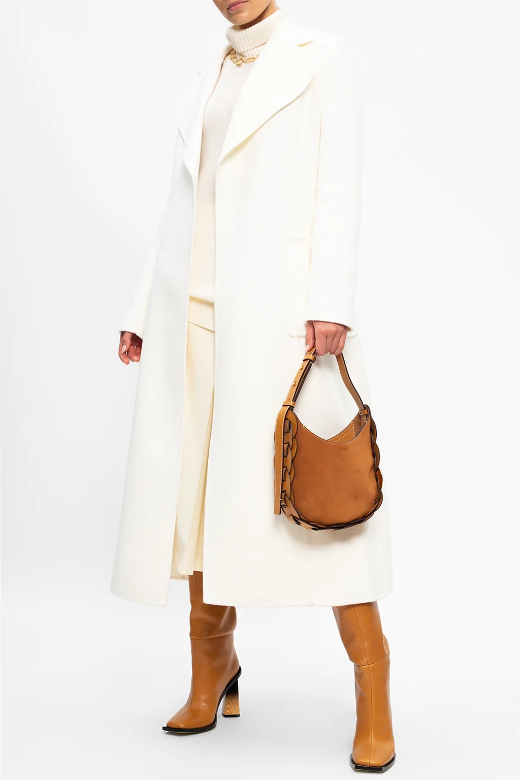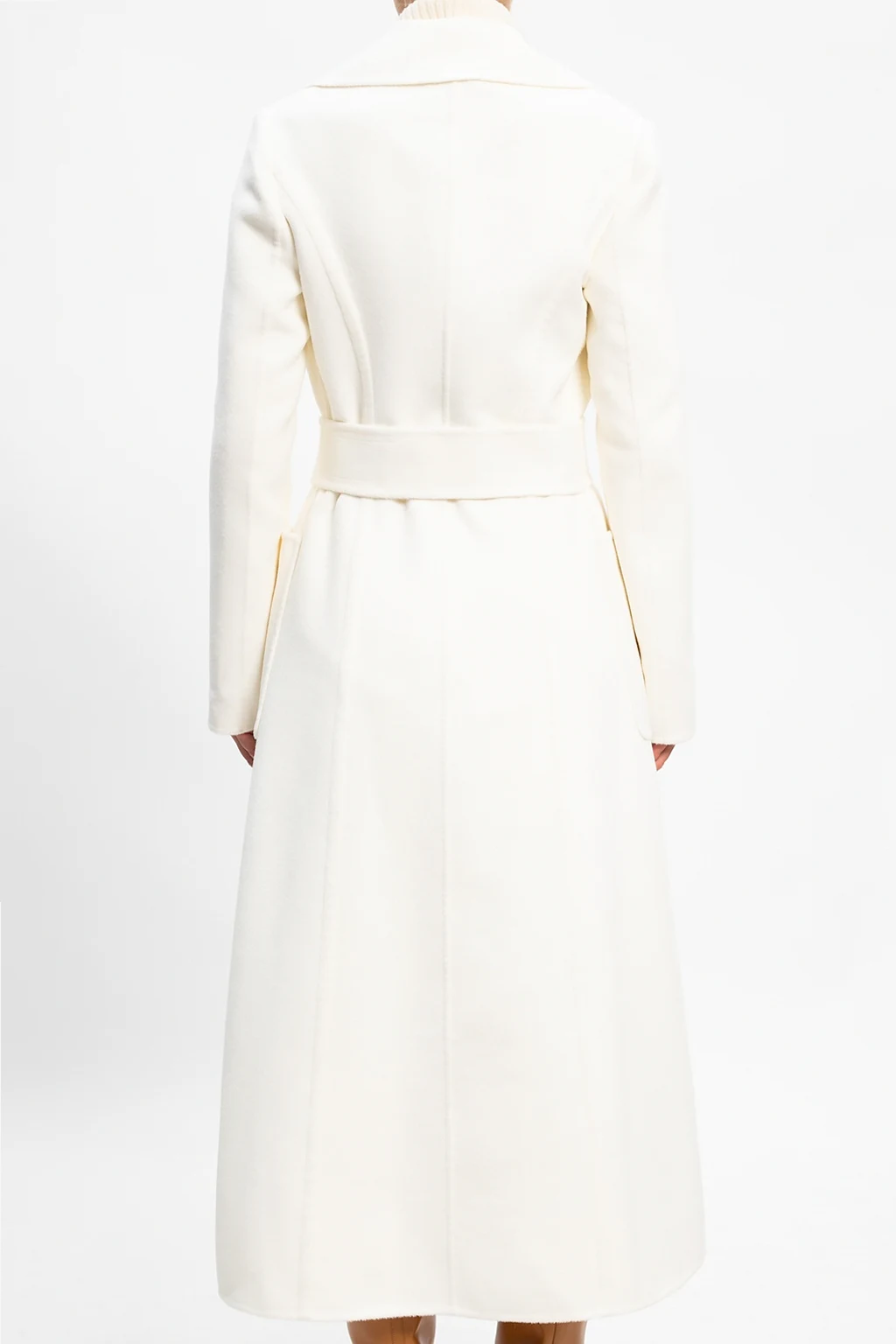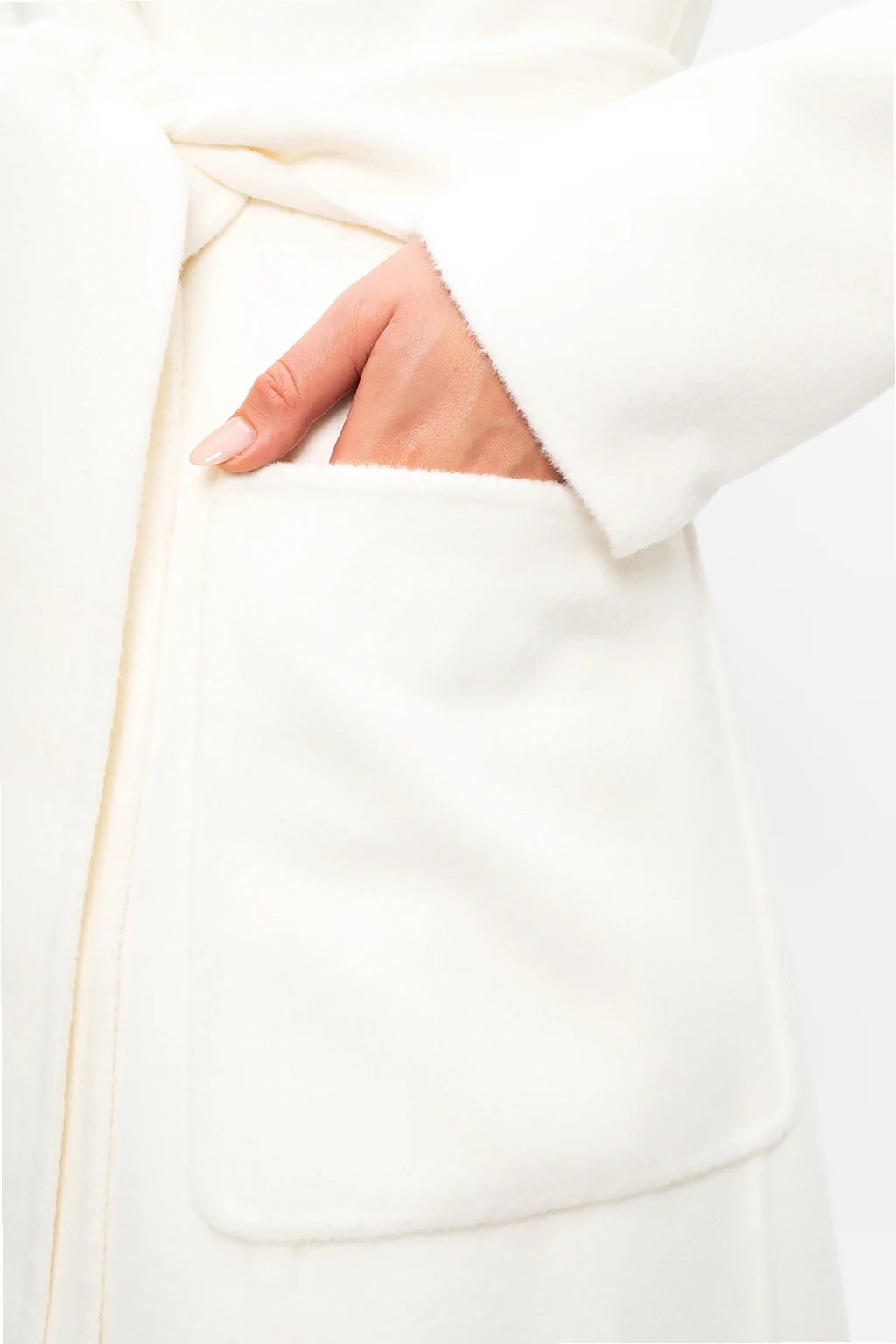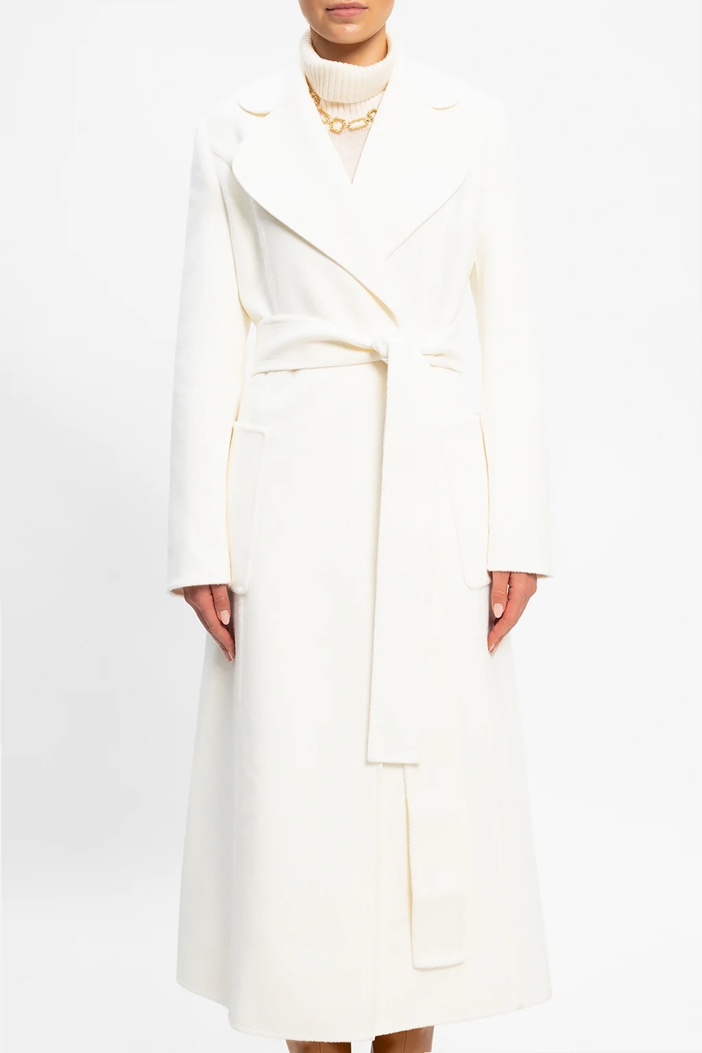 Biały płaszcz z otwartymi klapami Michael Kors. Wykończony wełną. W talii dołączony pasek. Z przodu dwie wsuwane kieszenie.
