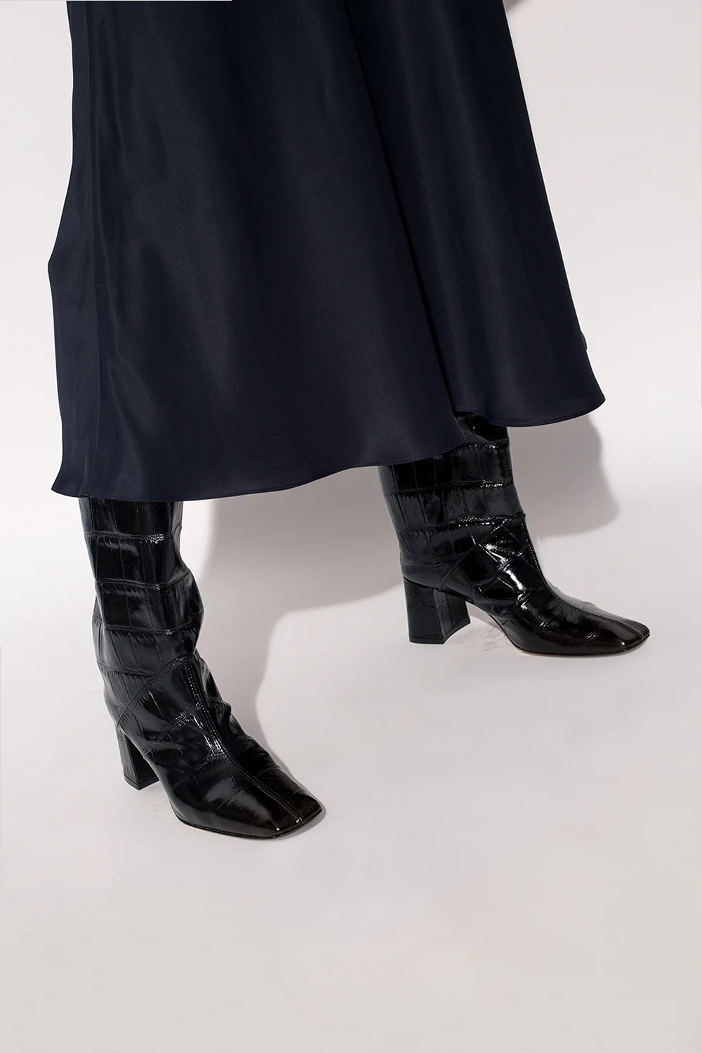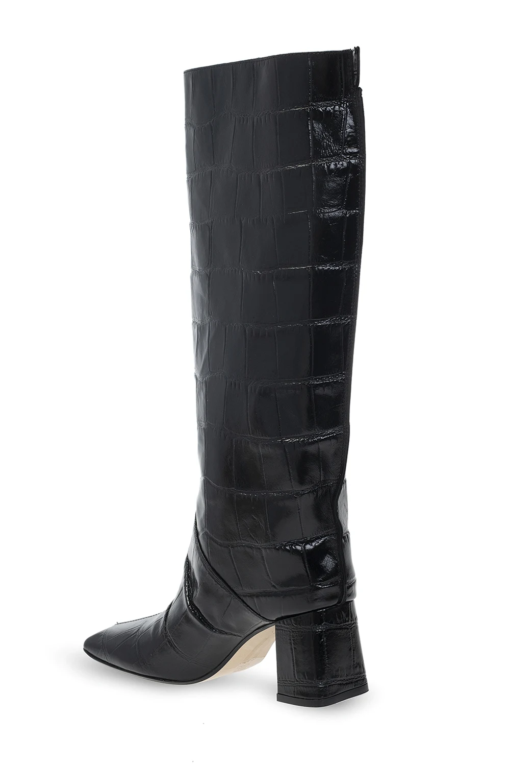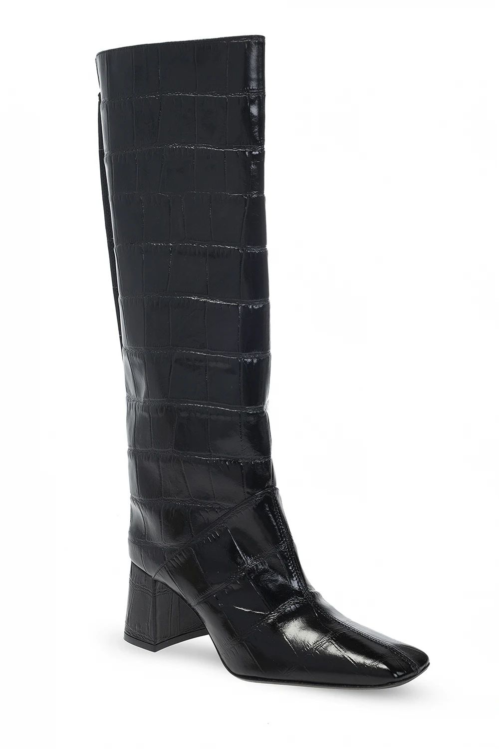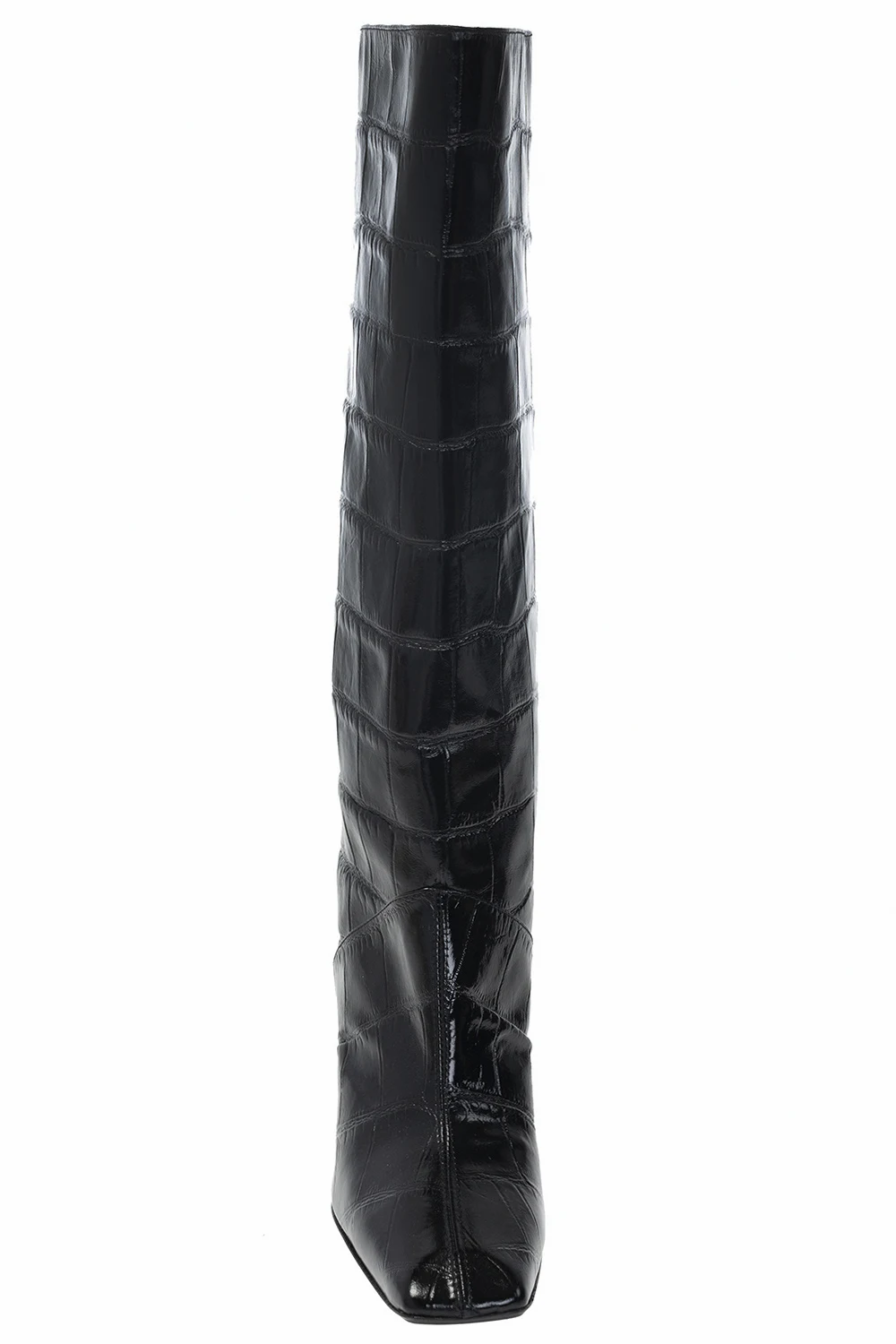 Czarne kozaki na obcasie, model ‘Finola’ Red Valentino. Wykonane ze skóry o specjalnej fakturze imitującej skórę krokodyla. Kwadratowy nosek. Beżowa, skórzana podeszwa.