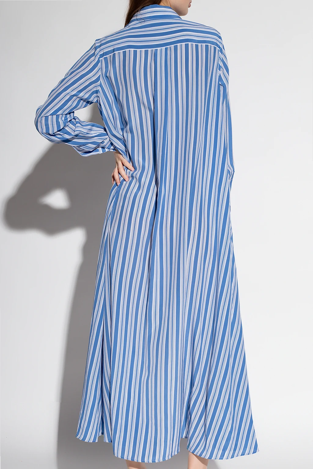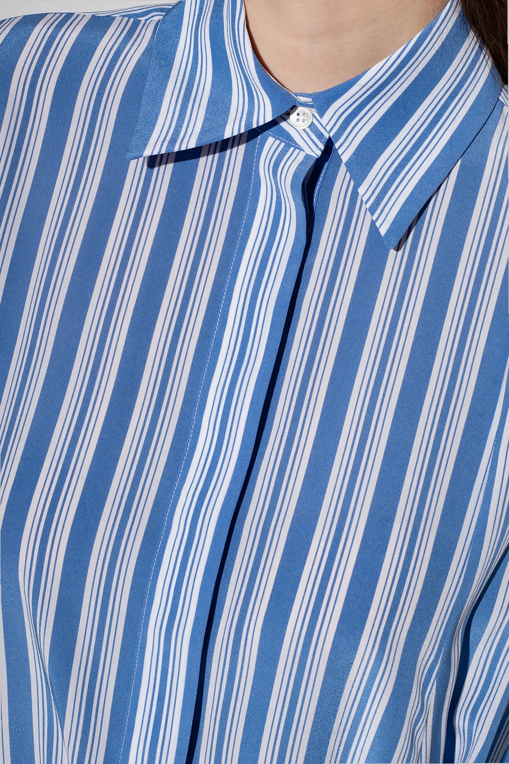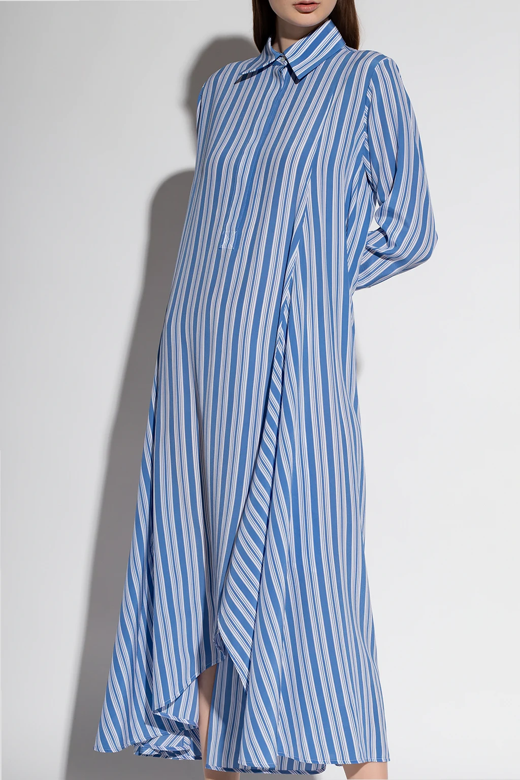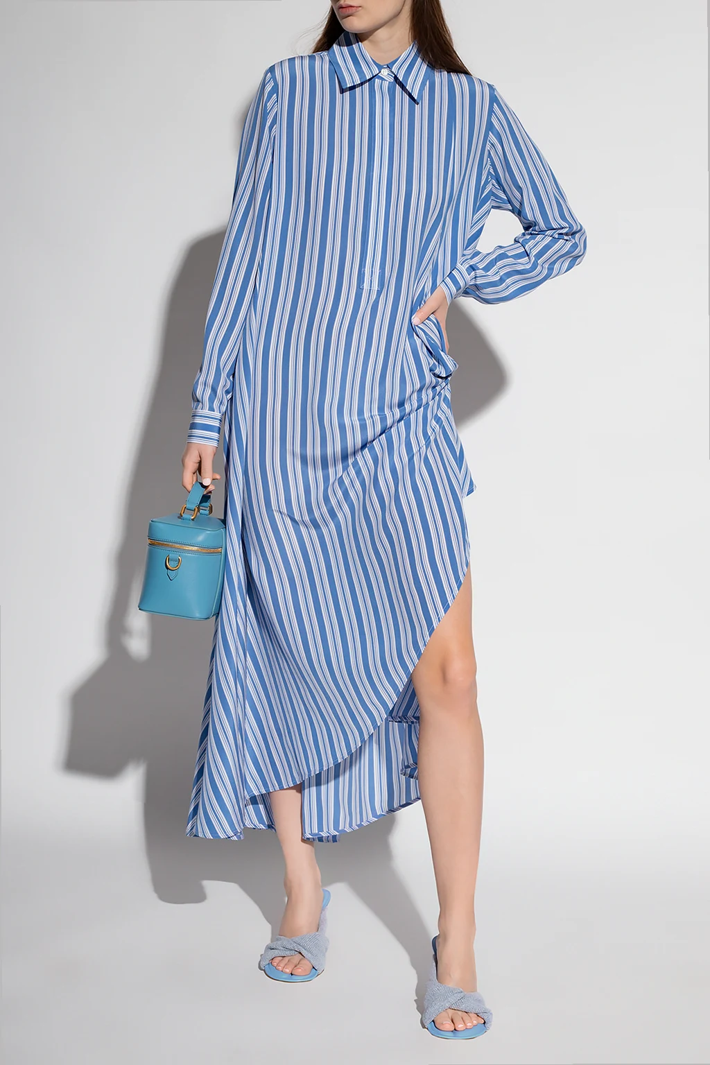 Biało-niebieska, koszulowa sukienka Michael Kors. Wykonana z jedwabiu. Zapinana na guziki z krytą plisą. Długie rękawy zakończone mankietami. Asymetryczne wykończenie.