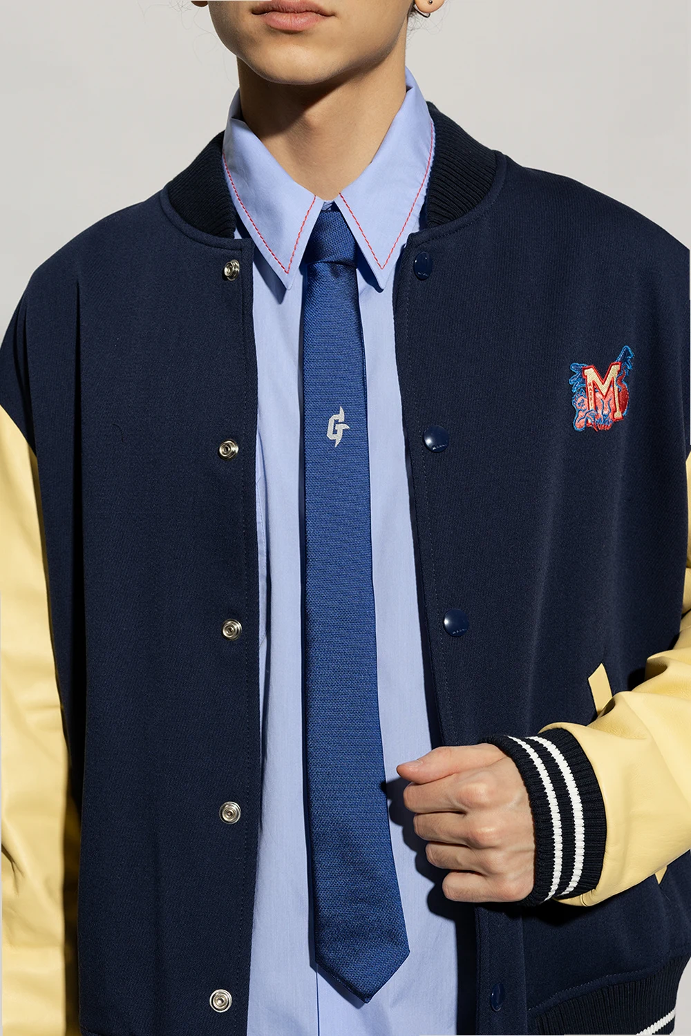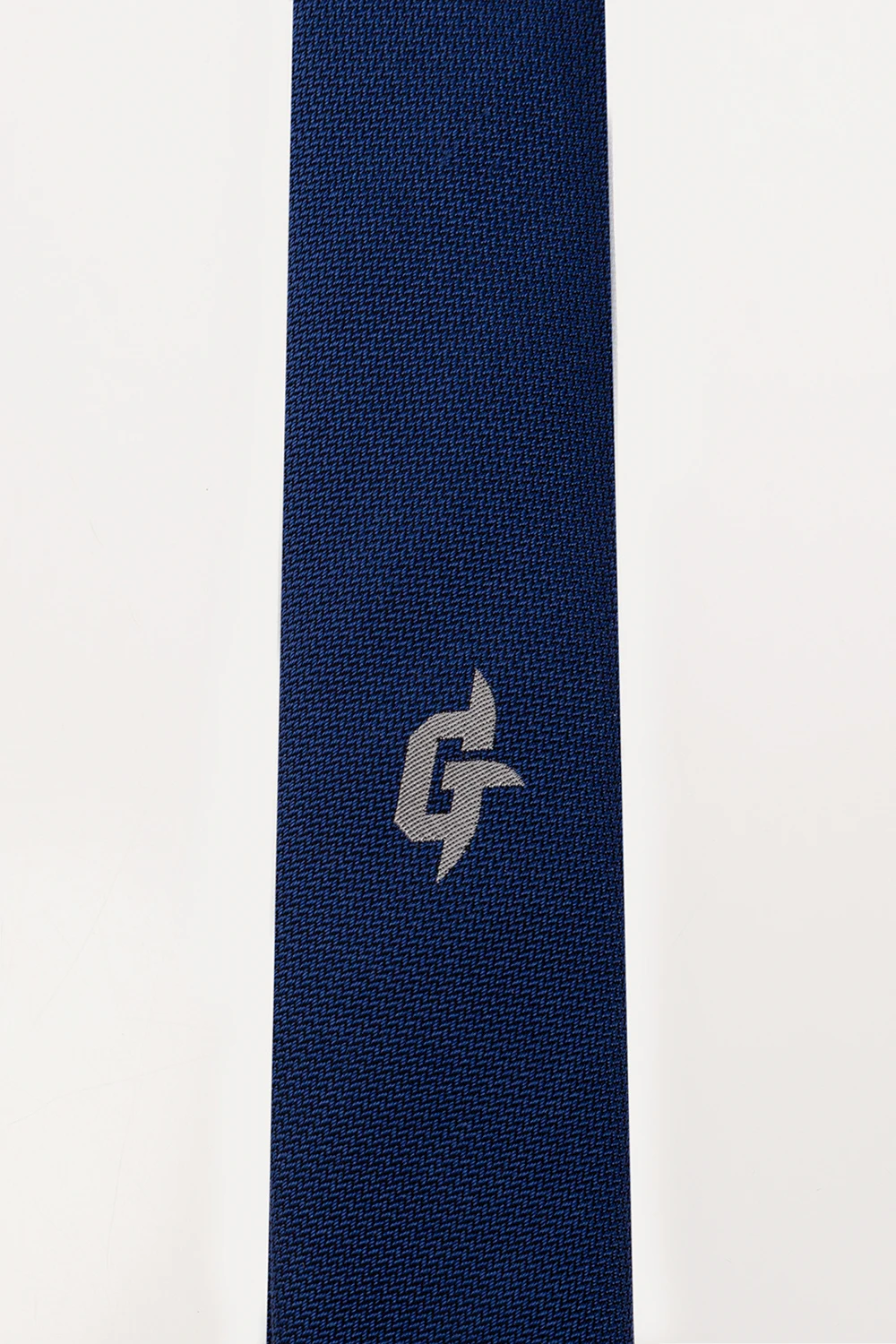 Granatowy, jedwabny krawat Givenchy. Ozdobiony wyszytym szarym logo.