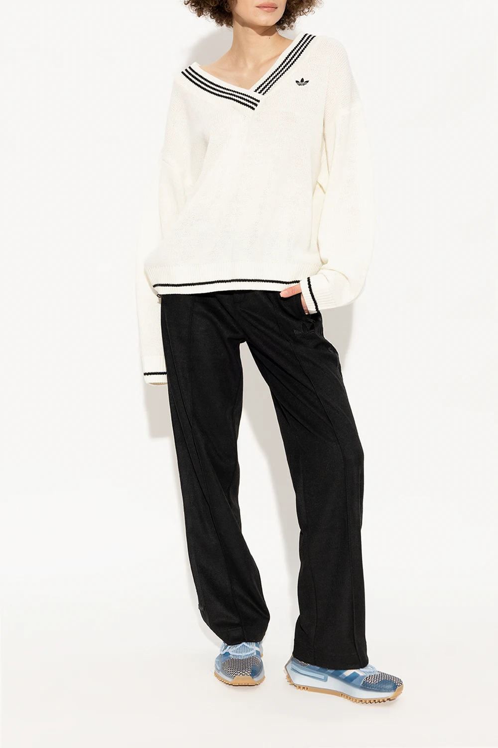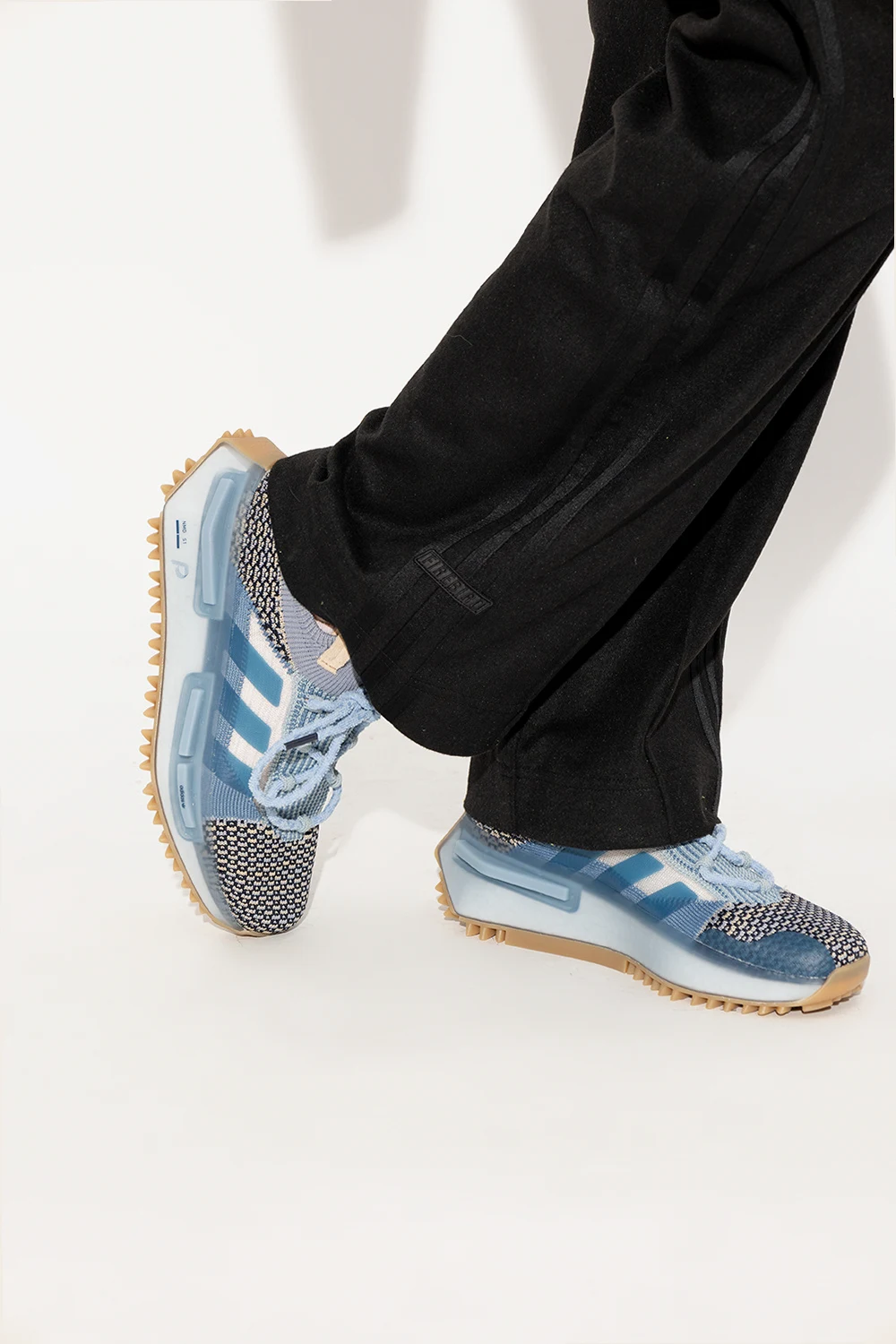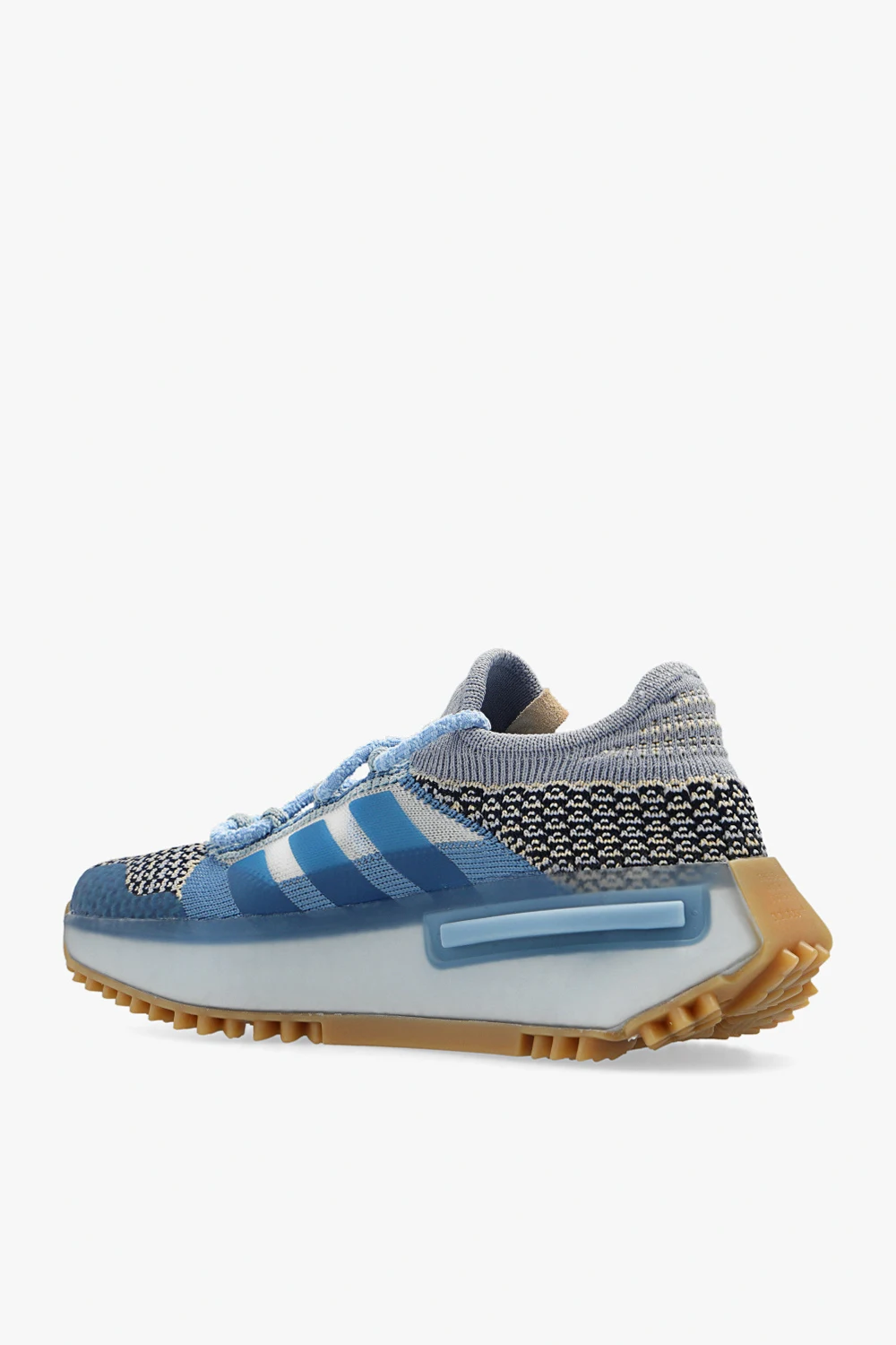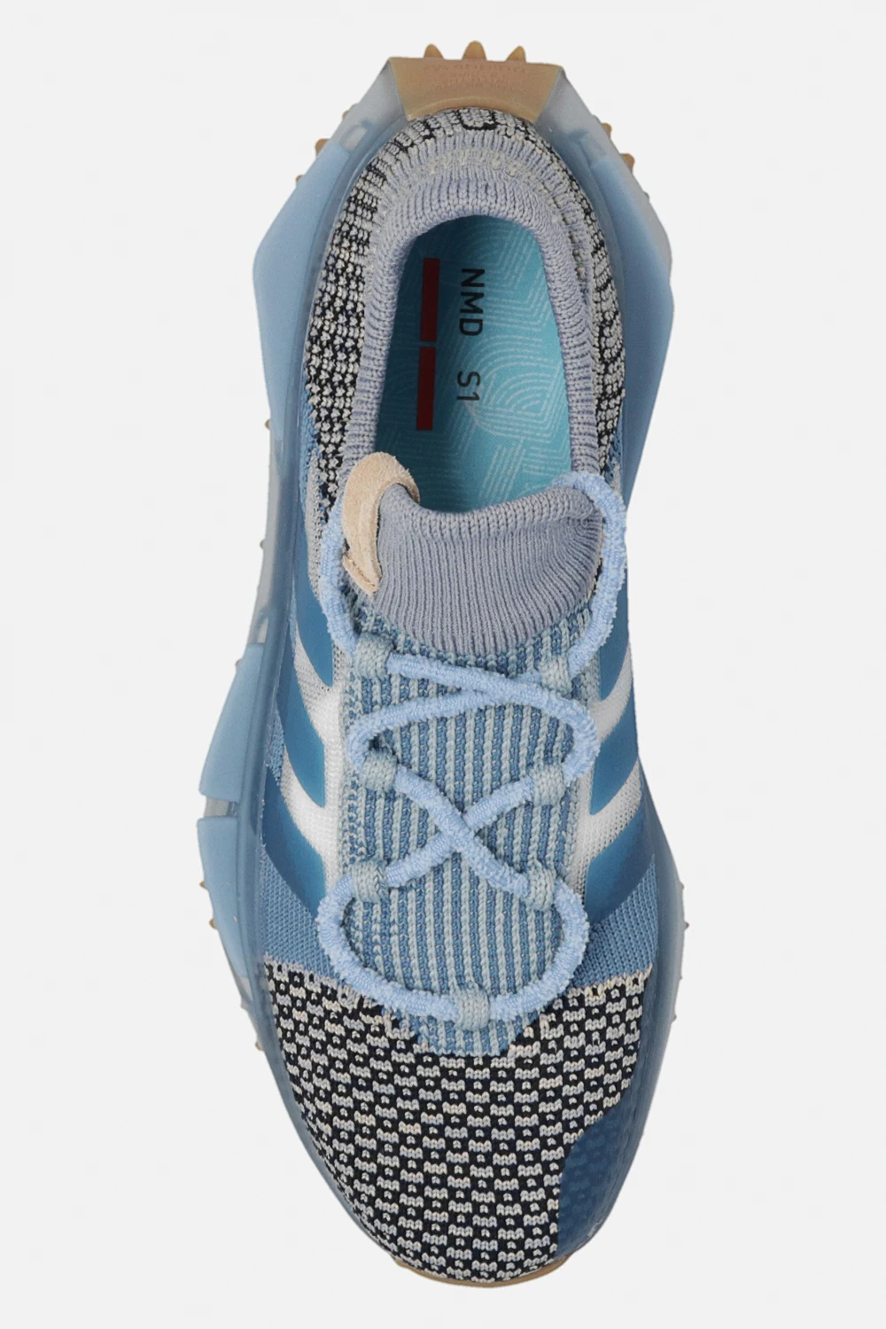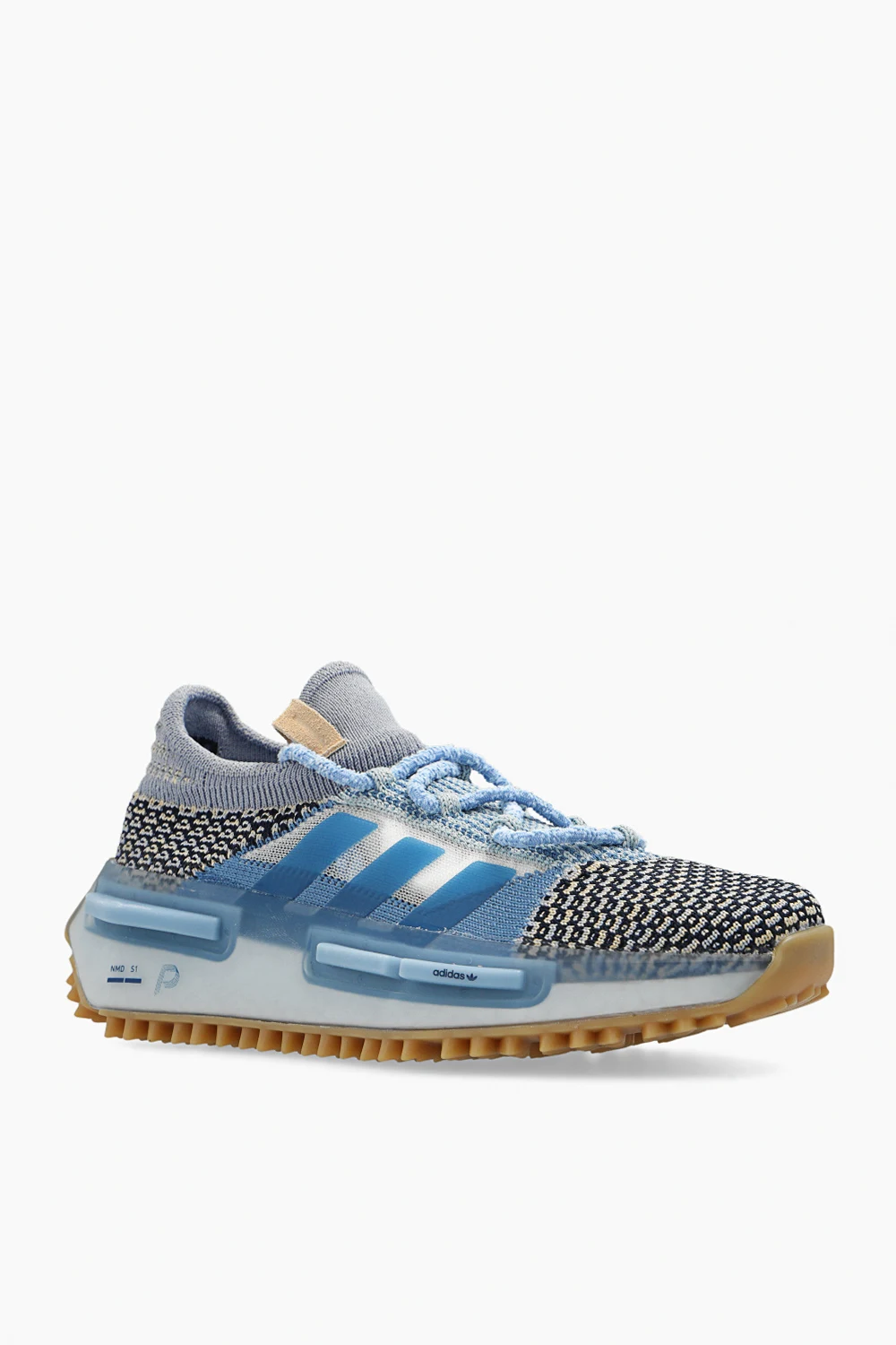 Niebiesko-kremowo-granatowe, sznurowane buty sportowe, model ‘NMD S1’ ADIDAS Originals x Phillip Leyesa. Dekoracyjnie pleciona cholewka ozdobiona z przodu naszywką w kolorze kremowym. Profil ozdobiony transparentną wstawką i trzema charakterystycznymi dla marki paskami. Podeszwa środkowa BOOST. Podeszwa zewnętrzna wykończona niebieską, lekko transparentną gumą i beżowym bieżnikiem z motywem logo ‘Trefoil’. Dołączone dodatkowe sznurowadła.