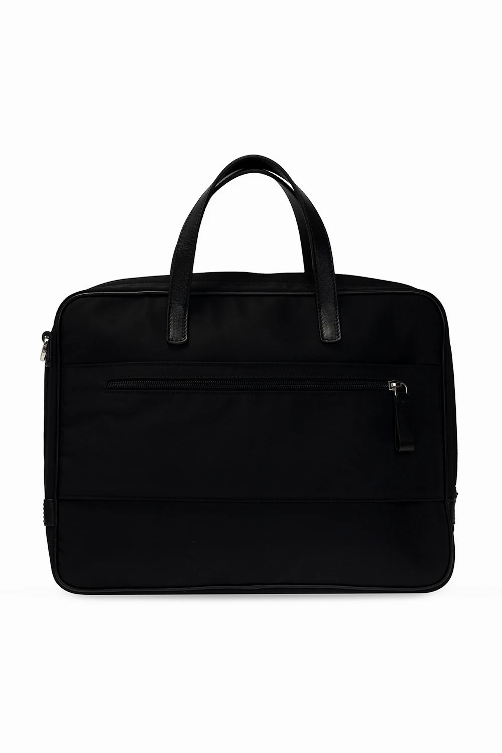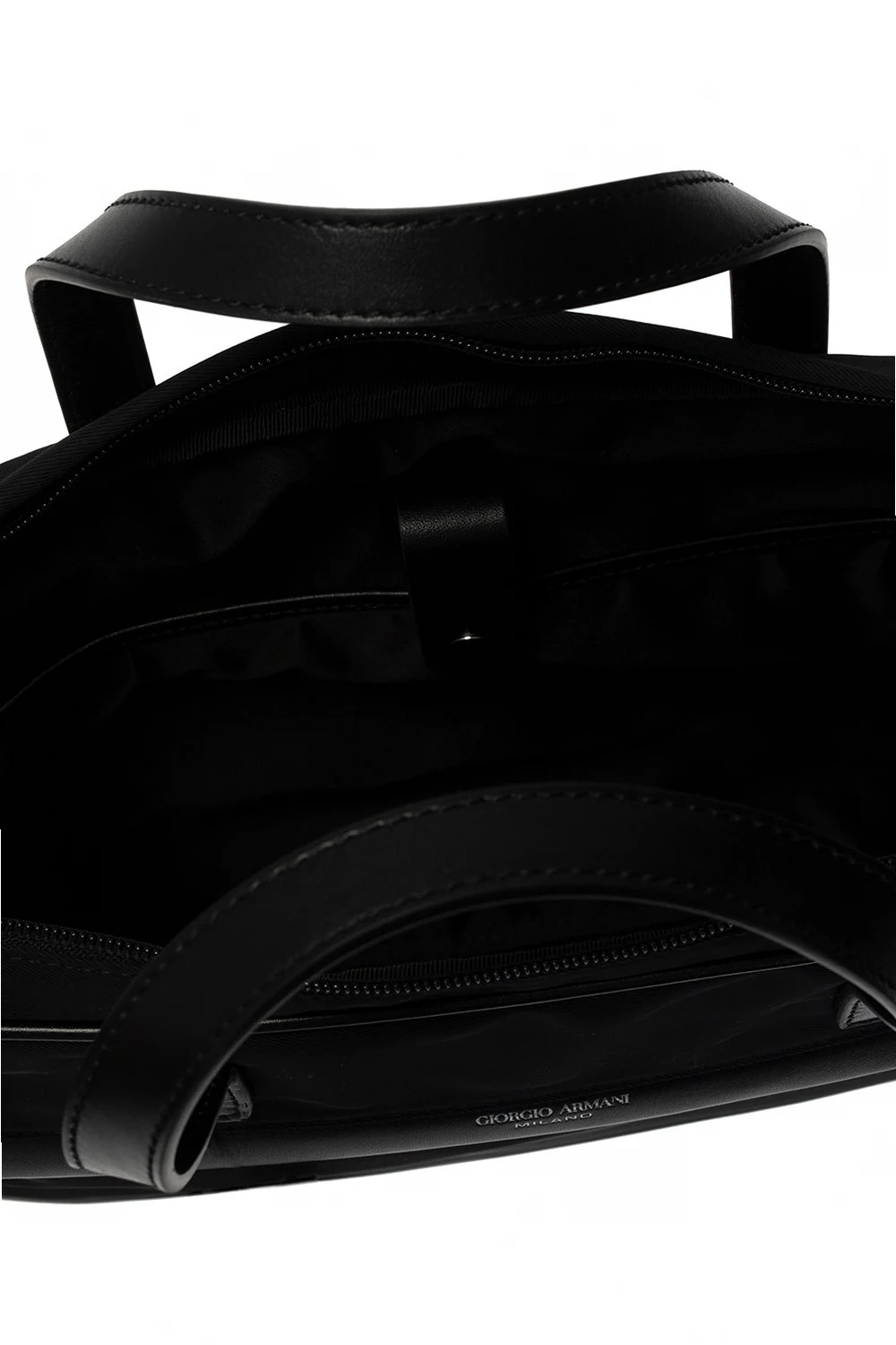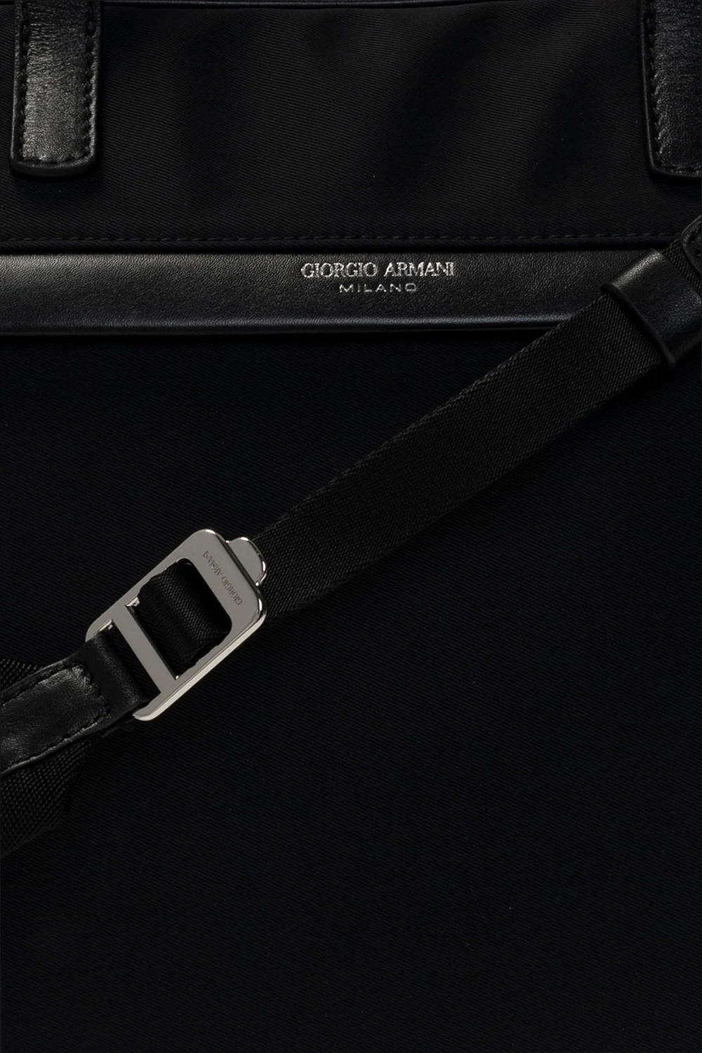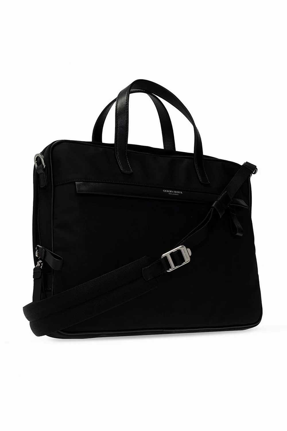 Czarna aktówka Giorgio Armani. Wykończona skórą. Zamykana na dwubiegunowy zamek. Z przodu nadrukowane logo w kolorze srebrnym. Dwie kieszenie zamykane na zamek; jedna z przodu i jedna z tyłu. Dwie półokrągłe rączki. Odpinany, regulowany pasek. Wewnątrz komora, kieszeń zamykana na zamek, kieszeń zamykana na zatrzask i dwie wsuwane kieszenie. Metalowe elementy w kolorze srebrnym.