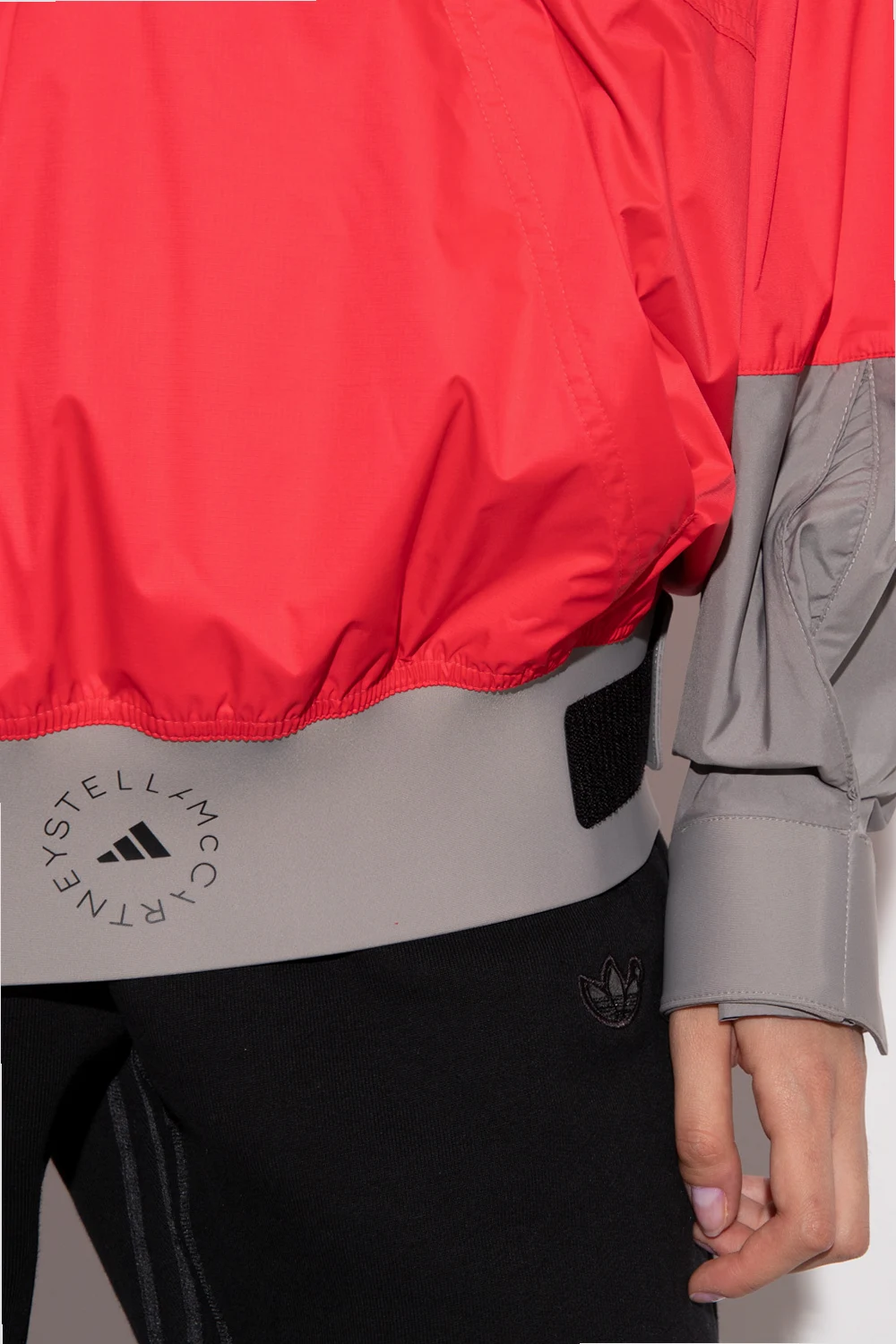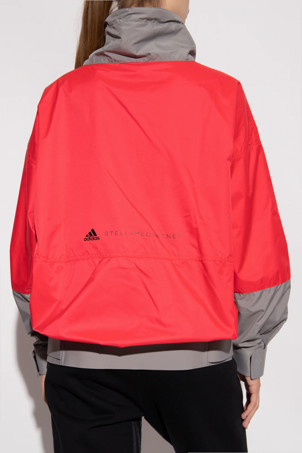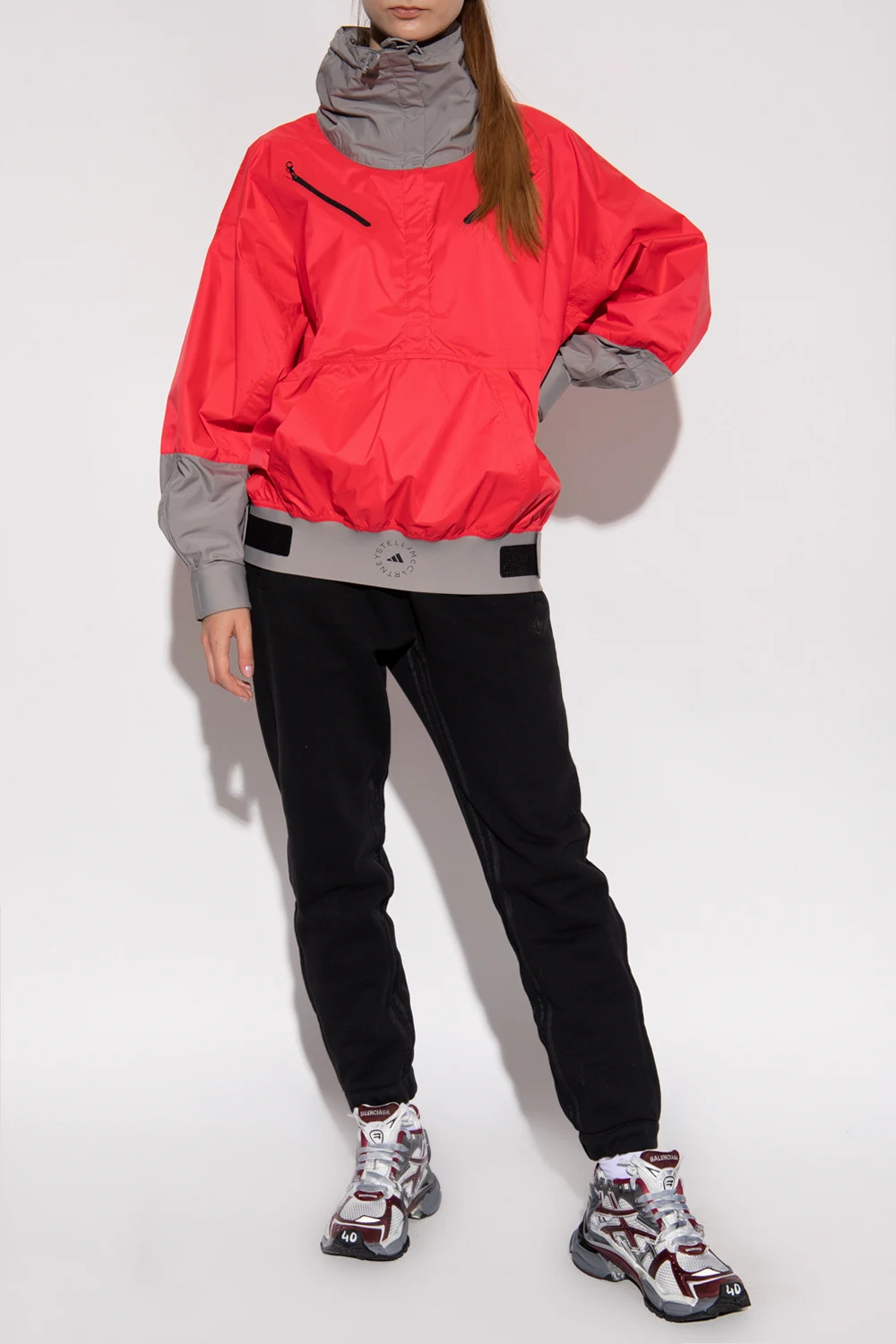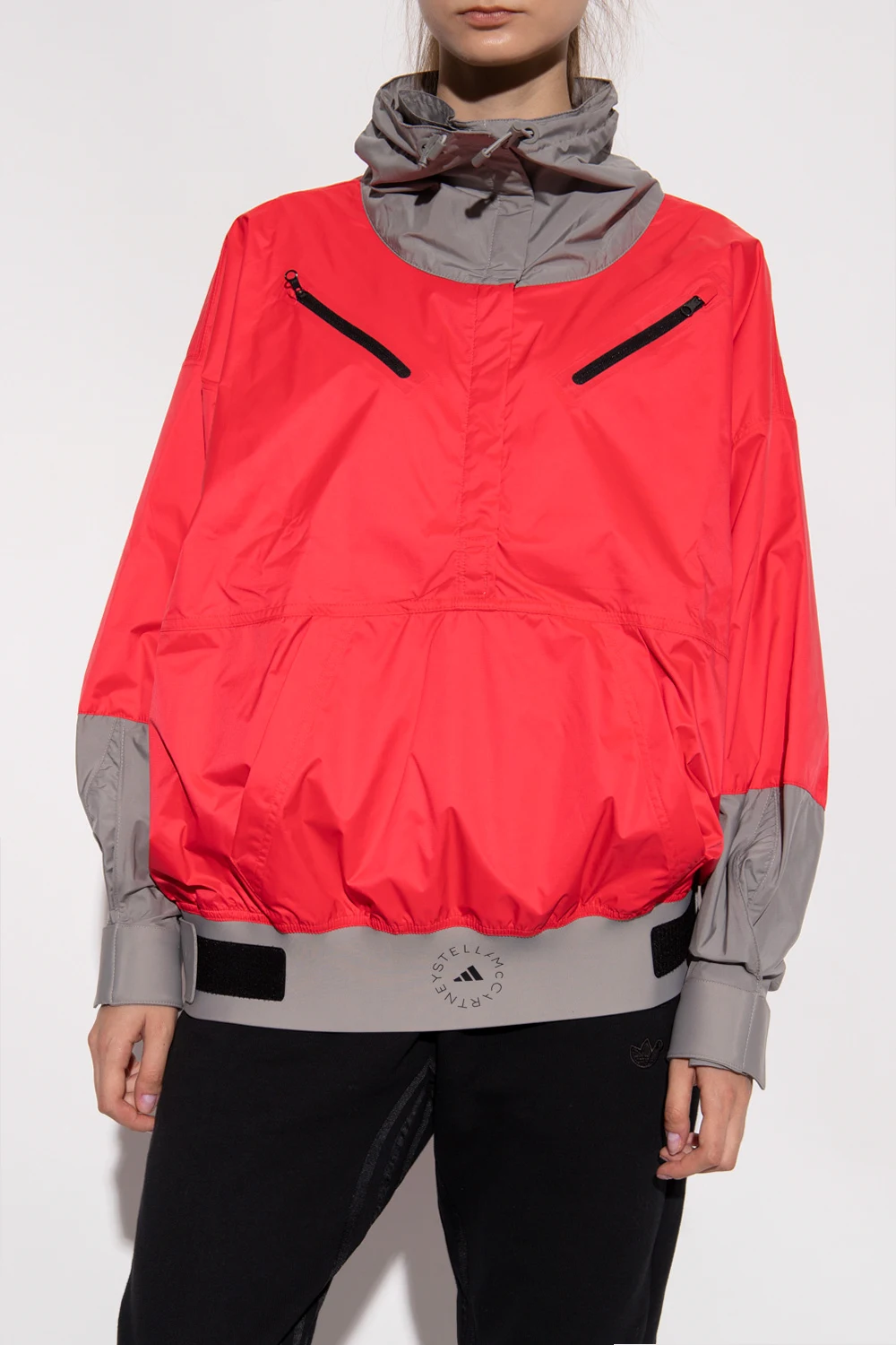 Czerwono-różowo-szara kurtka ADIDAS by Stella McCartney. Zapinana na rzep. Stójka ściągana trokami. Cztery kieszenie: dwie zapinane na zamek oraz dwie wsuwane. Dół oraz długie rękawy wykończone ściągaczem z zapięciem na rzep.