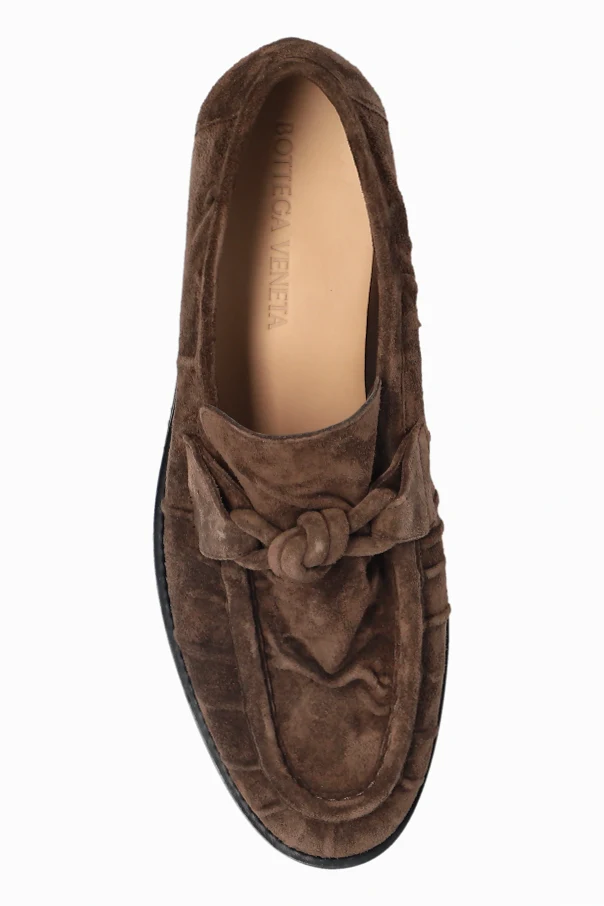 Buty Astaire typu loafers to kwintesencja ponadczasowej elegancji, oferowana przez prestiżowego projektanta Bottega Veneta. Ich klasyczny fason ze smukłą, zamkniętą cholewką do śródstopia oraz delikatnie zaokrąglonym noskiem, podkreślony został luksusową, brązową skórą zamszową o miękkiej, matowej strukturze.