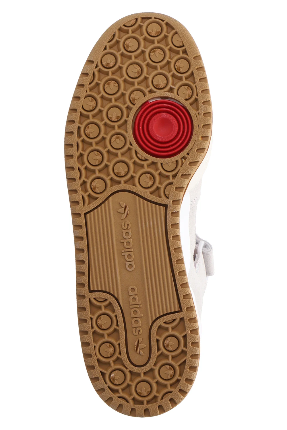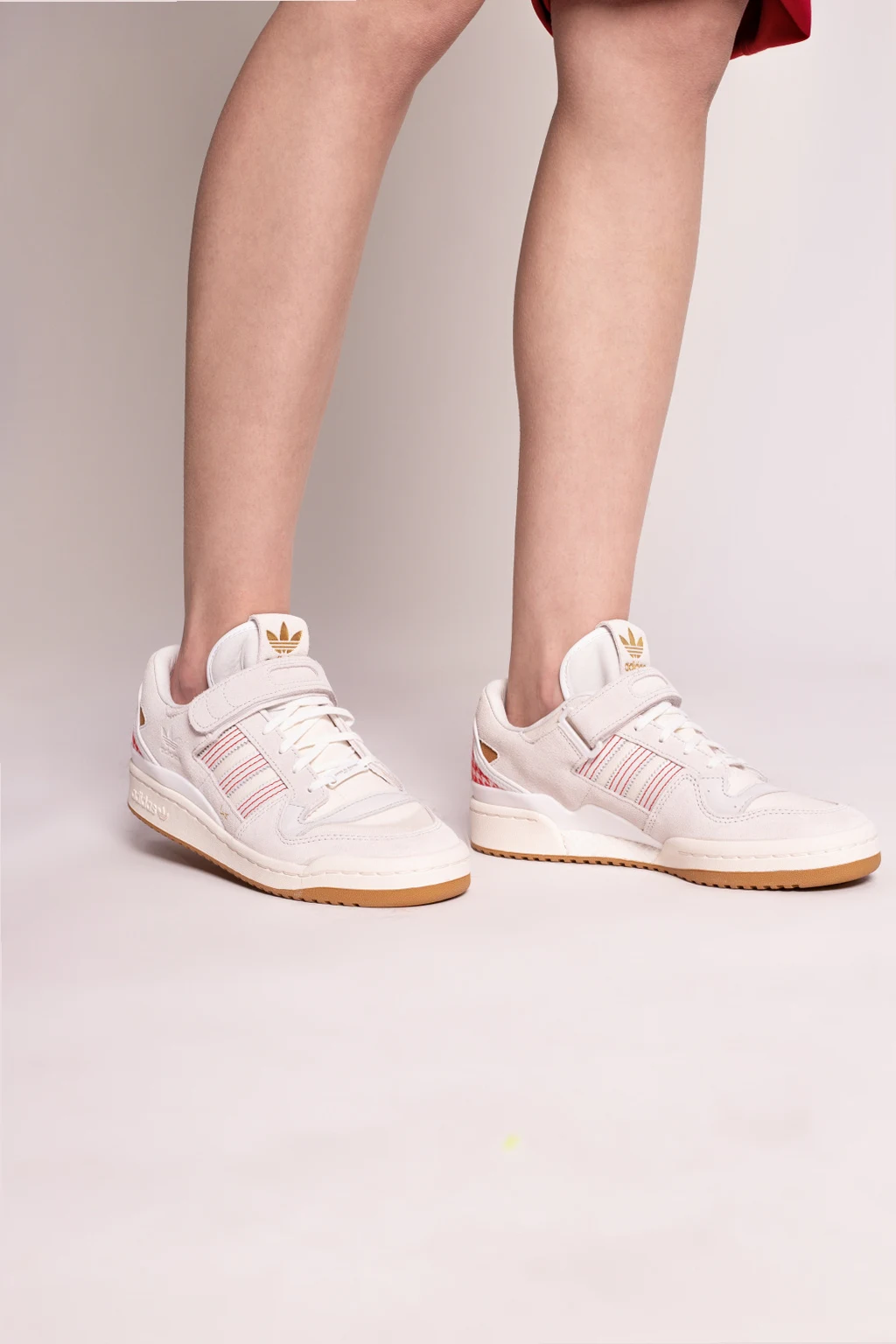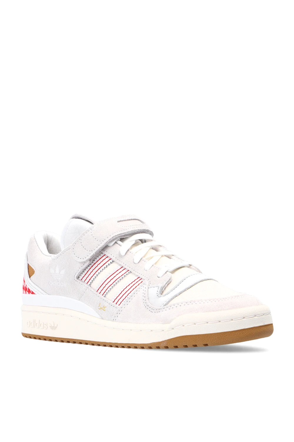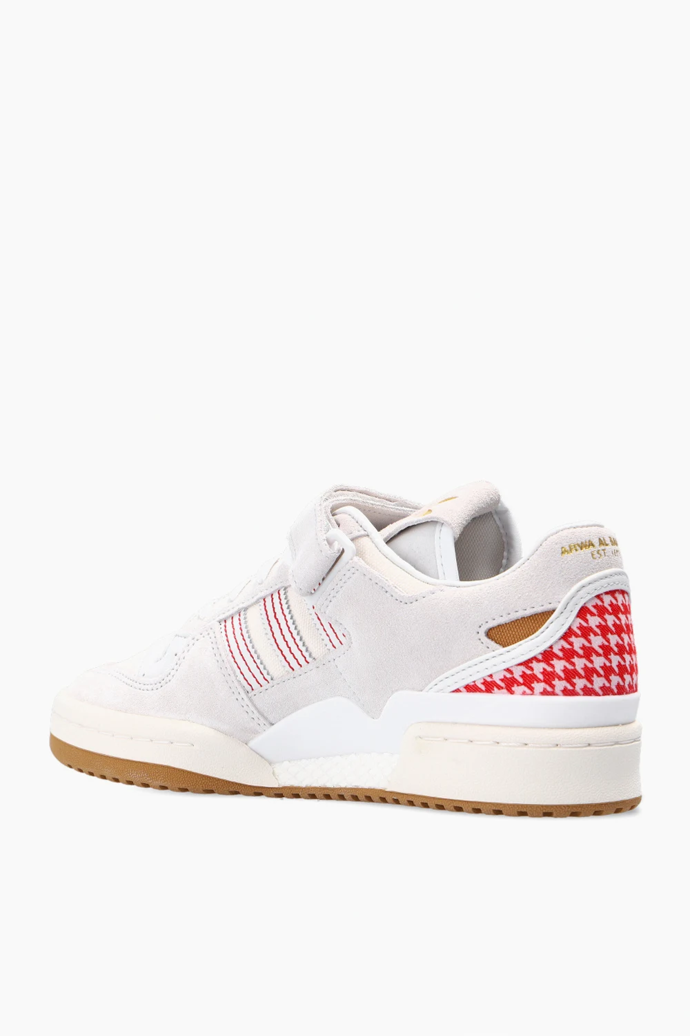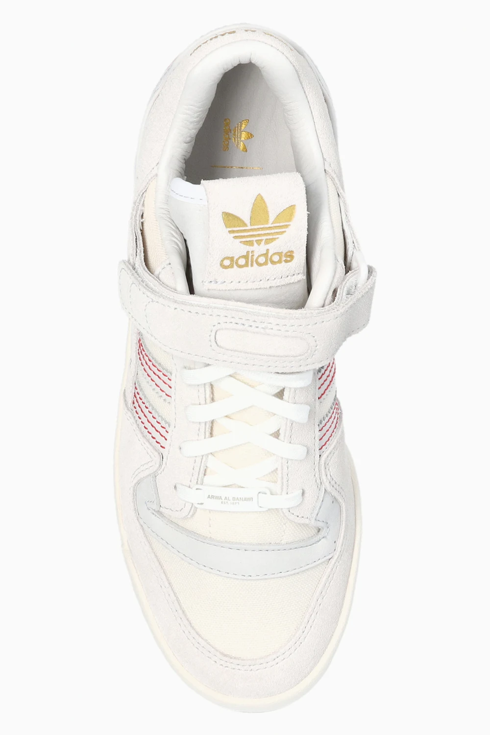 Kremowe, sznurowane buty sportowe, model ‘Forum 84 Low’ ADIDAS Originals x Arwa Al Banawi. Wykonane z zamszu. Dodatkowe zapięcie na rzep. Na języku naszywka z wytłoczonym logo w kolorze złotym. Po bokach charkaterystyczne dla marki trzy paski z przeszyciami w kolorze czerwonym. Z tyłu wstawka z wzorem nawiązującym do kultury arabskiej. Kremowo-brązowa, gumowa podeszwa. Arwa Al Banawi pochodzi z Arabii Saudyjskiej, a w swoich projektach łączy motywy arabskiej tradycji i kultury z nowoczesną modą stworzoną dla silnych, pewnych siebie kobiet.