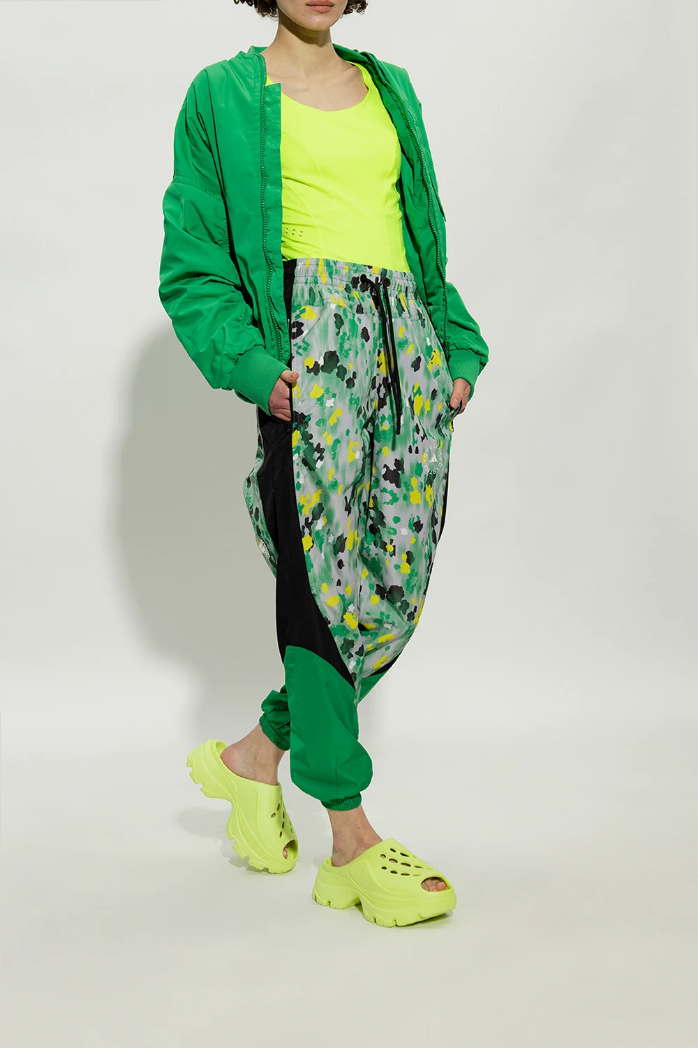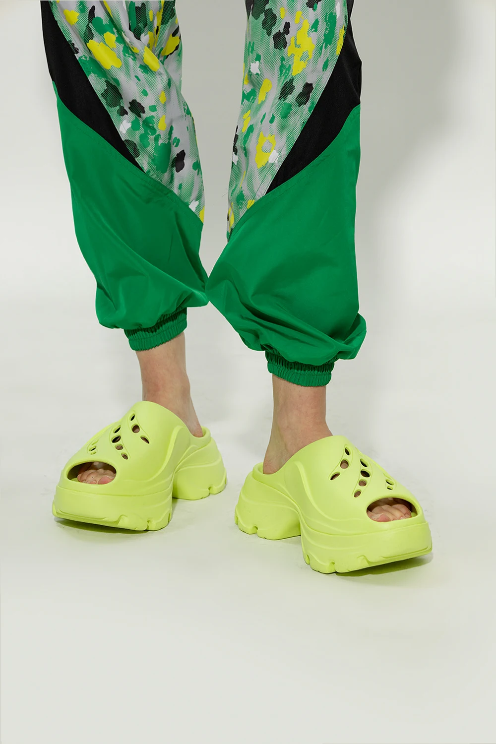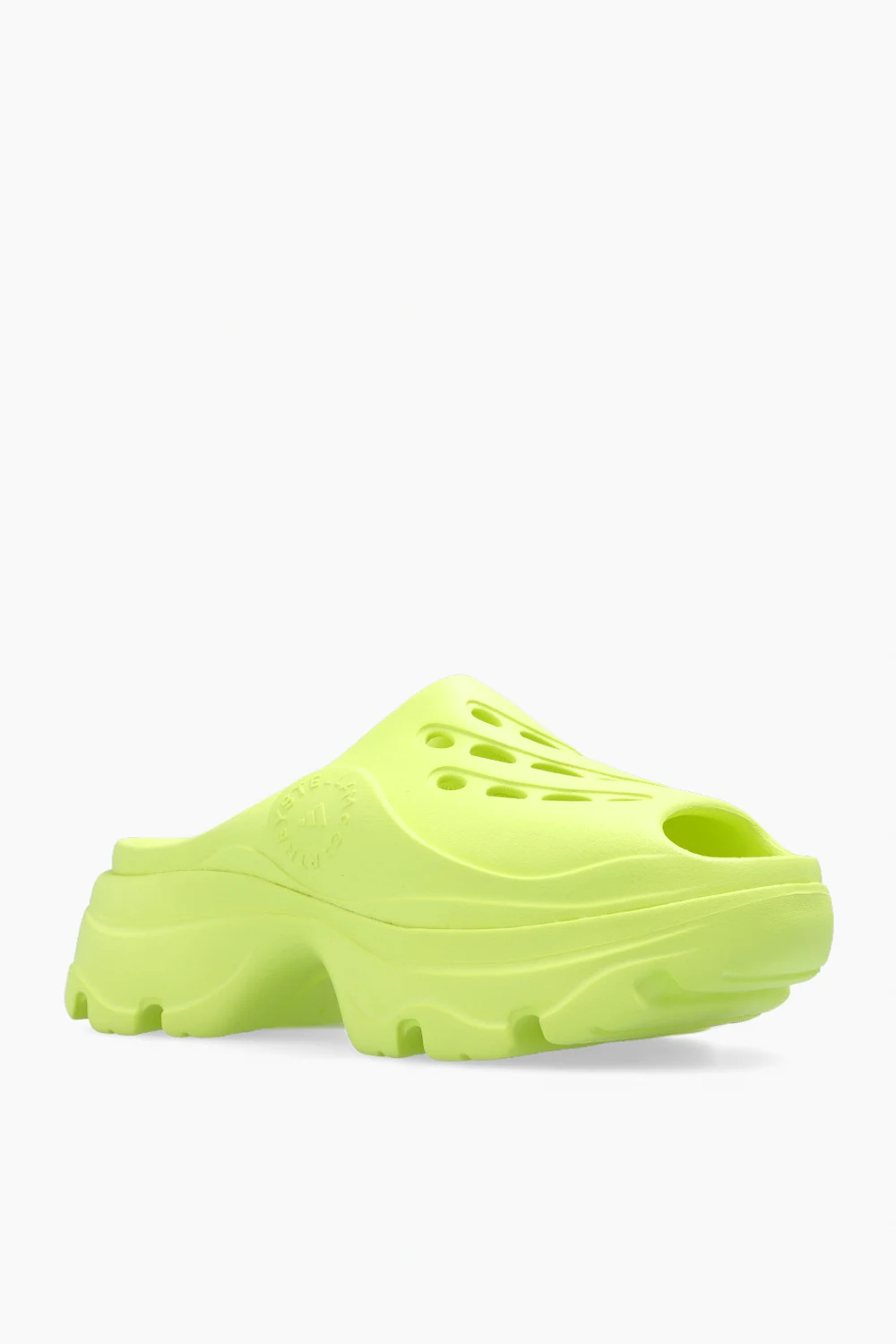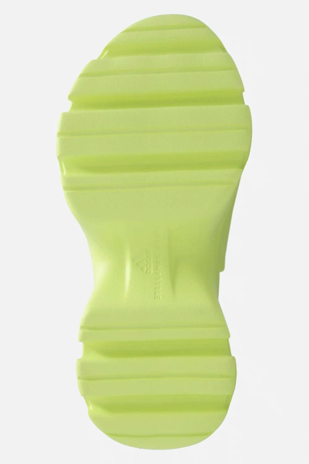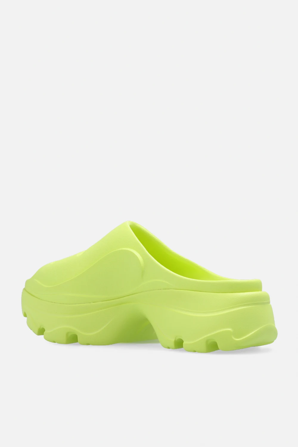 Jasnozielone klapki na platformie ADIDAS by Stella McCartney. Wykonane z gumy. Dekoracyjnie wycięta cholewka ozdobiona z boku wypukłym logo.