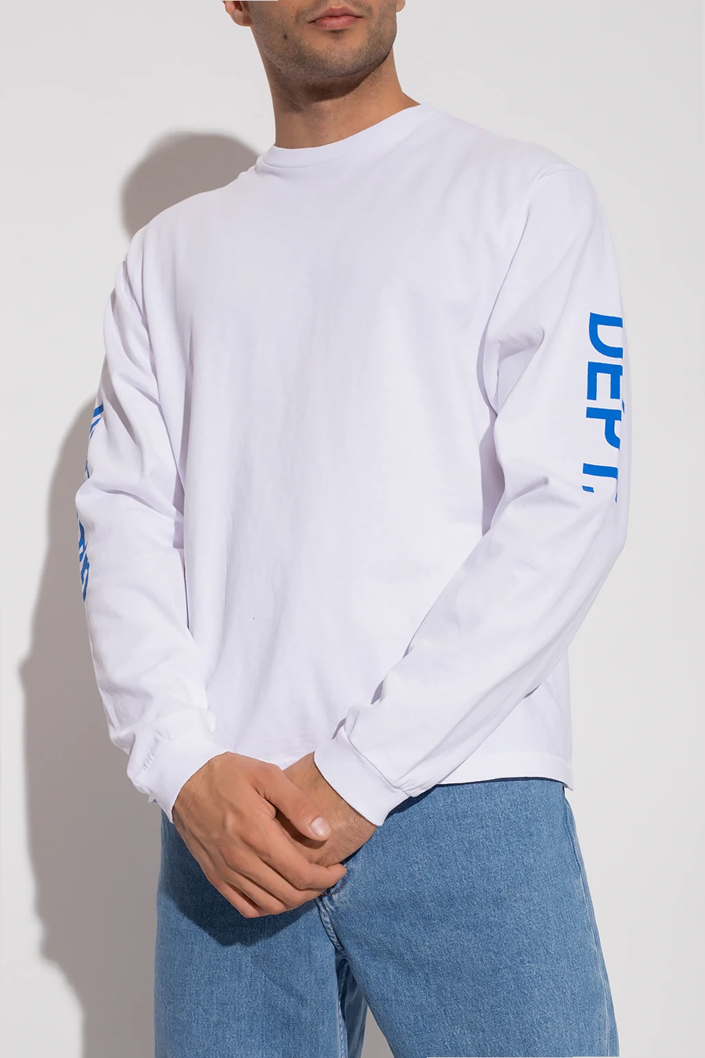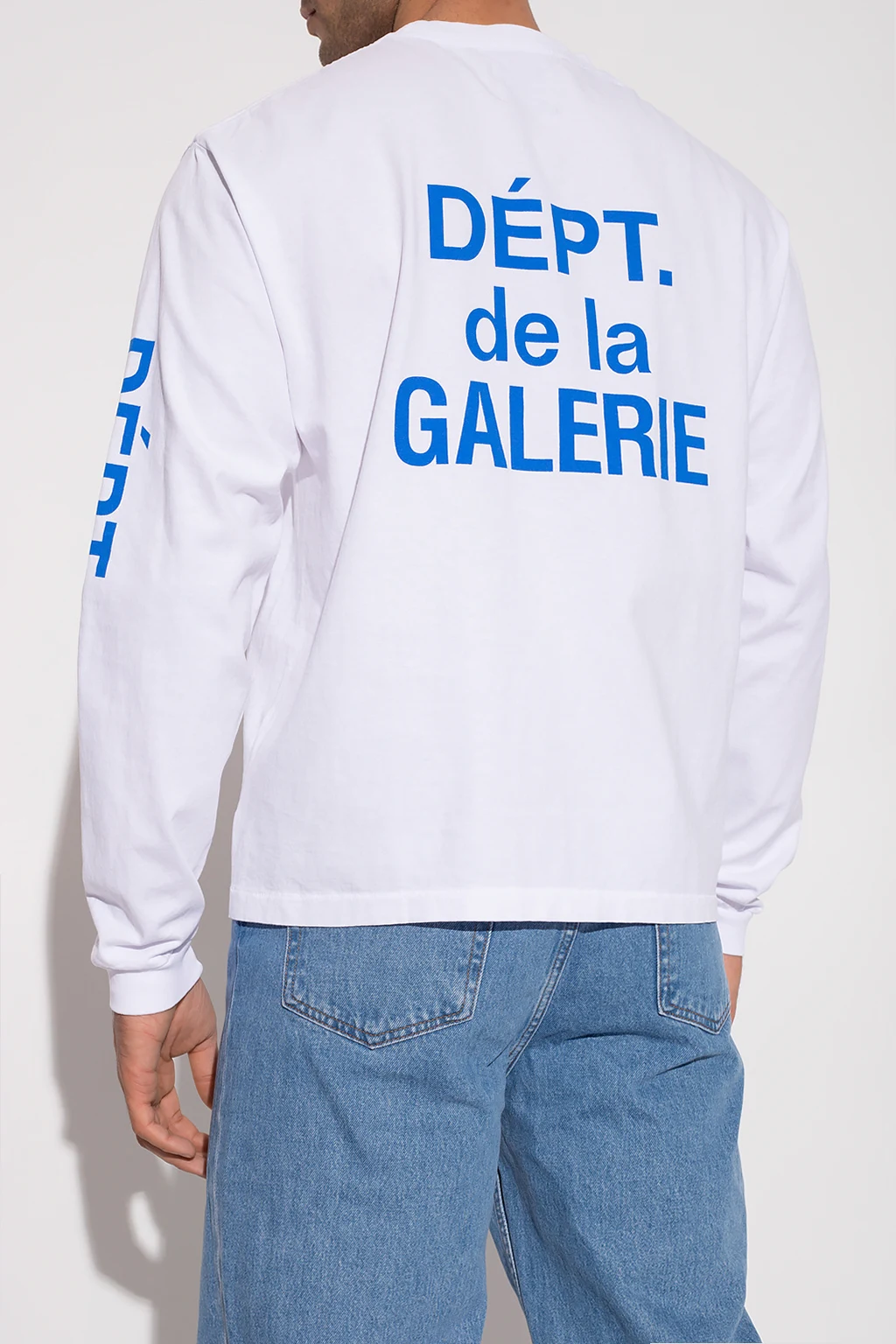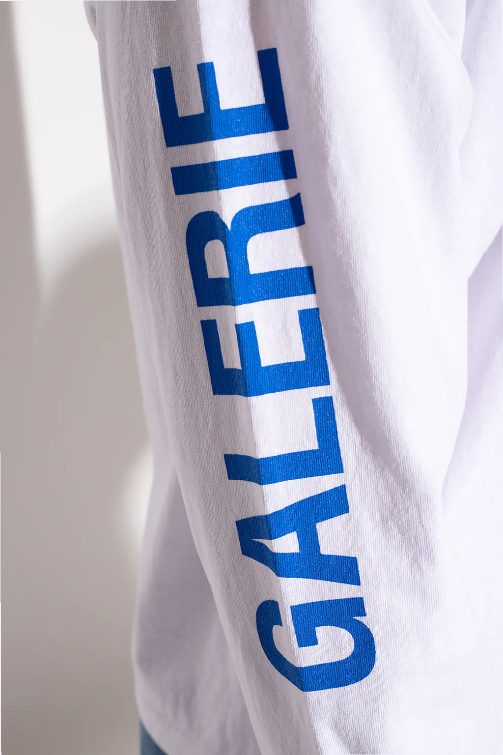 Biały t-shirt GALLERY DEPT. Wykonany z bawełny. Ozdobiony nadrukowanym wzorem z logo w kolorze niebieskim. Okrągły dekolt i długie rękawy wykończone ściągaczem.