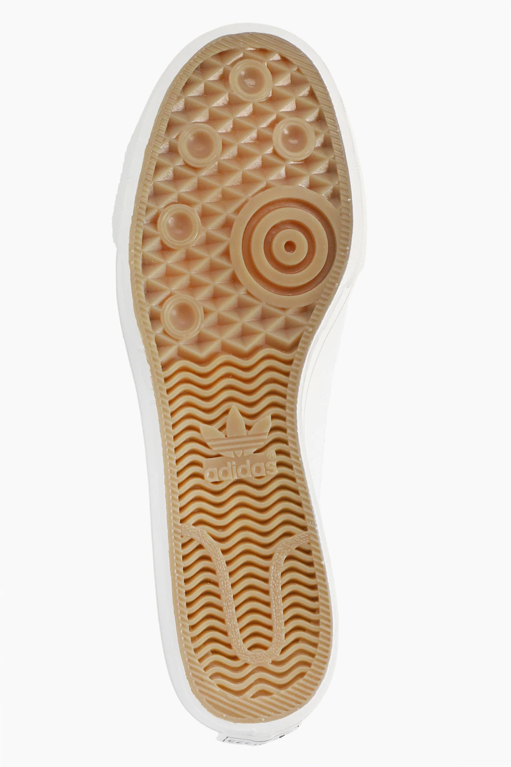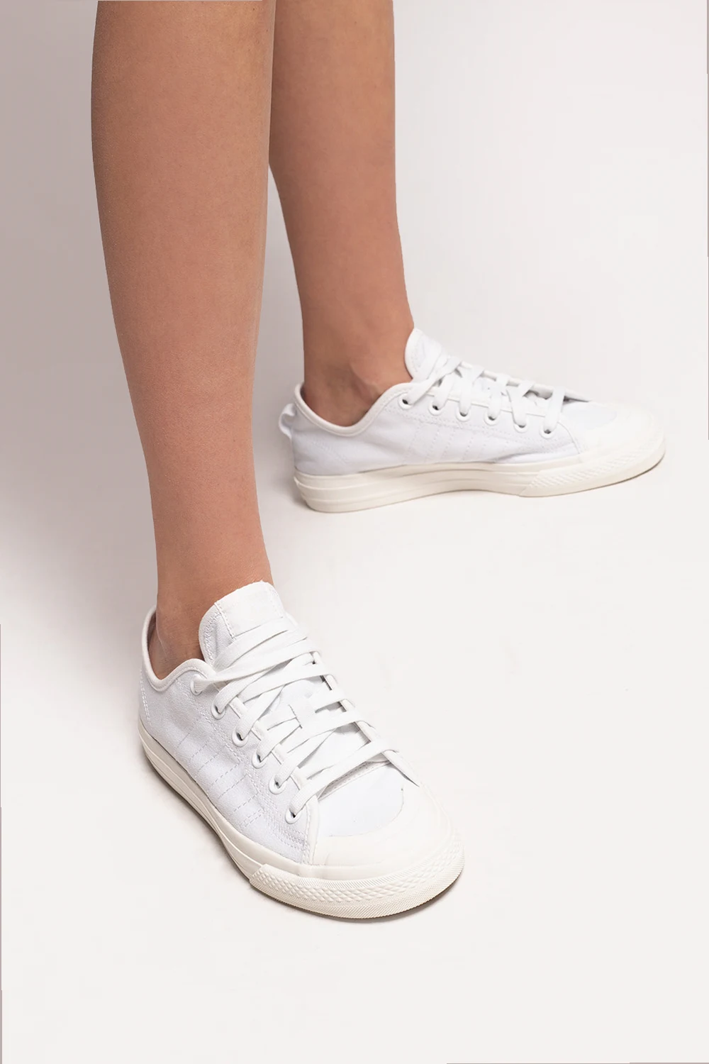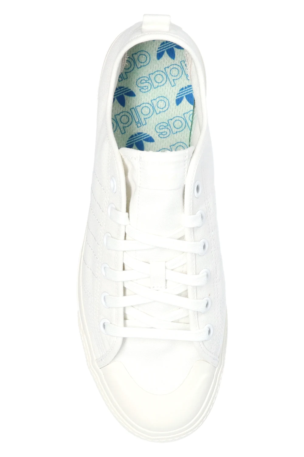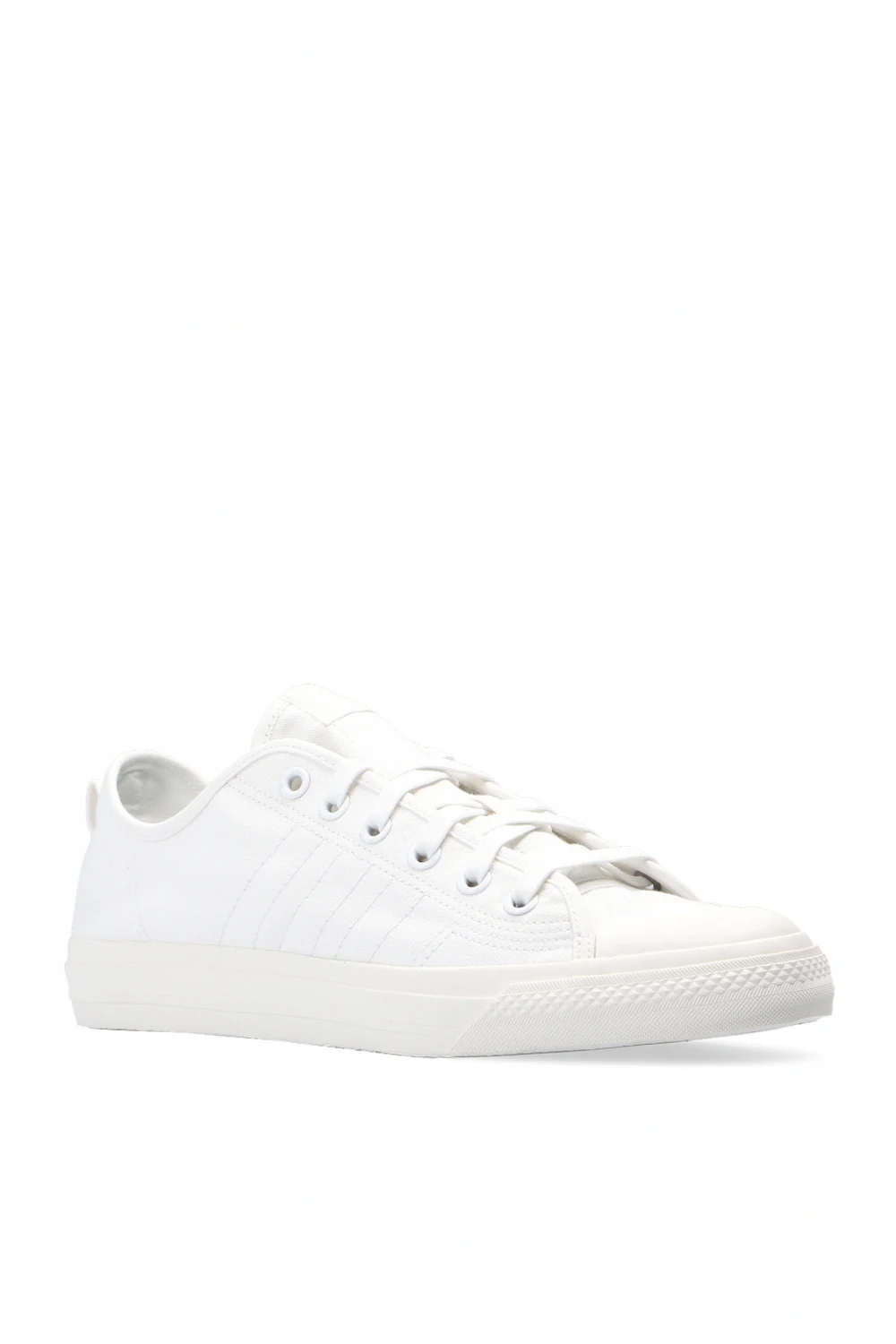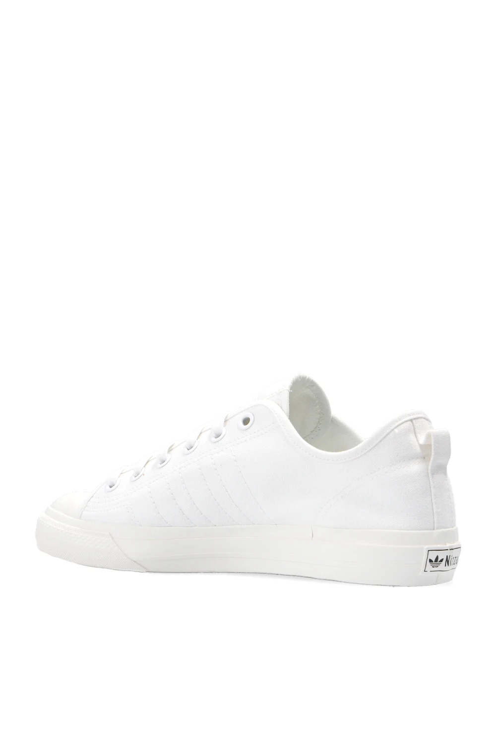 Białe, sznurowane buty sportowe, model ‘Nizza RF’ ADIDAS Originals. Na języku naszywka w kolorze z logo. Przeszycia w formie charakterystycznych dla marki trzech pasków w kolorze białym. Kremowa, gumowa platforma.