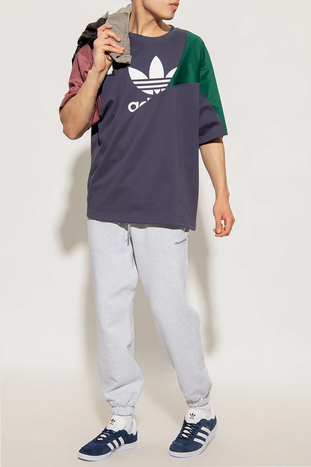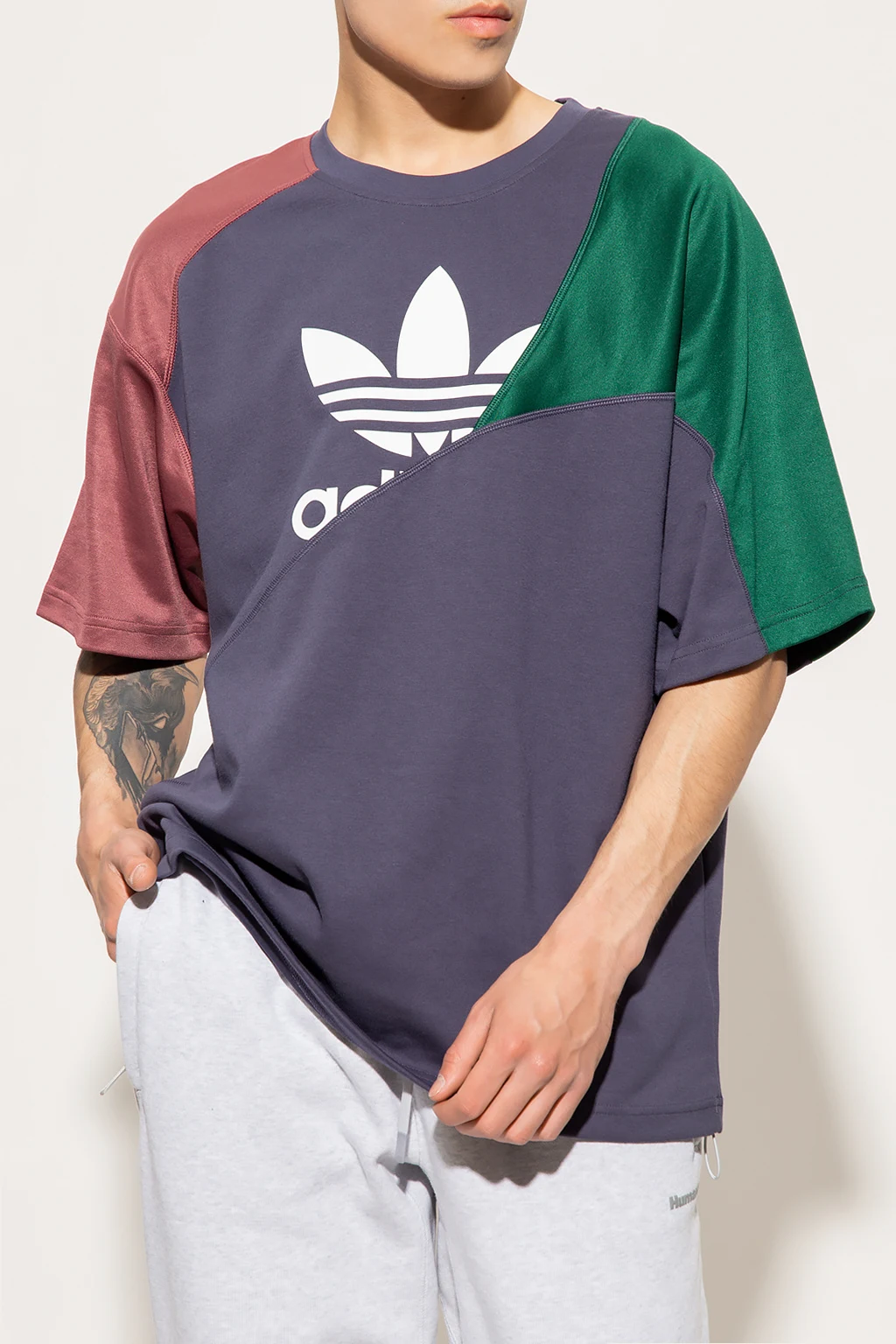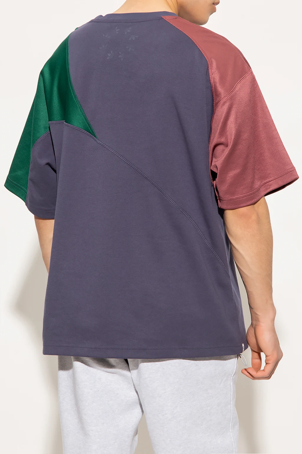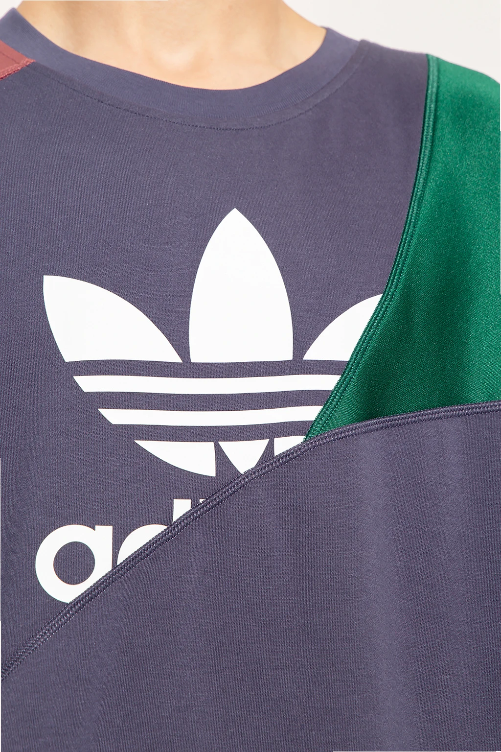 Granatowo-zielono-fioletowy t-shirt ADIDAS Originals, linia ‘End Plastic Waste’. Wykonany z mieszanki materiału pochodzącego z recyklingu i bawełny. Luźny krój ozdobiony asymetrycznymi cięciami, inspirowanymi kultowym dresem ‘Mirabeau’ z lat 80-tych. Z przodu nadrukowane logo ‘Trefoil’ w kolorze białym. Okrągły dekolt wykończony ściągaczem, krótkie rękawy.