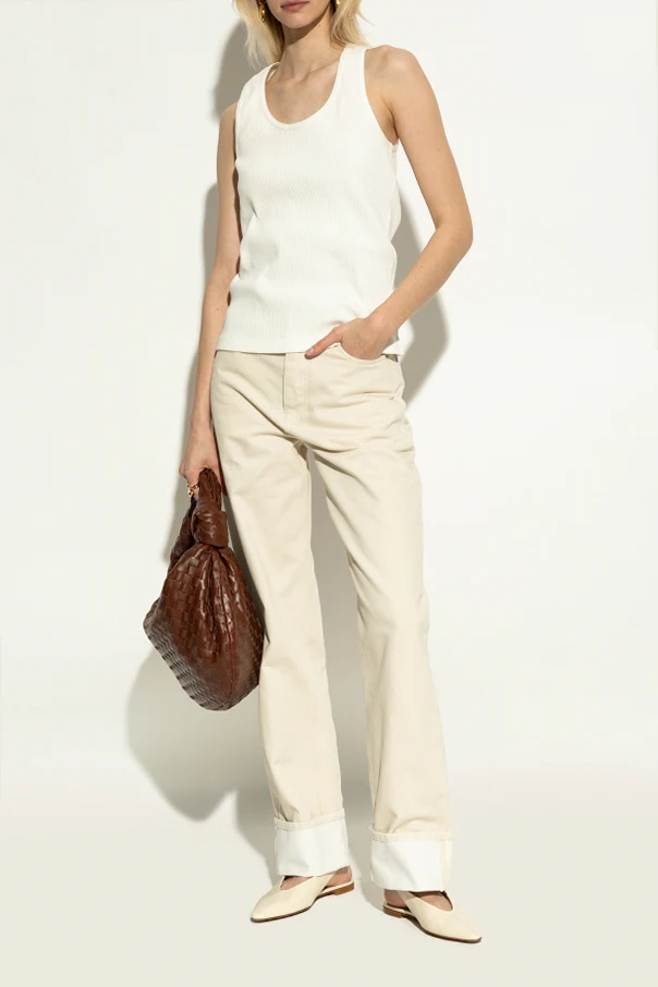 Dominujący kremowy odcień czyni je uniwersalnym wyborem, idealnym do wielu stylizacji. Minimalistyczny design, bez zbędnych ozdób, w pełni oddaje subtelność tego projektu. Na wkładce widnieje napis "Bottega Veneta", co podkreśla prestiż marki.