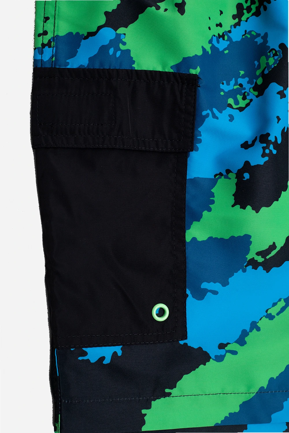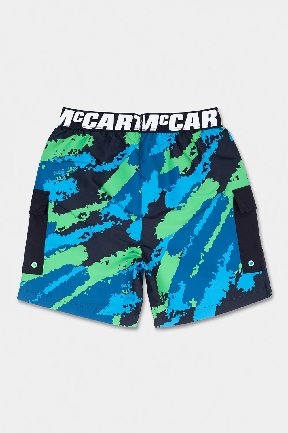 Zielono-czarno-niebieskie szorty kąpielowe Stella McCartney Kids. W pasie wszyta guma. Ozdobione wzorem z motywem ‘moro’ oraz białym logo. Dwie kieszenie z patkami.
