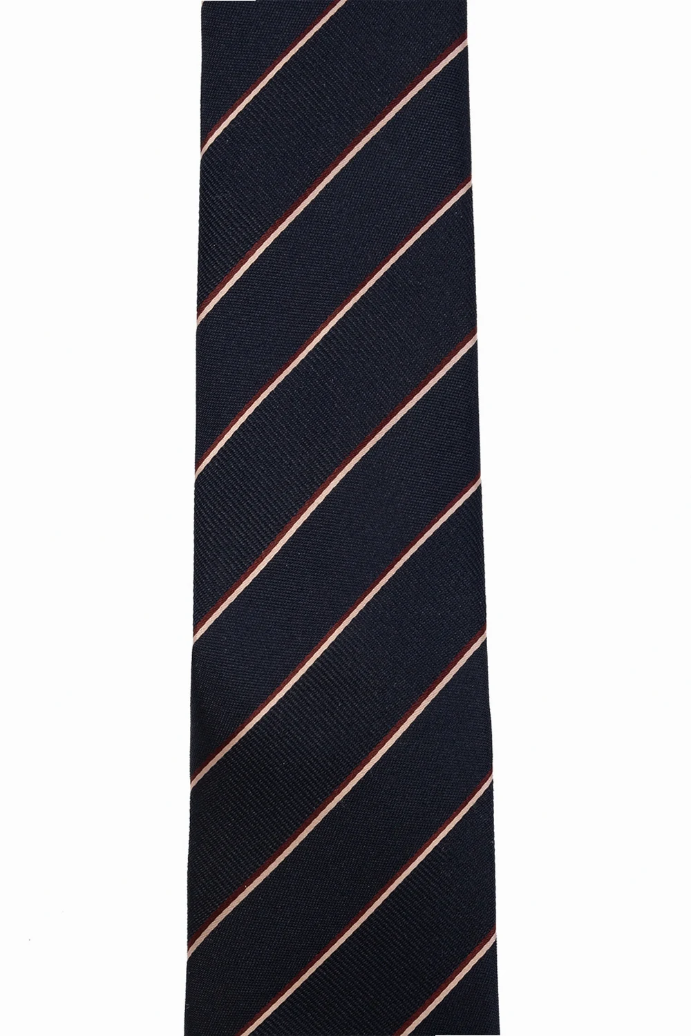Granatowy, jedwabny krawat Alexander McQueen. Ozdobiony wzorem w jasnoróżowo-bordowe prążki. Logo wyszyte w kolorze białym.