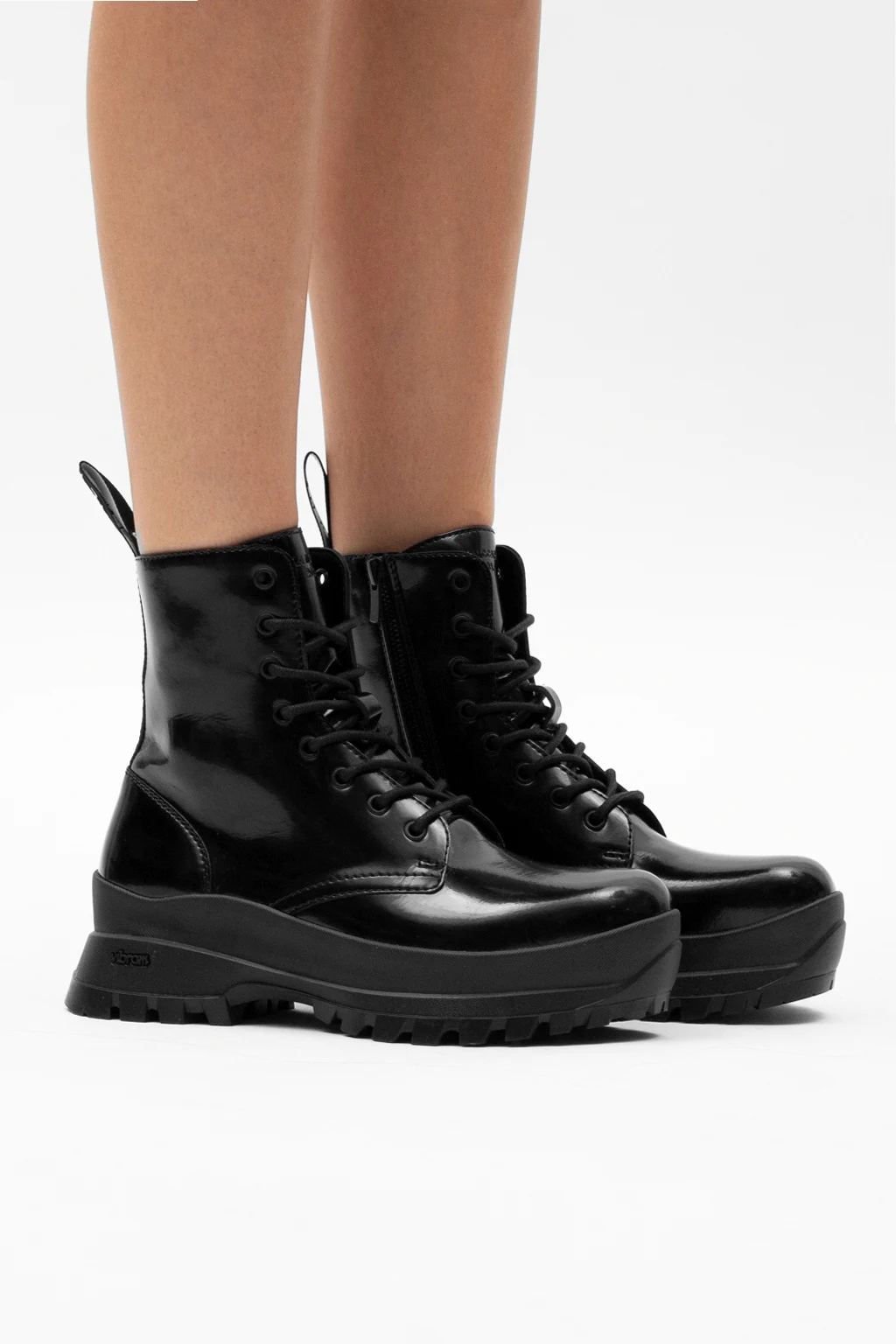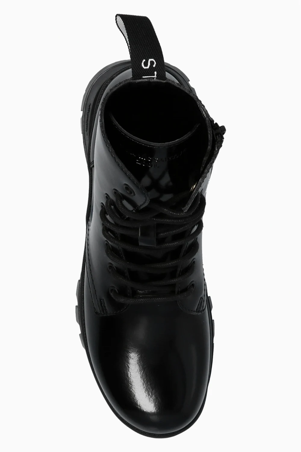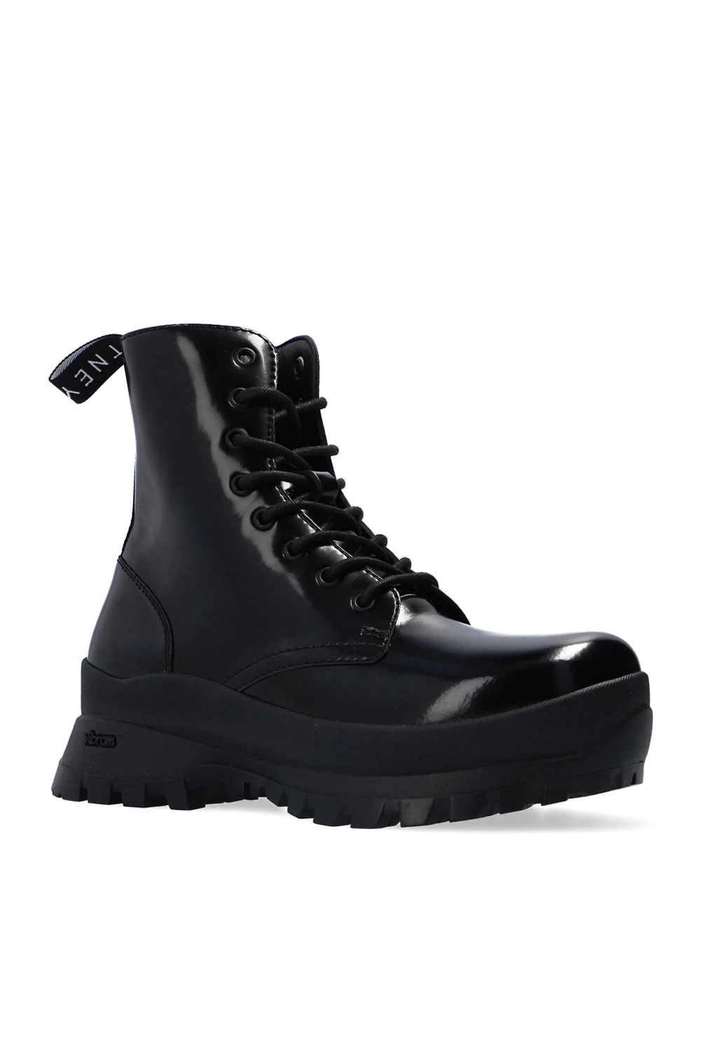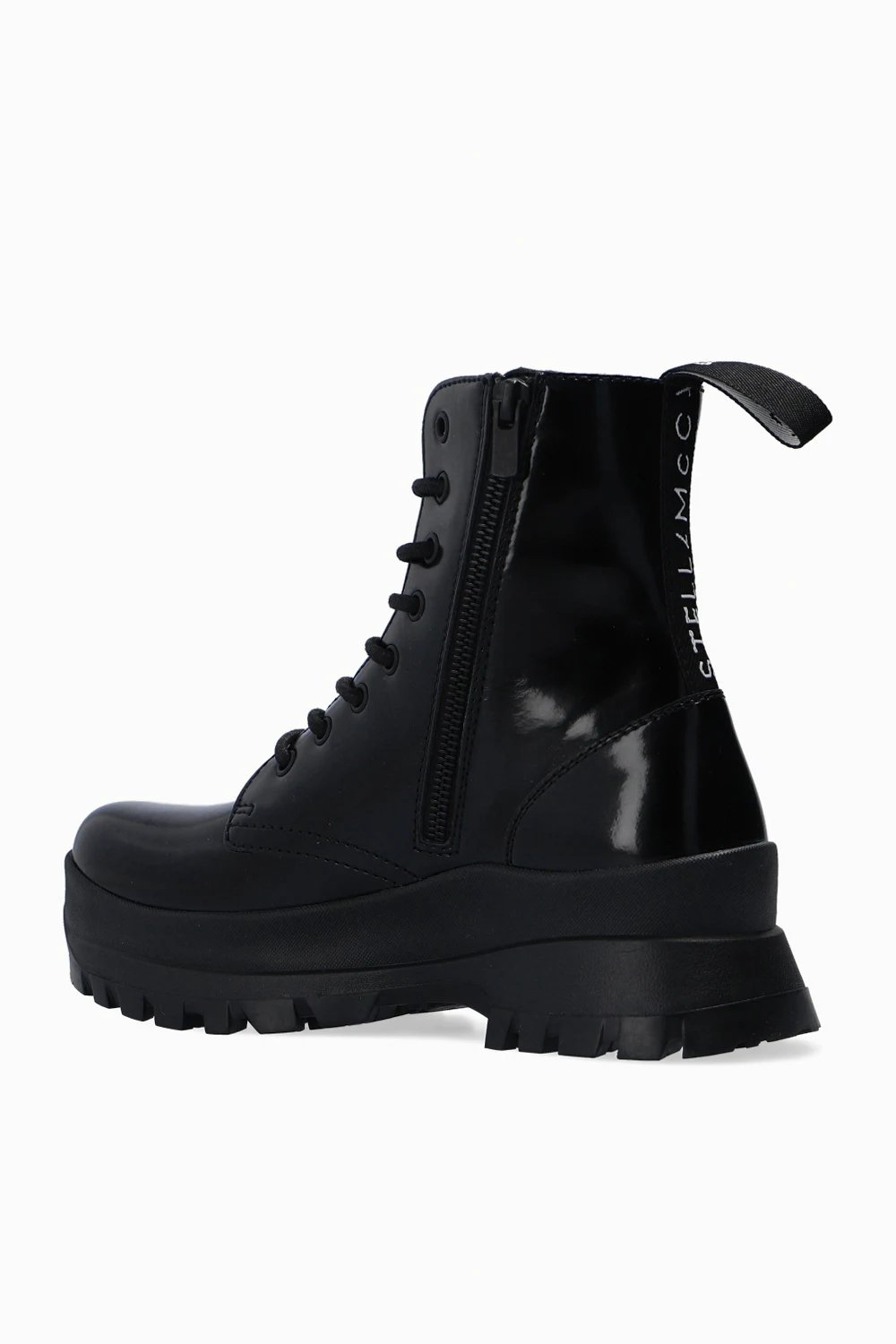 Czarne, sznurowane botki, model ‘Trace’ Stella McCartney. Wykonane z lakierowanej skóry syntetycznej. Z boku zapinane na zamek. Z tyłu rypsowy pasek z wyszytym logo w kolorze białym. Czarna, gumowa podeszwa z technologią Vibram stosowaną w butach górskich.