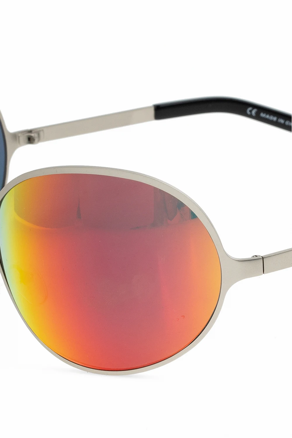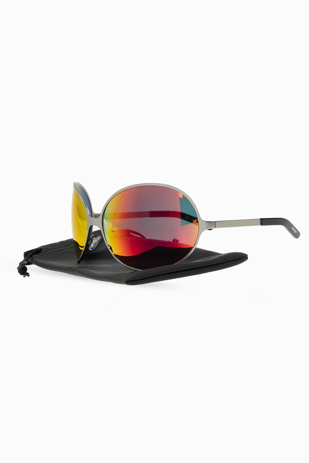 Okulary przeciwsłoneczne w kolorze srebrnym, model ‘Beetle’ Eytys. Czerwono-żółto-zielone, holograficzne soczewki. Oprawki ozdobione nadrukowanym wzorem z logo w kolorze srebrnym.