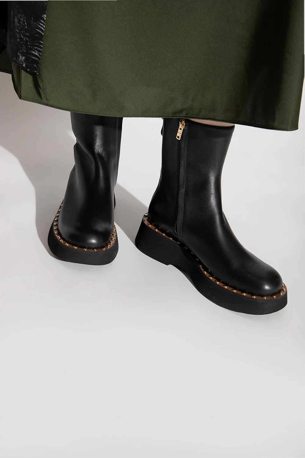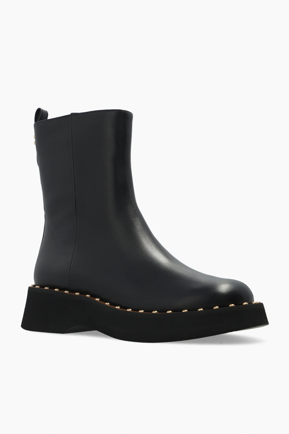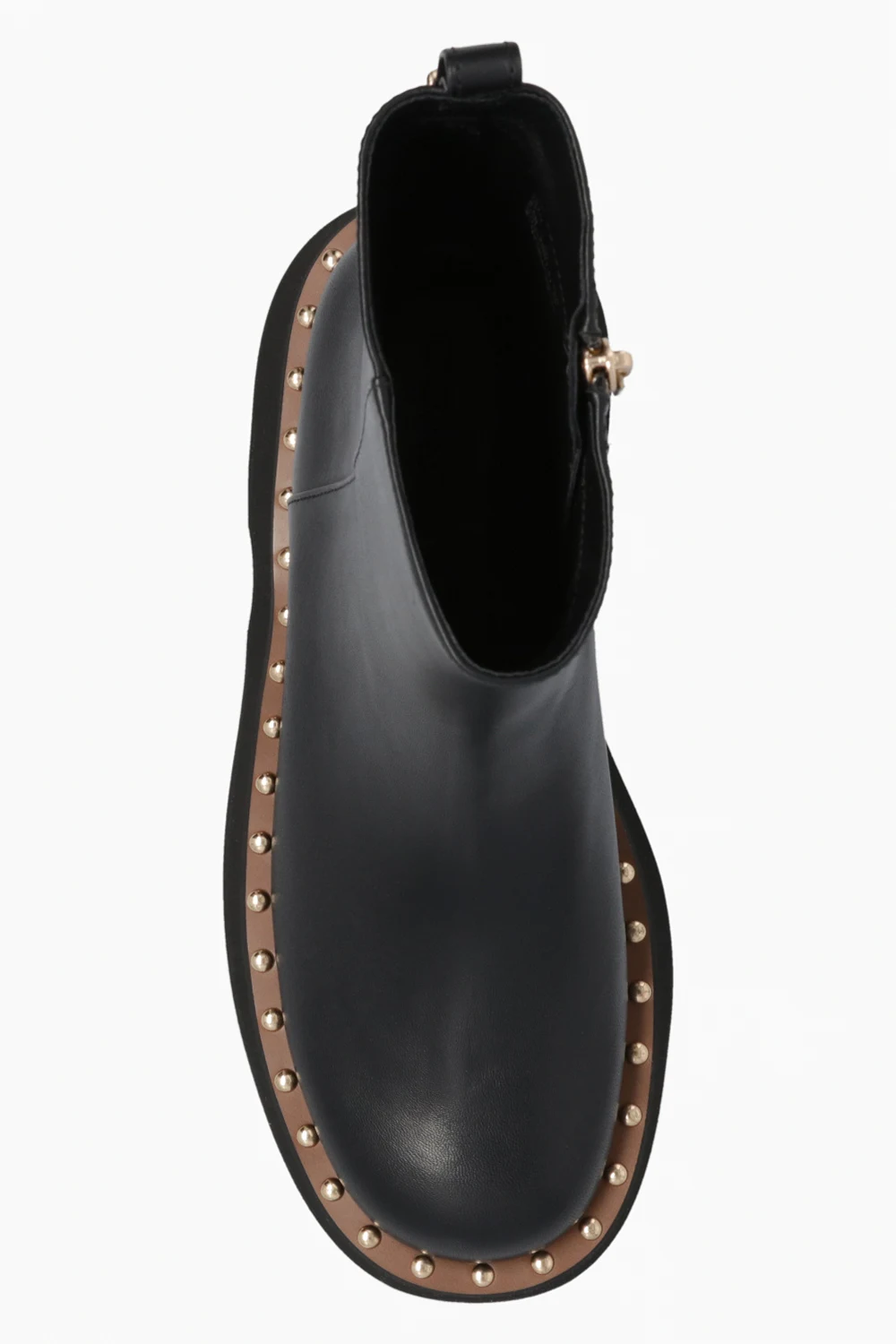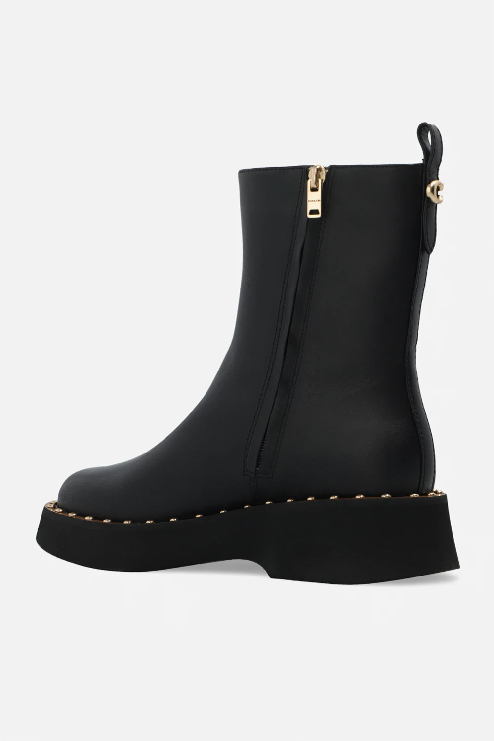Czarne botki, model ‘Vanesa’ Coach. Wykonane ze skóry. Z boku zapinane na zamek. Z tyłu ozdobione metalową aplikacją w kształcie logo. Zaokrąglony nosek. Czarno-brązowo, gumowa podeszwa wykończona metalowymi ćwiekami. Metalowe elementy w kolorze złotym.
