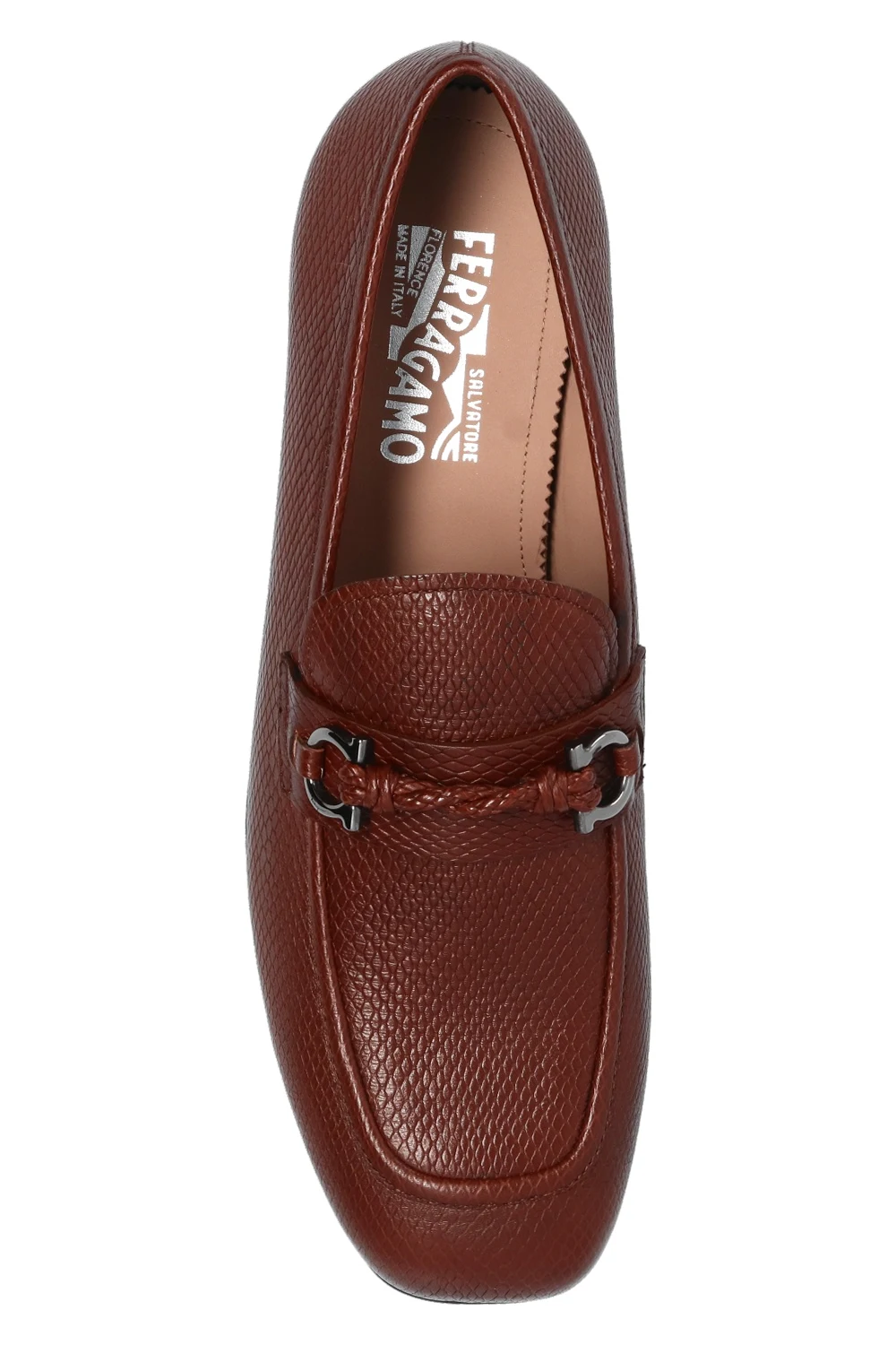 Brązowe, skórzane mokasyny, model ‘Pago’ Salvatore Ferragamo. Ozdobione wędzidłem w kolorze srebrnym. Czarna, gumowa podeszwa.