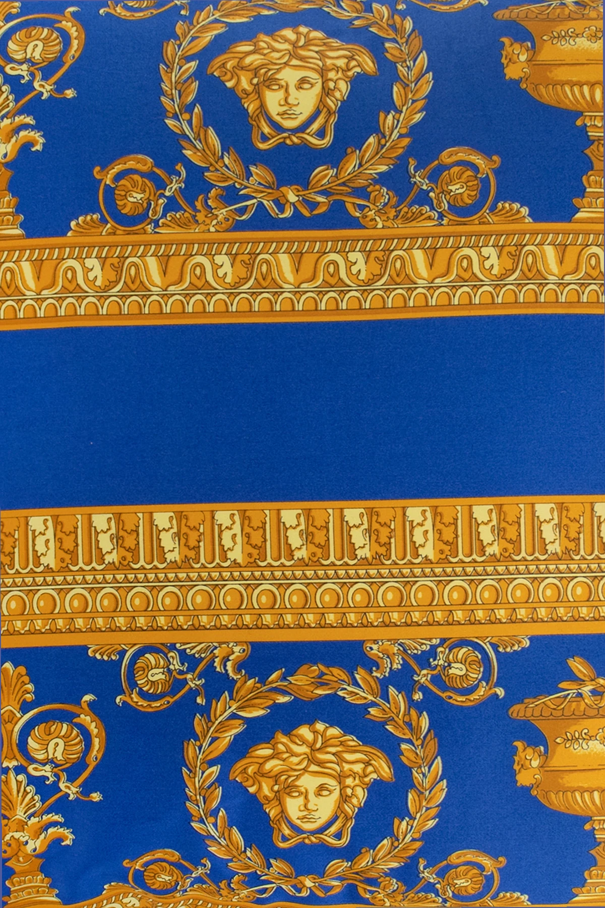 Niebiesko-czarna, bawełniana poduszka Versace Home. Poszewka zapinana na zamek. Ozdobiona żółto-brązowym, charakterystycznym wzorem 'Baroque’. Biała, bawełniana warstwa wewnętrzna wypełniona poliestrem.