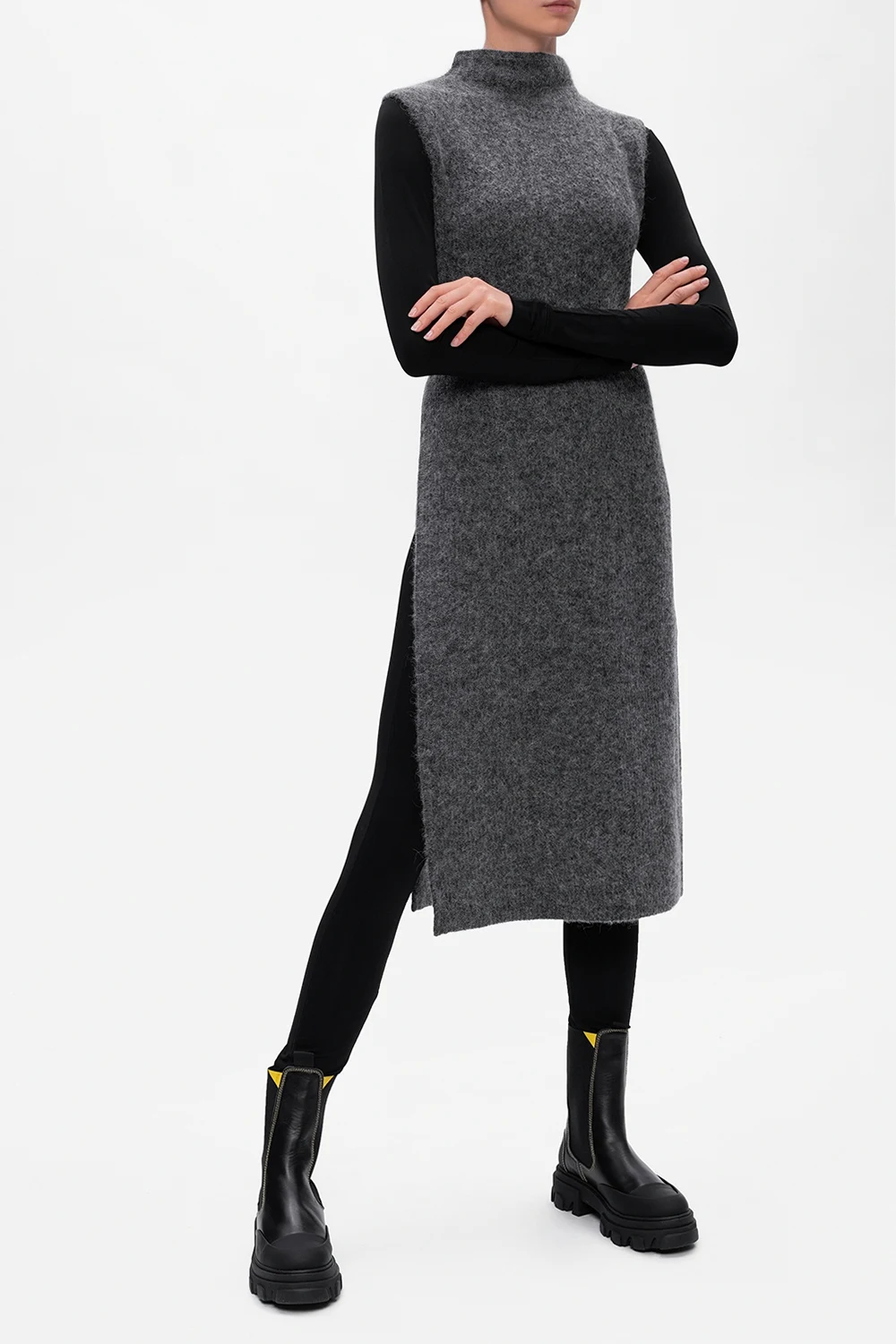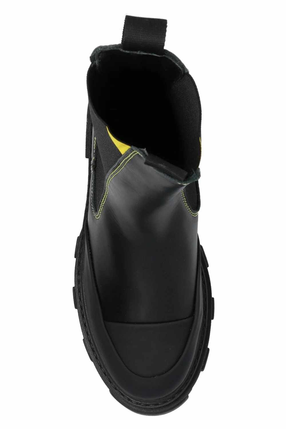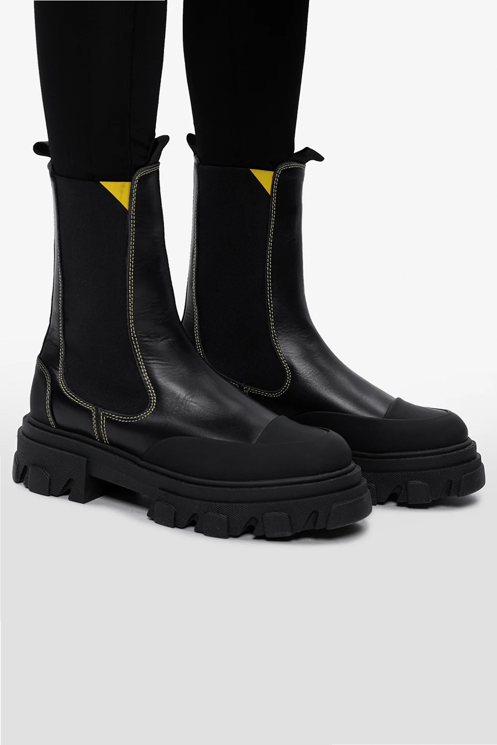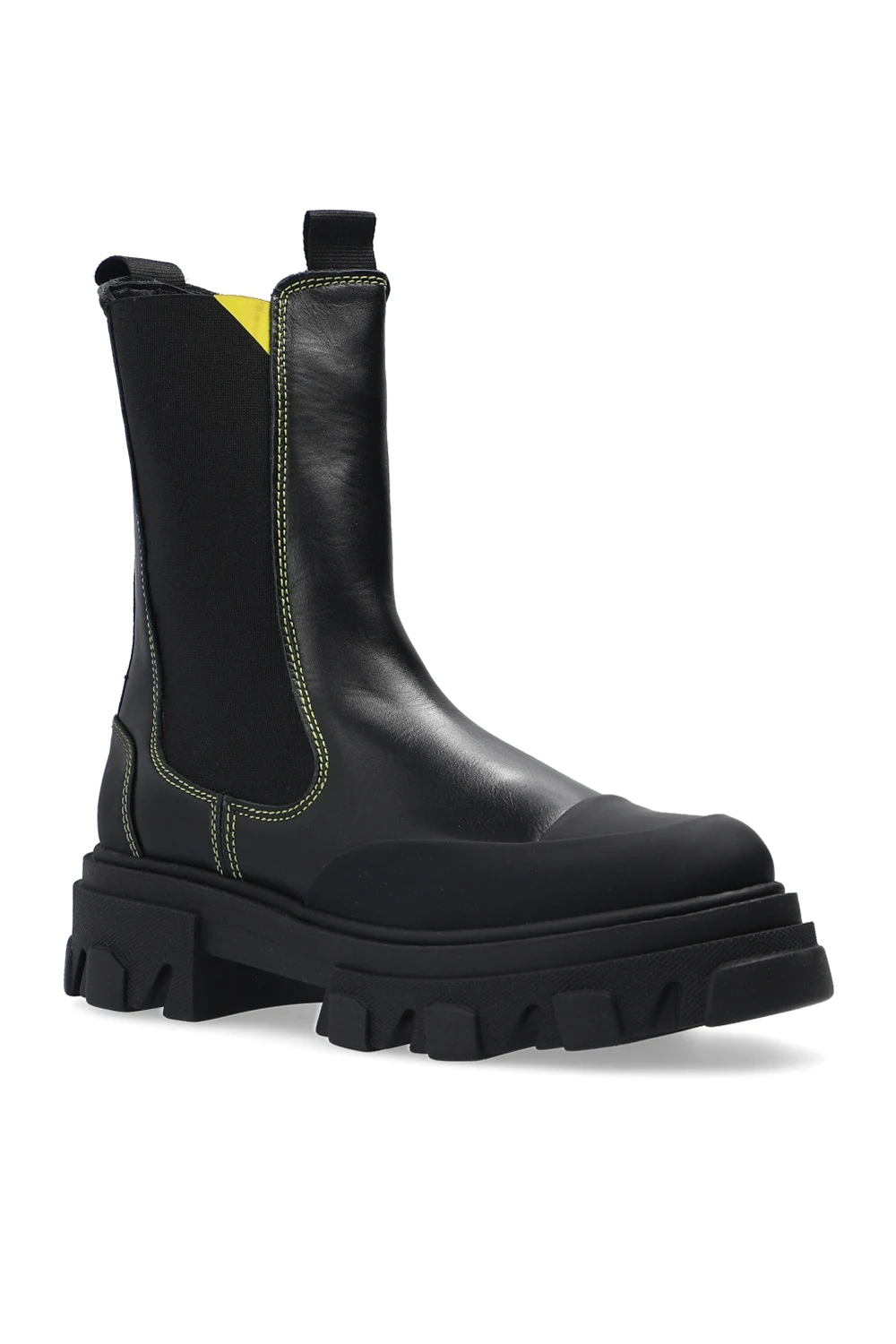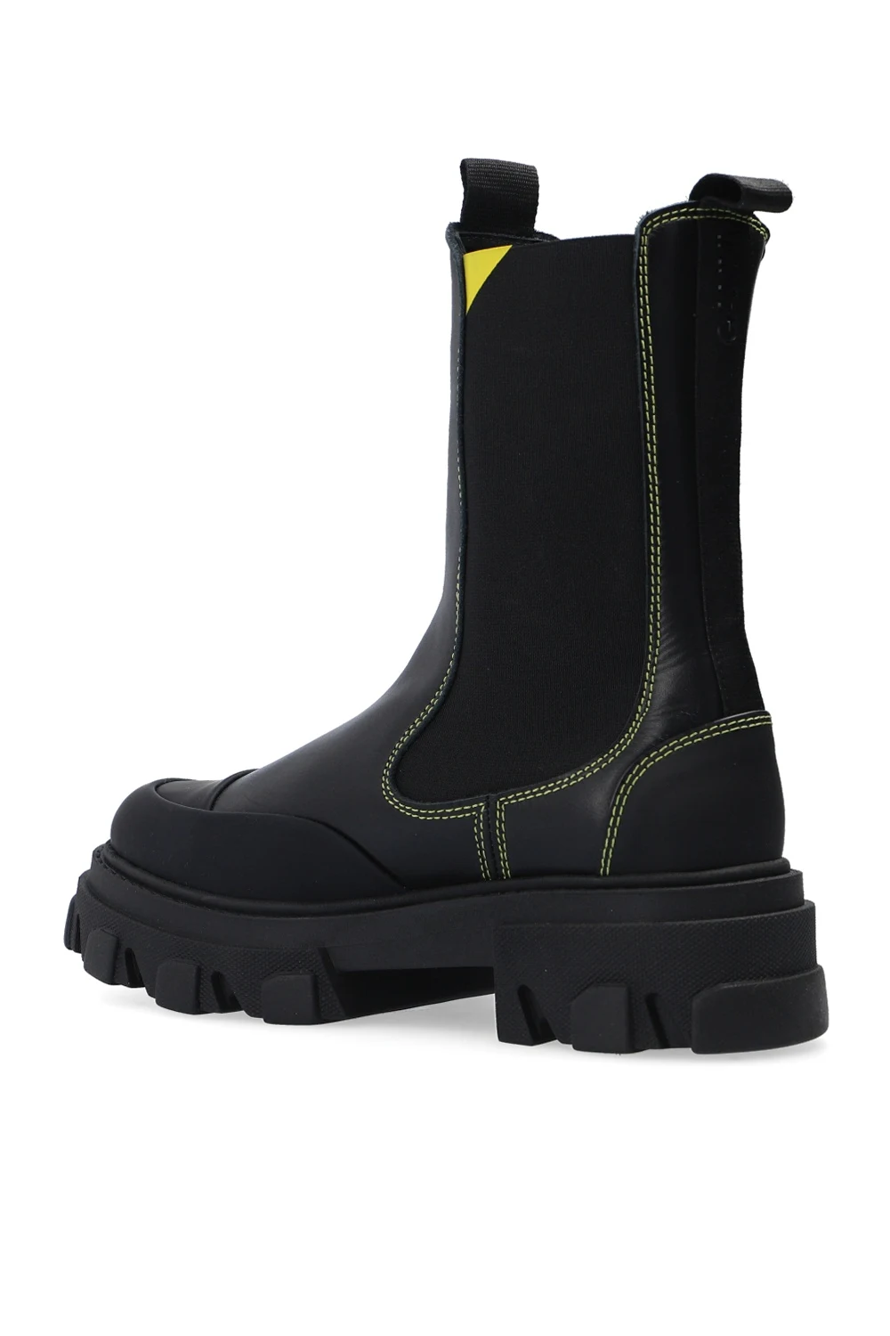 Czarne, skórzane, wsuwane botki Ganni. Wykończone gumą. Z tyłu rypsowy pasek z logo. Przeszycia w kolorze żółtym. Czarna, gumowa podeszwa.