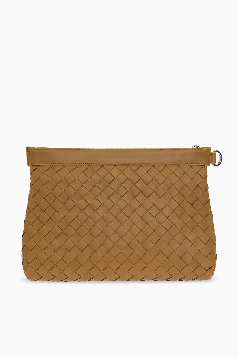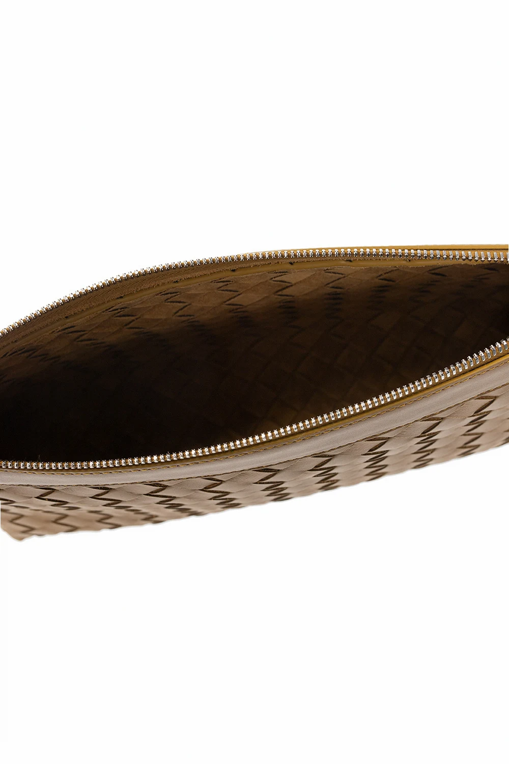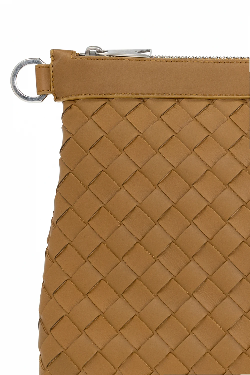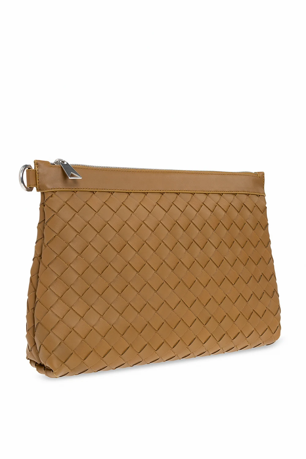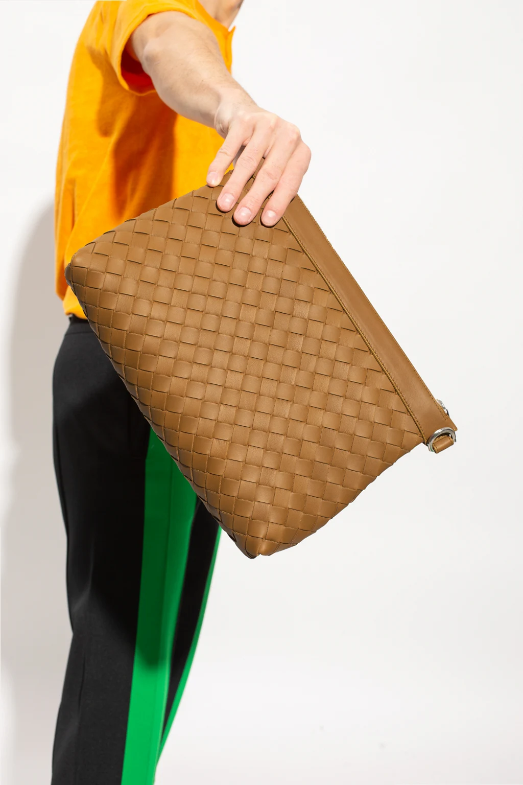 Brązowa aktówka Bottega Veneta. Wykonana z cielęcej skóry. Zamykana na zamek. Ozdobiona charakterystyczną plecionką ‘Intrecciato’. Wewnątrz komora. Metalowe elementy w kolorze srebrnym.